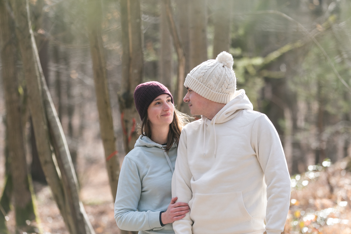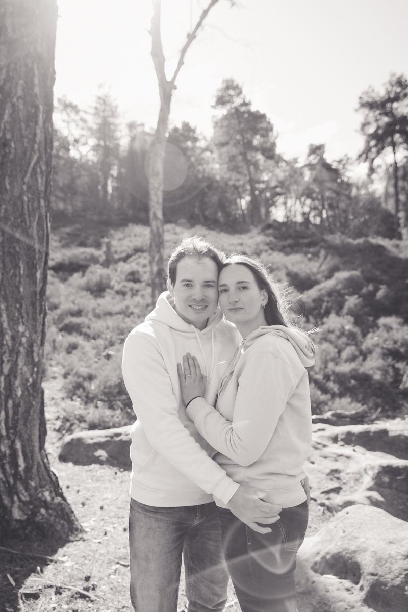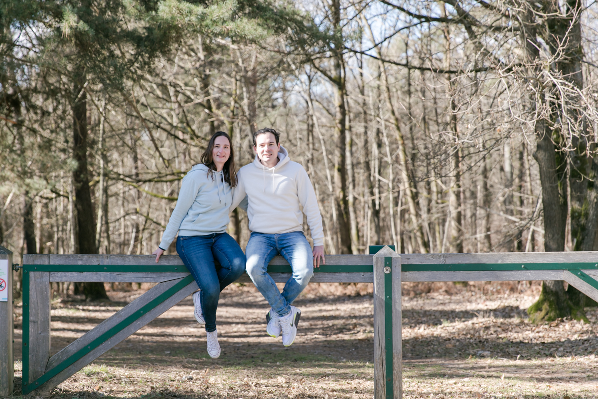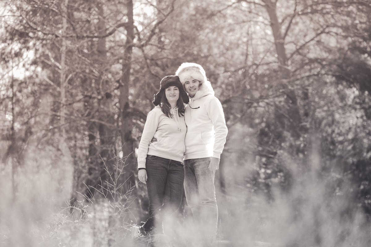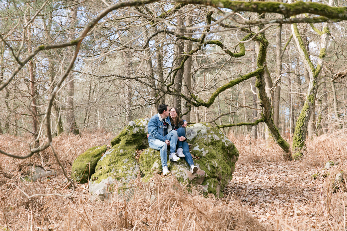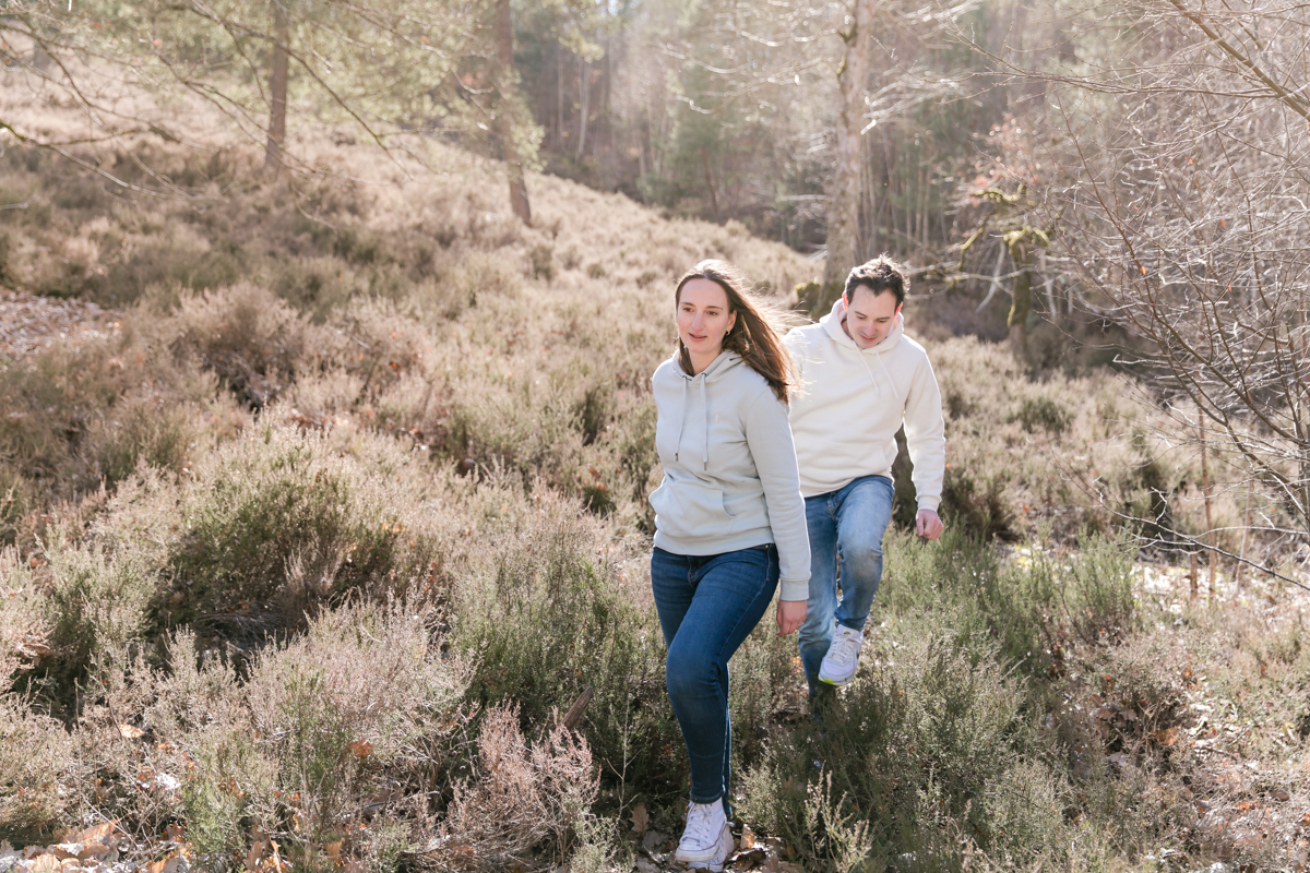 À quelques mois de leur mariage seulement, nous sous sommes donné rendez-vous dans la jolie forêt de La Roche Turpin pour une chouette balade à travers les fougères et la bruyère, dont les couleurs réchauffaient le paysage. Très rapidement la confiance s’est installée, leur spontanéité et espièglerie malgré le grand froid ont fait le reste!