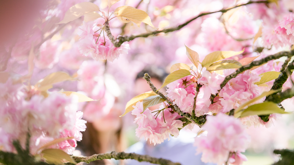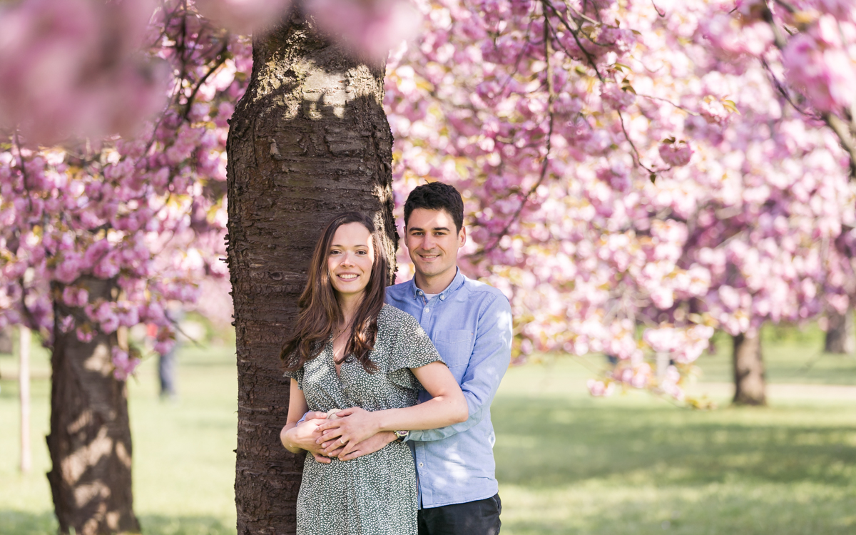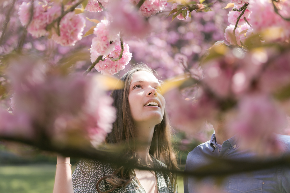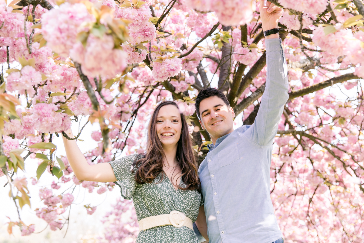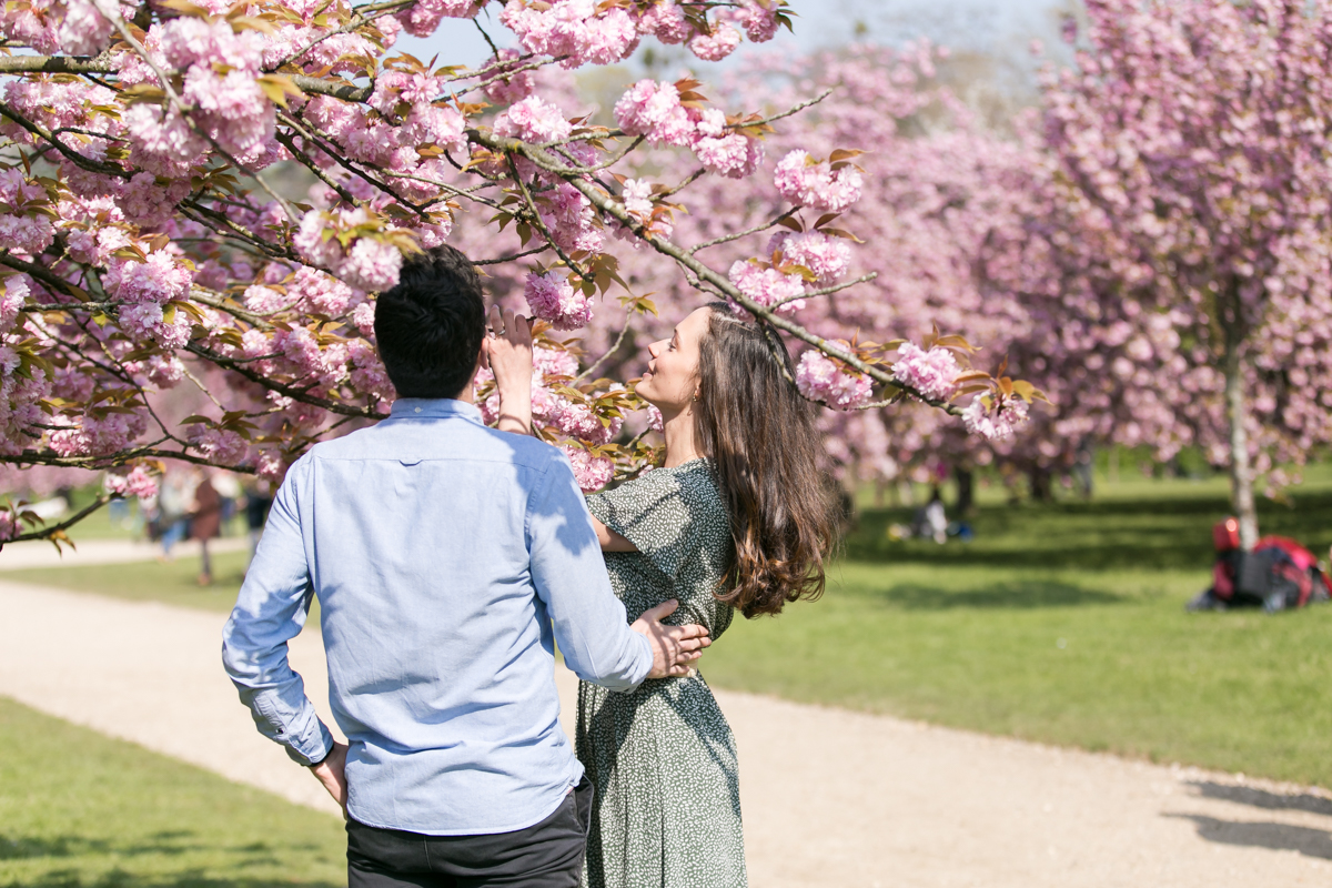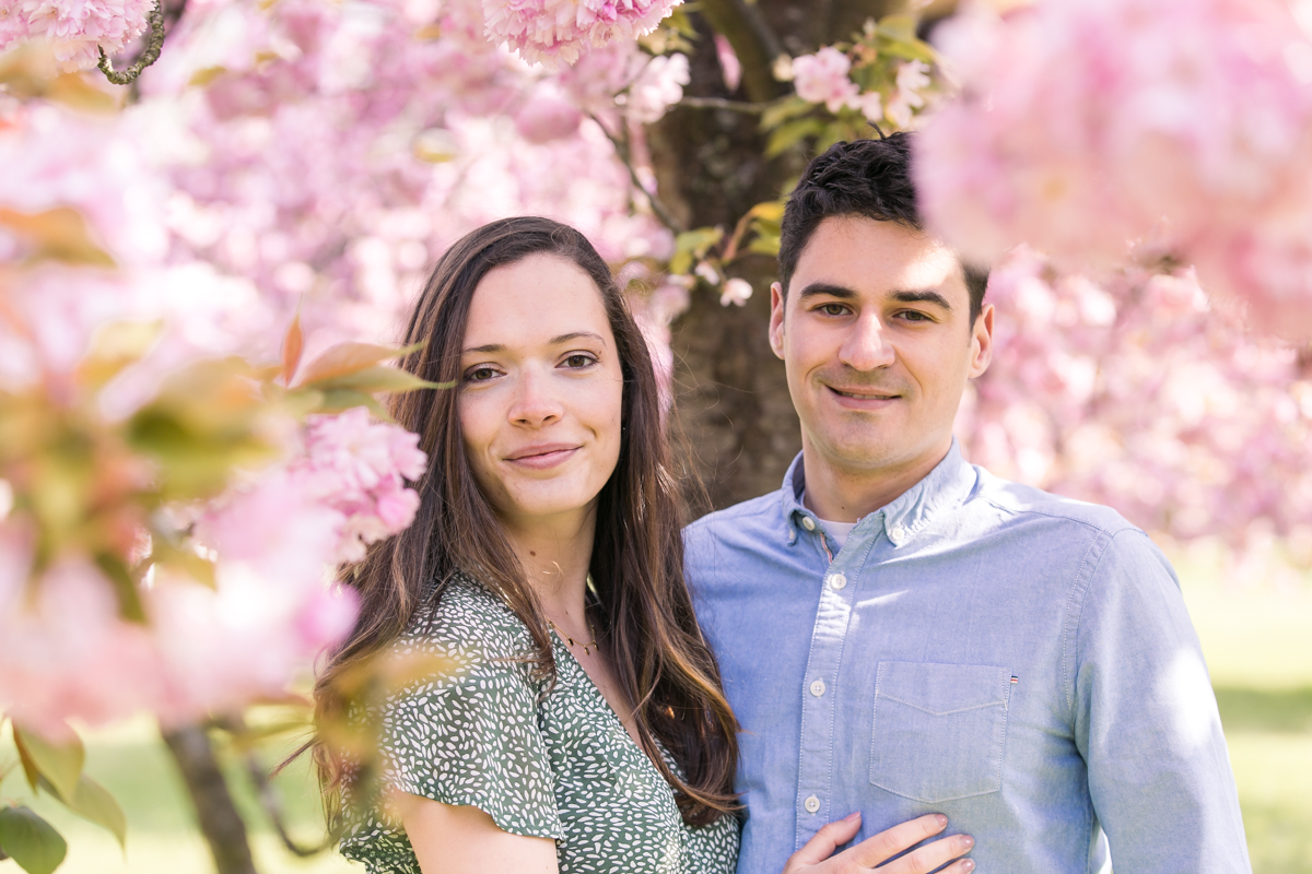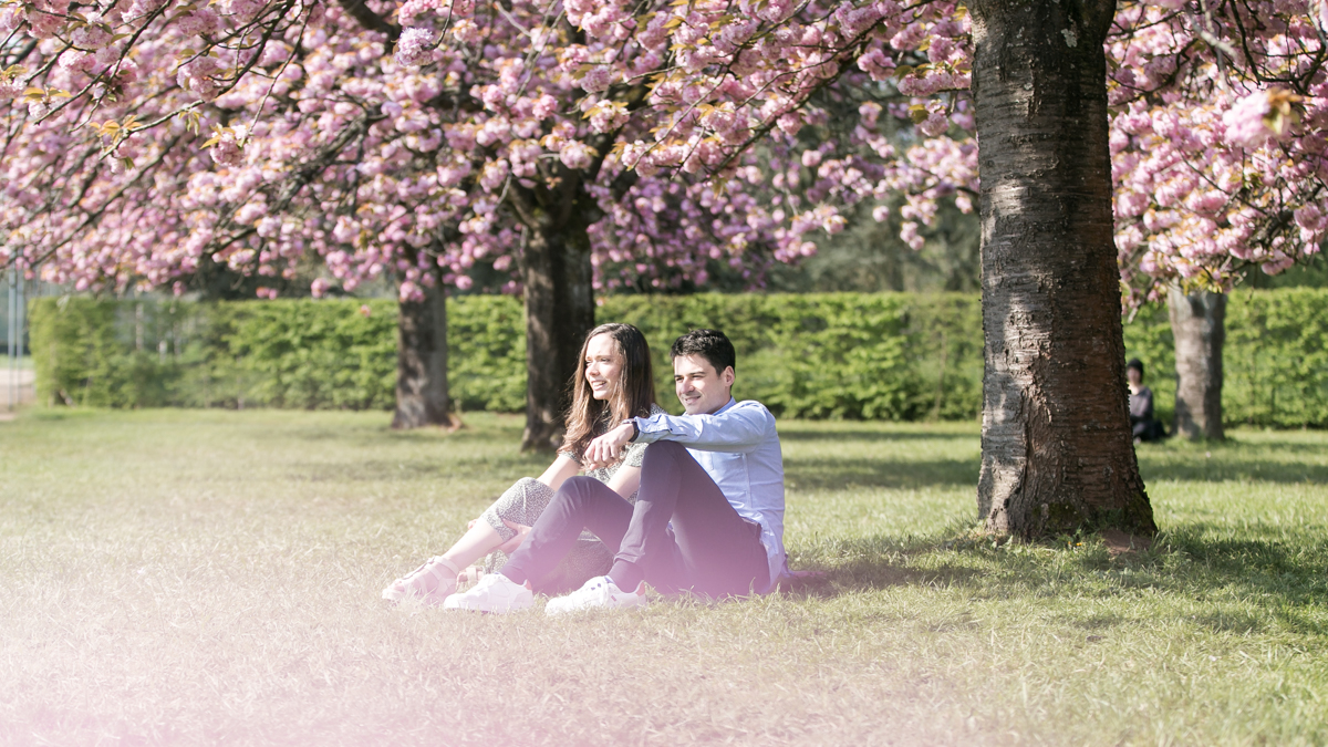 Chaque année la floraison des cerisiers attire des milliers de curieux vers le Parc de Sceaux, où les bosquets accueillent le plus grand rassemblement asiatique en l’honneur du Hanami. Le décor pour cette séance de couple était donc tout trouvé, encore fallait-il attendre le moment où les cerisiers étaient tous en fleurs, la foule du weekend partie, et le soleil de sortie! Nous nous sommes donc retrouvés un jour de semaine par une matinée ensoleillée mais terriblement fraîche à cause du vent. Cela n’a nullement découragé mes futurs mariés, qui se sont prêtés avec grâce et tout en sourires à cette chouette séance.