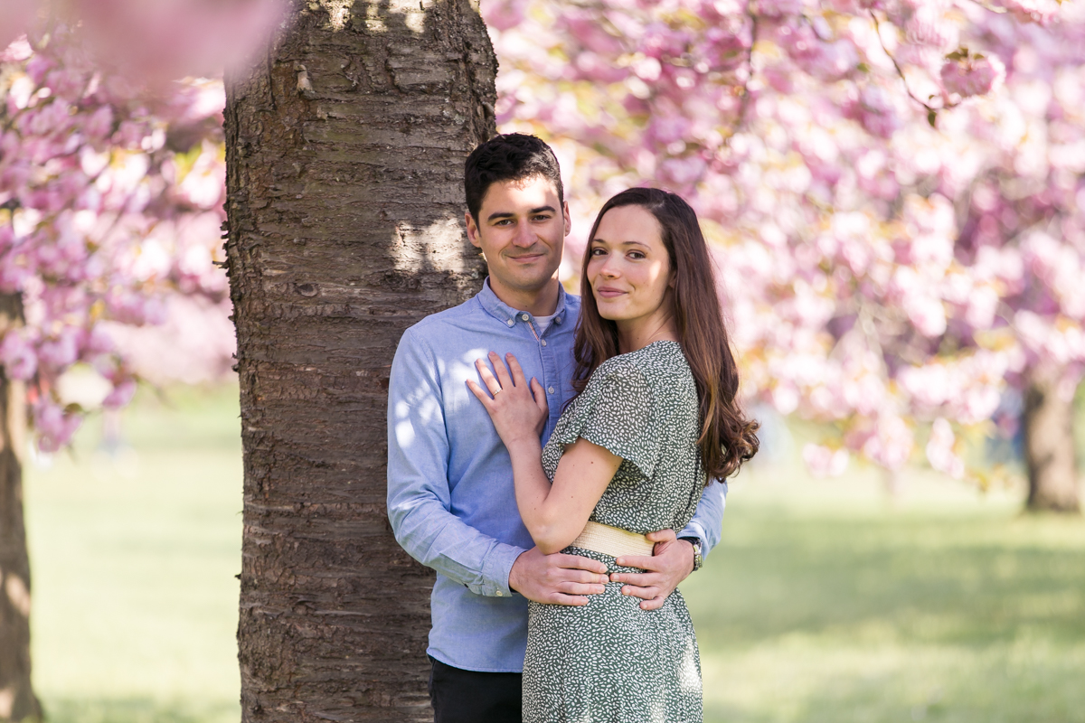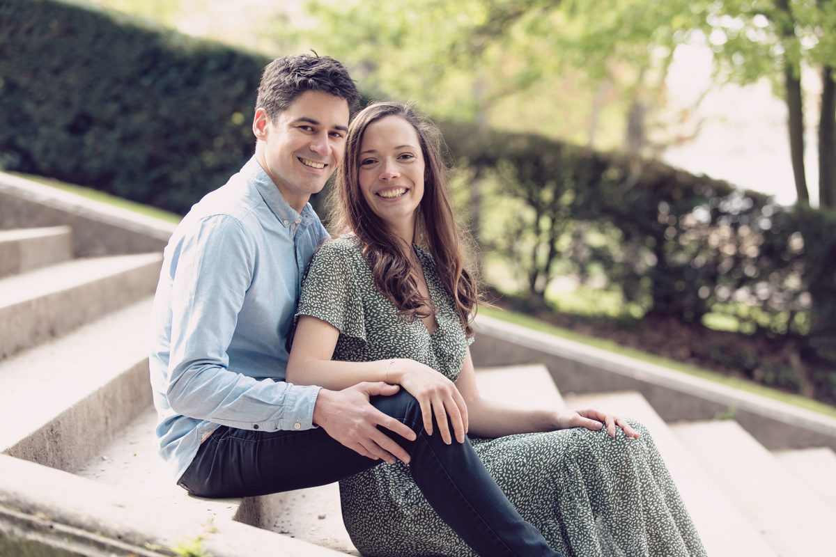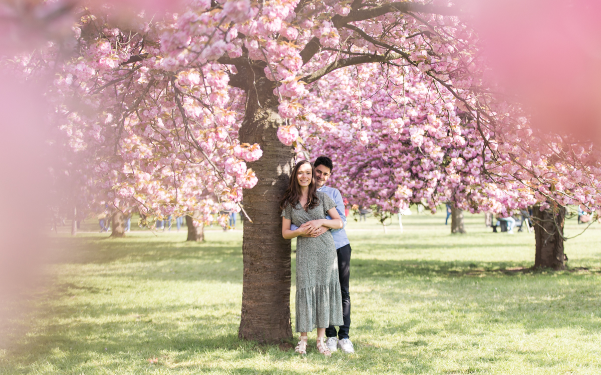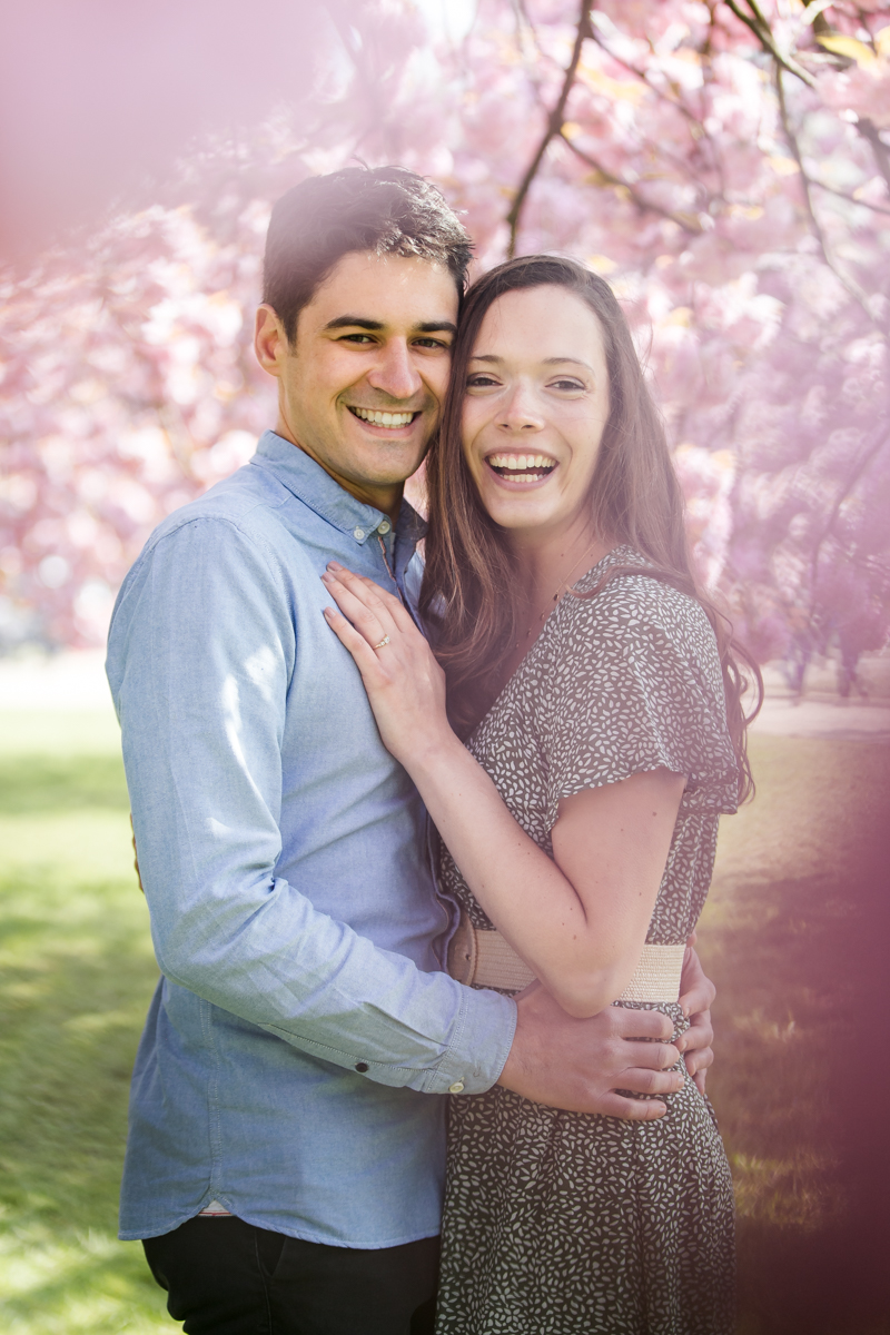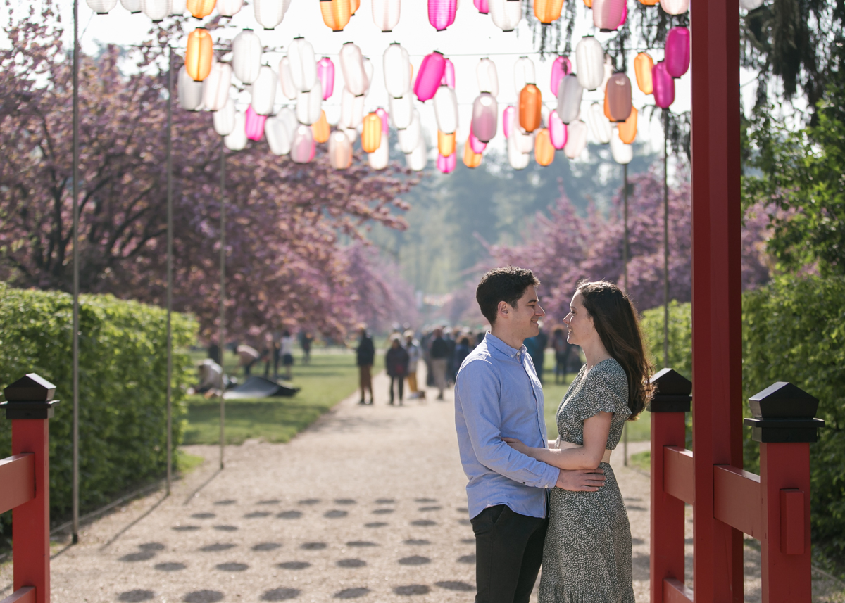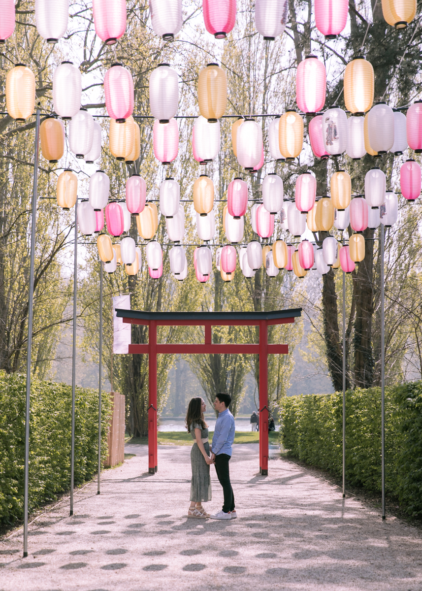 Chaque année la floraison des cerisiers attire des milliers de curieux vers le Parc de Sceaux, où les bosquets accueillent le plus grand rassemblement asiatique en l’honneur du Hanami. Le décor pour cette séance de couple était donc tout trouvé, encore fallait-il attendre le moment où les cerisiers étaient tous en fleurs, la foule du weekend partie, et le soleil de sortie! Nous nous sommes donc retrouvés un jour de semaine par une matinée ensoleillée mais terriblement fraîche à cause du vent. Cela n’a nullement découragé mes futurs mariés, qui se sont prêtés avec grâce et tout en sourires à cette chouette séance.