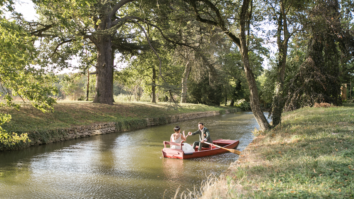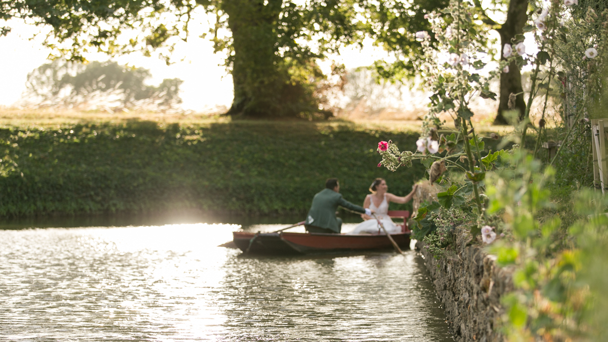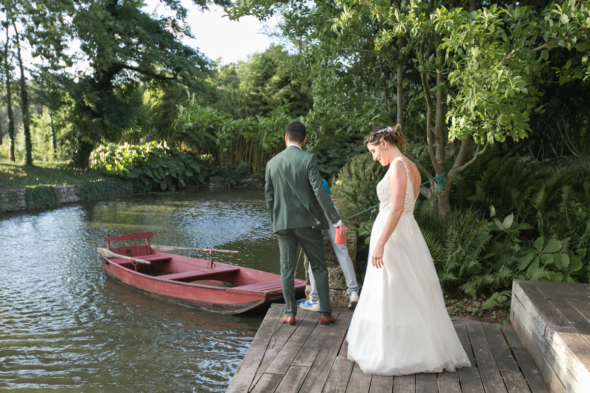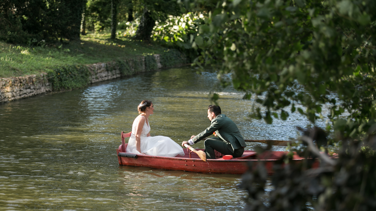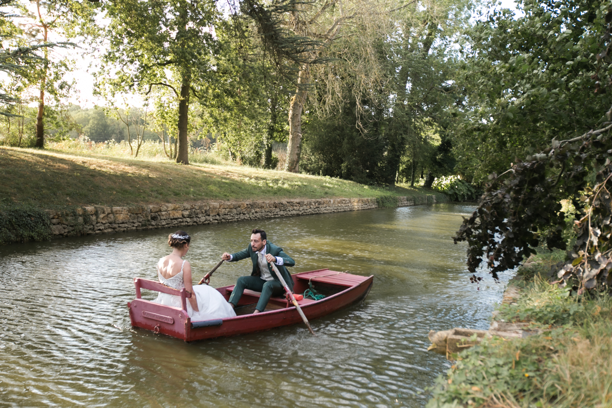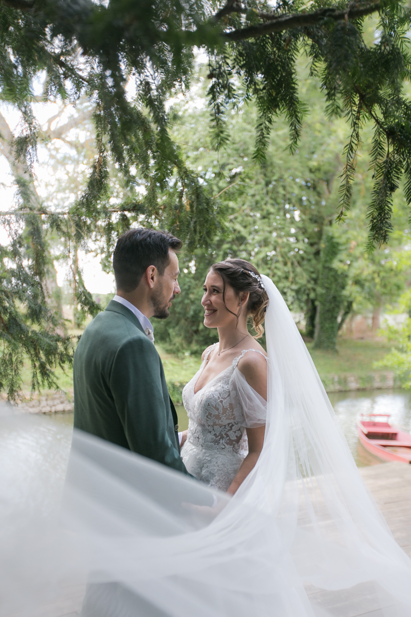 Vive le vent, vive le vent… qui chasse les nuages et la pluie pour faire place à un beau ciel bleu, et qui joue avec le joli voile de la mariée juste au moment des photos de couple, me permettant de faire de chouettes photos! La journée avait commencé plutôt grise et humide à l’église de Combs la Ville avec la cérémonie de mariage, où les enfants d’honneur, absolument craquants dans leur belles tenues, m’ont beaucoup amusée avec leurs pitreries. La suite des festivités s’est déroulée sous le soleil et dans la bonne humeur au Domaine de Quincampoix. Et pour clore cette mémorable journée les mariés ont fait leur entrée dans la jolie barque rouge devant leurs invités réjouis, éclairés par les derniers rayons de soleil – un moment magique toujours!
