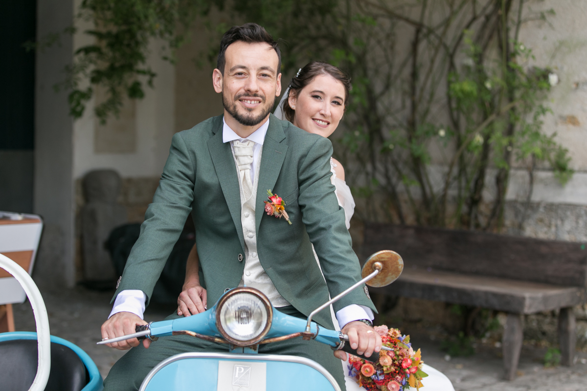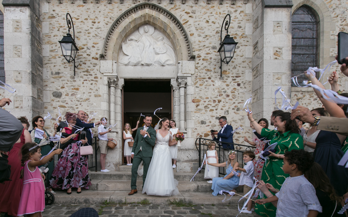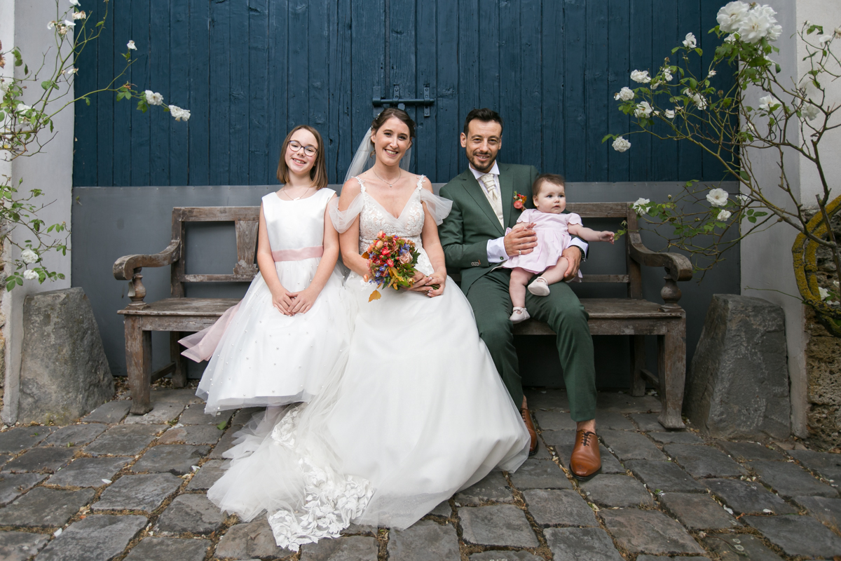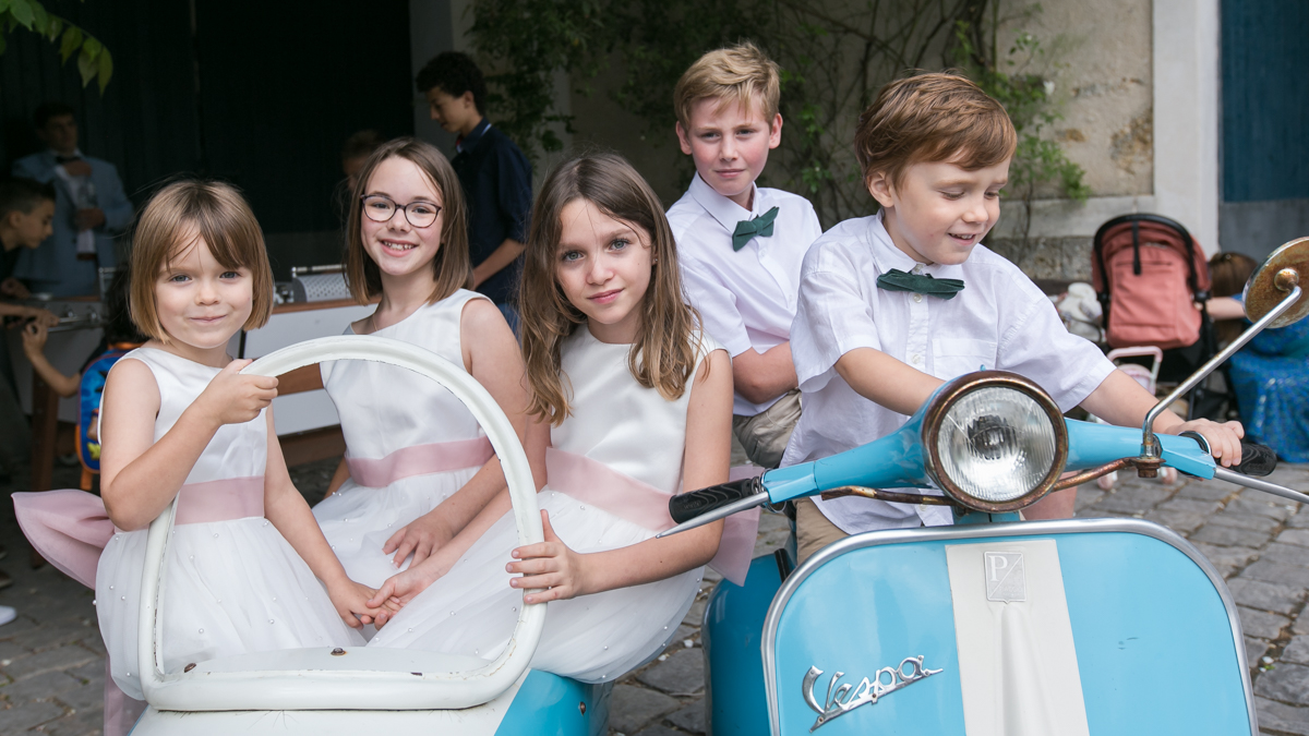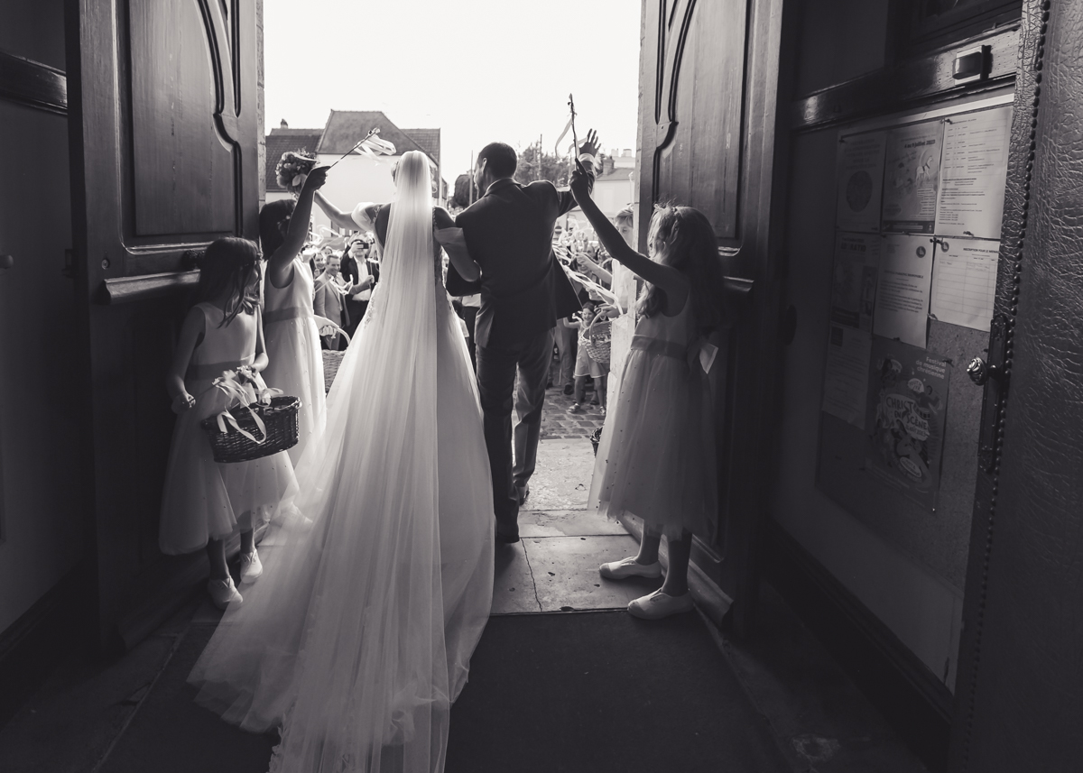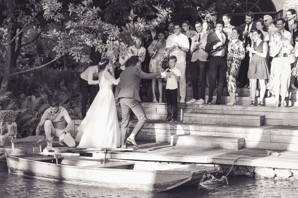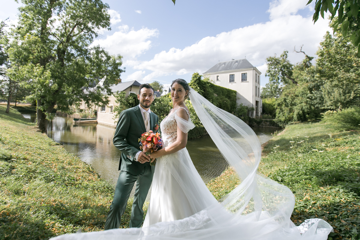 Vive le vent, vive le vent… qui chasse les nuages et la pluie pour faire place à un beau ciel bleu, et qui joue avec le joli voile de la mariée juste au moment des photos de couple, me permettant de faire de chouettes photos! La journée avait commencé plutôt grise et humide à l’église de Combs la Ville avec la cérémonie de mariage, où les enfants d’honneur, absolument craquants dans leur belles tenues, m’ont beaucoup amusée avec leurs pitreries. La suite des festivités s’est déroulée sous le soleil et dans la bonne humeur au Domaine de Quincampoix. Et pour clore cette mémorable journée les mariés ont fait leur entrée dans la jolie barque rouge devant leurs invités réjouis, éclairés par les derniers rayons de soleil – un moment magique toujours!