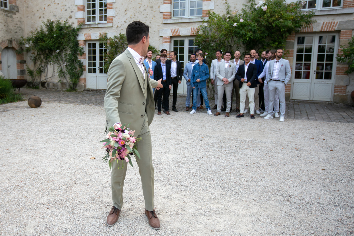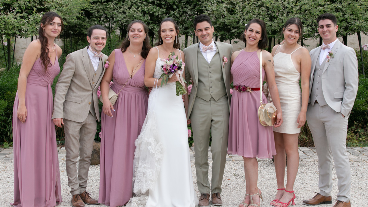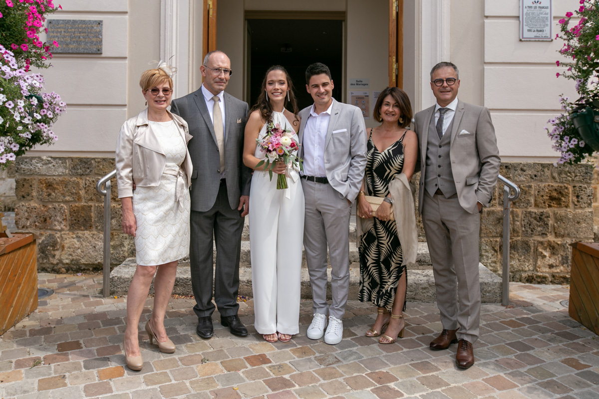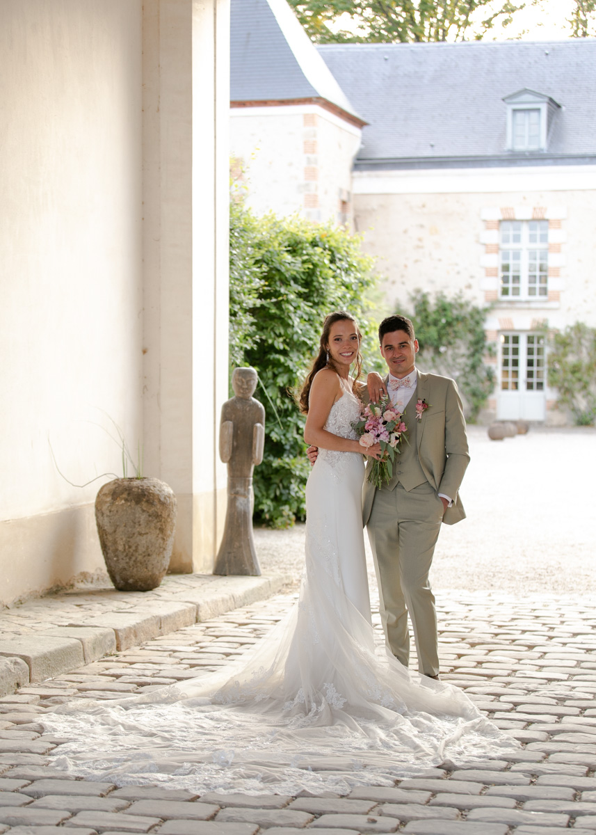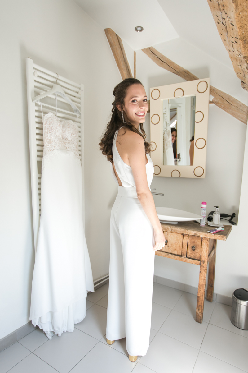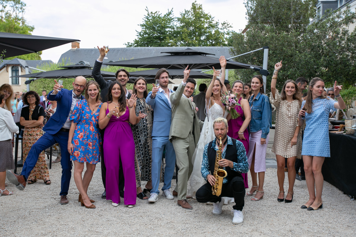 Combinaison blanche: Septem – Chaussures de mariée: Floredeasoka, Paris – Alliances: Robe de mariée Pronovias chez Confidence Mariage (Boulogne Billancourt)- Coiffeuse: Valérie Burg- Maquilleuse: Eva Gelly – Costume gris: Issac – Costume vert sur mesure: Samson – Chaussures marié: Pierre Cardin – Fleurs: Le Fleuriste du Coin – Saxophoniste: Eric Saxe – Papeterie: faireparterie.fr – Marque-places: Lilas.etc – lilasetc.fr – Pistolets à bulles: Amazon – Traiteur: Fantaisy Traiteur – DJ Marko – Lieu de réception: Domaine de Quincampoix