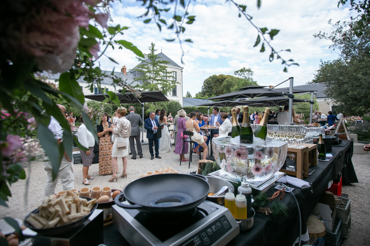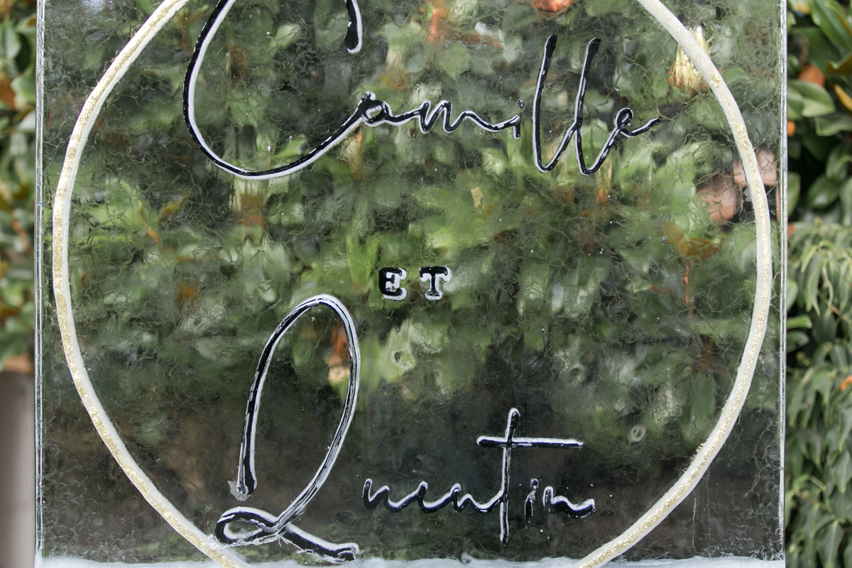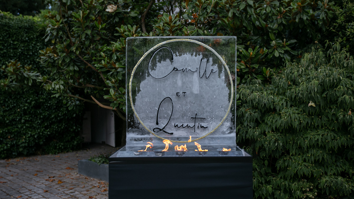 Après la mairie les mariés se sont changés pour la cérémonie laïque, conduite par l’oncle de Quentin, et égayée par des témoins en pleine forme. Ensuite une ambiance musicale lounge, soignée par le saxophoniste et flûtiste Eric Sax, attendait les invités au vin d’honneur, où les superbes sculptures de glace façonnées par un ami attiraient tous les regards.