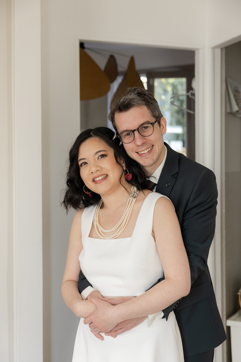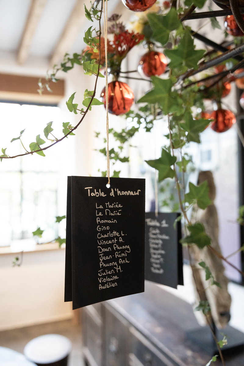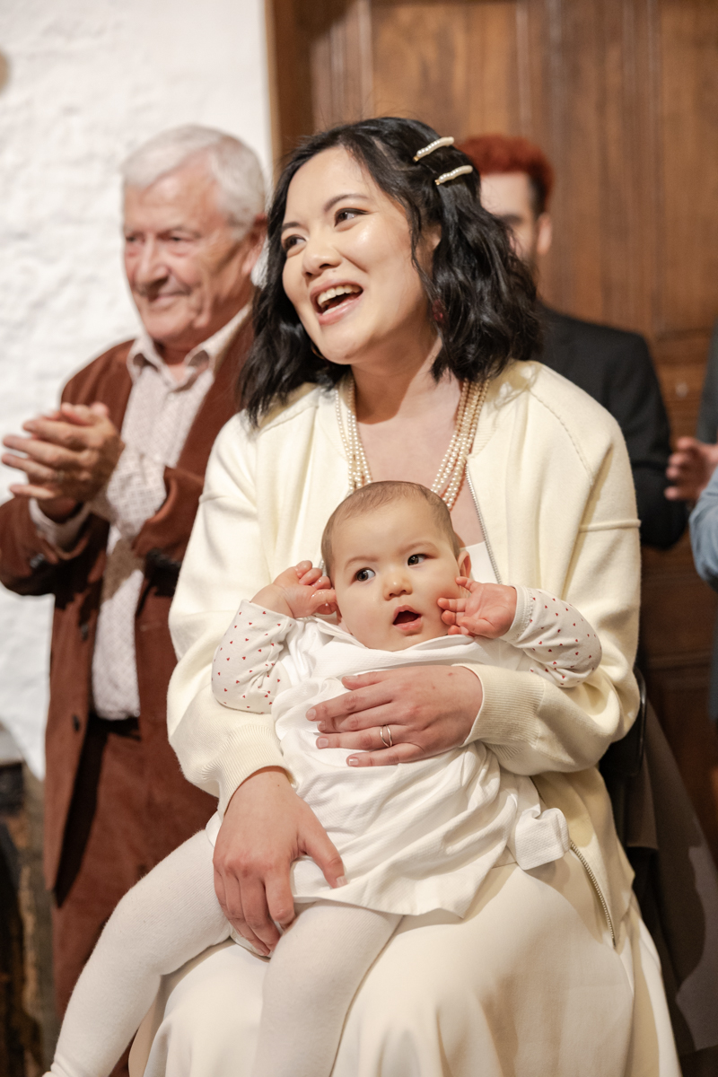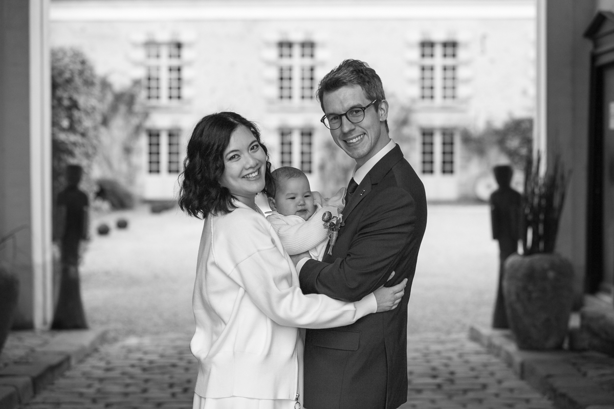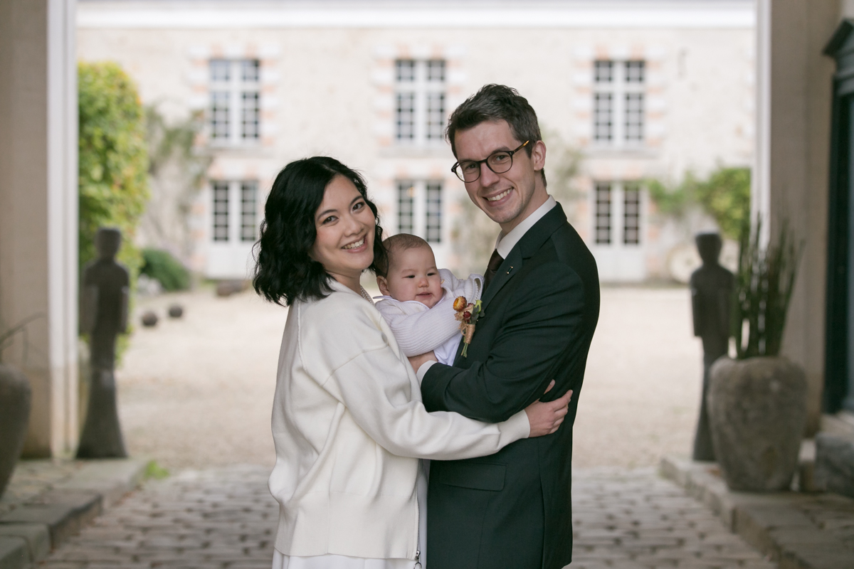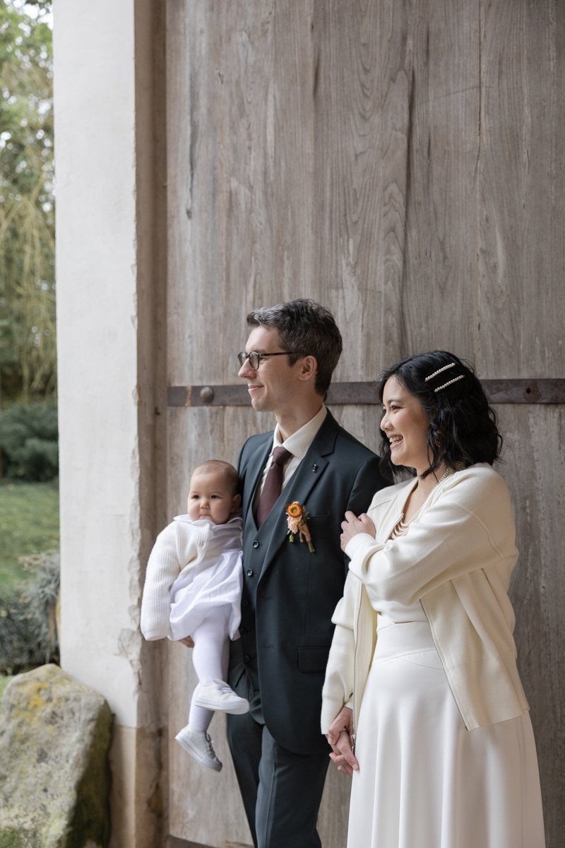 Kim-Mai et Sébastien ont retrouvé leurs nombreux amis à la mairie de Cachan, à quelques pas à peine de leur domicile, à l’occasion de leur mariage civil, avant de continuer les festivités au Domaine de Quincampoix. Kim-Mai portait un ensemble en crêpe fermé par des boutons en nacre, qui faisaient écho au superbe collier de famille, composé de plusieurs rangs de perles retenus par un magnifique boucle en forme de fleur. Leur petite fille arborait une tenue blanche également pour l’occasion. Pendant la réception et le dîner les animations se sont succédé au grand plaisir des invités, qui se sont ensuite déchainés sur la piste de danse!
