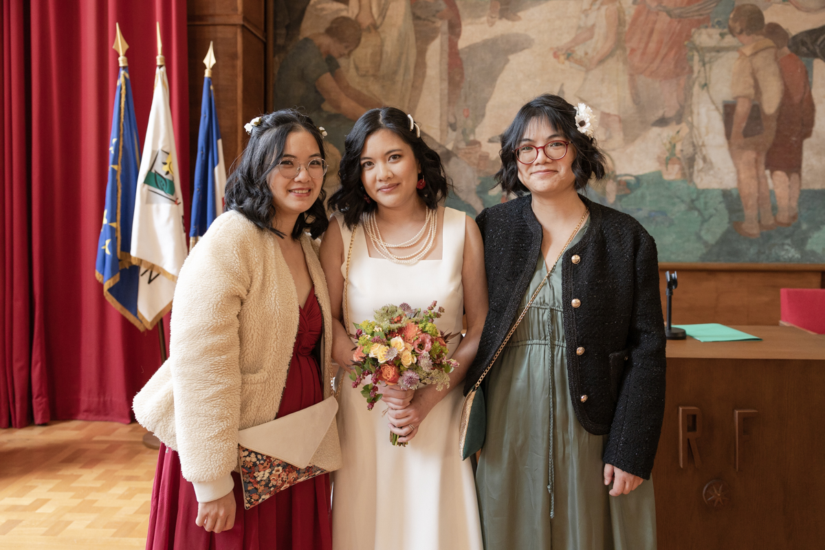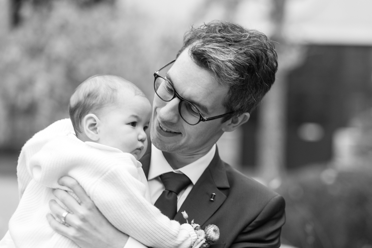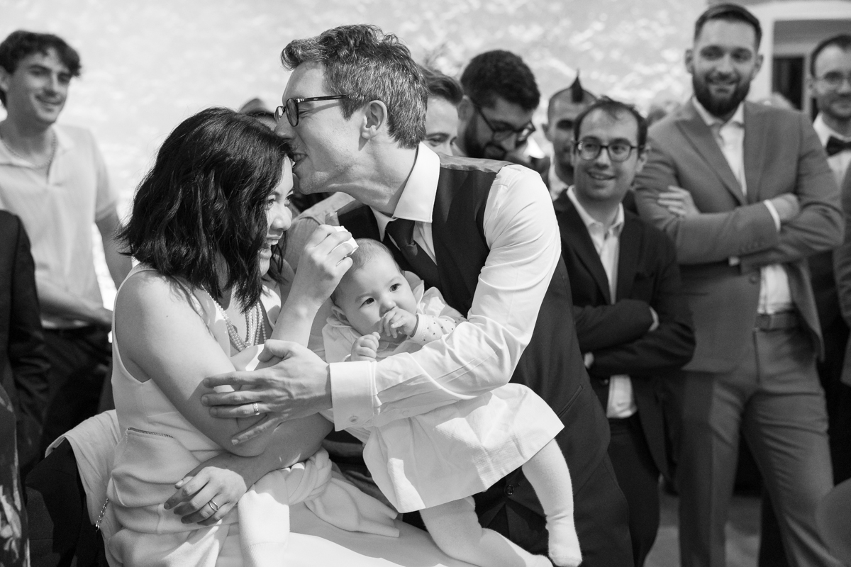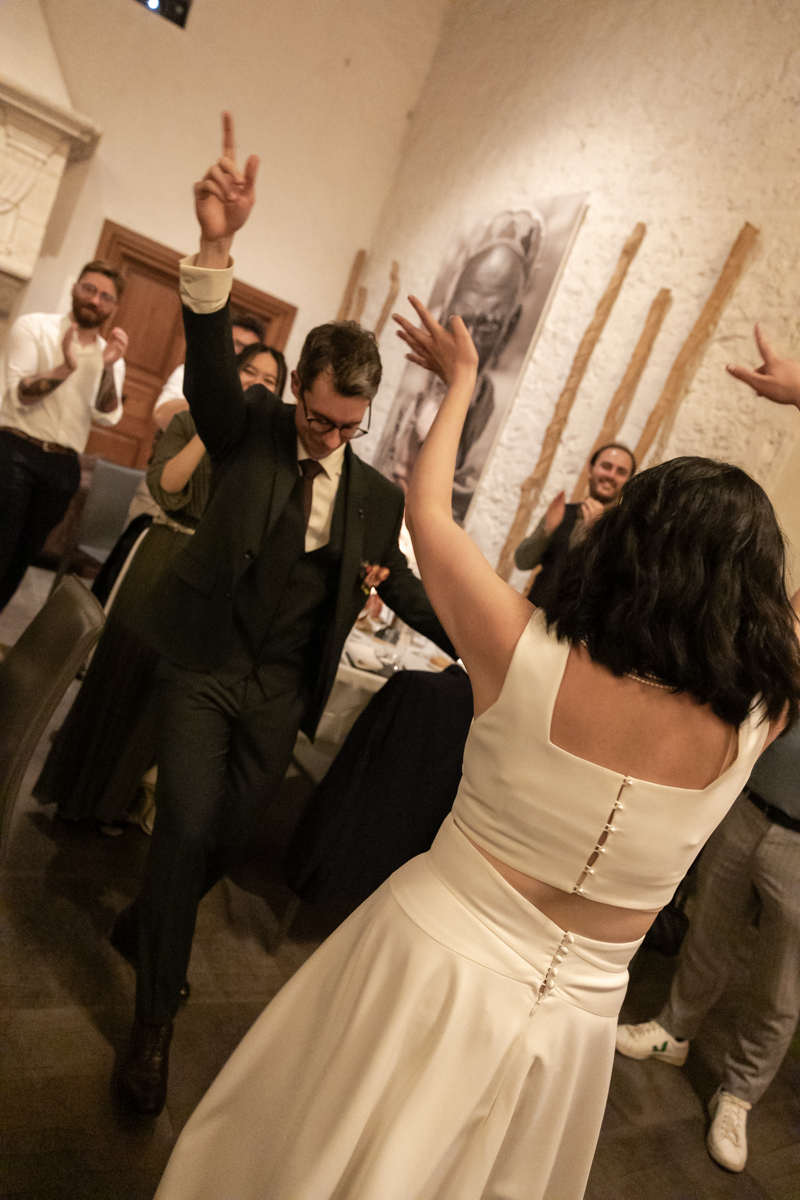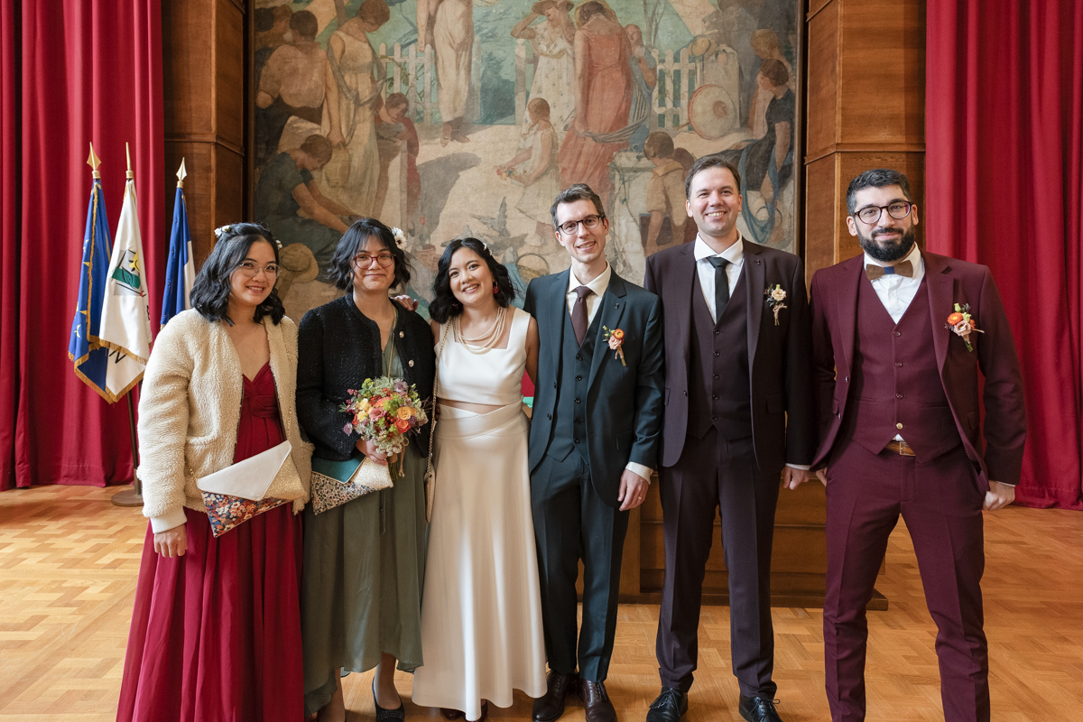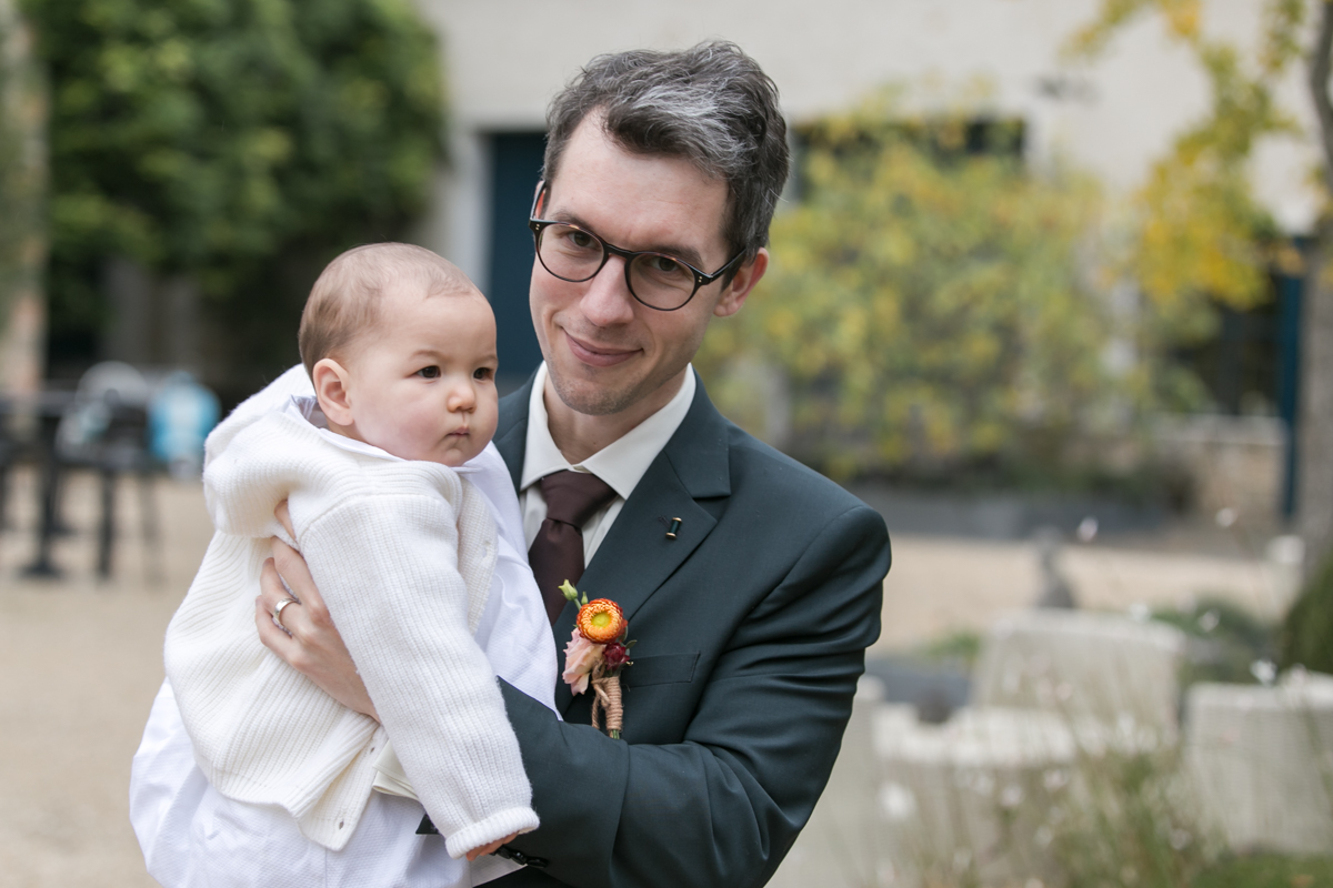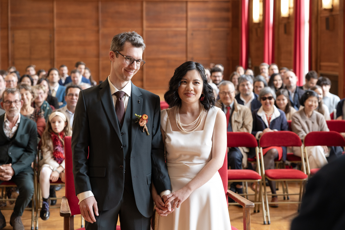 Kim-Mai et Sébastien ont retrouvé leurs nombreux amis à la mairie de Cachan, à quelques pas à peine de leur domicile, à l’occasion de leur mariage civil, avant de continuer les festivités au Domaine de Quincampoix. Kim-Mai portait un ensemble en crêpe fermé par des boutons en nacre, qui faisaient écho au superbe collier de famille, composé de plusieurs rangs de perles retenus par un magnifique boucle en forme de fleur. Leur petite fille arborait une tenue blanche également pour l’occasion. Pendant la réception et le dîner les animations se sont succédé au grand plaisir des invités, qui se sont ensuite déchainés sur la piste de danse!