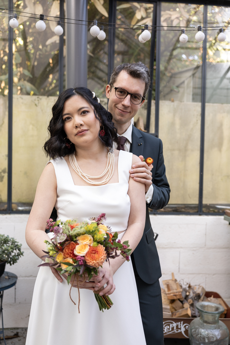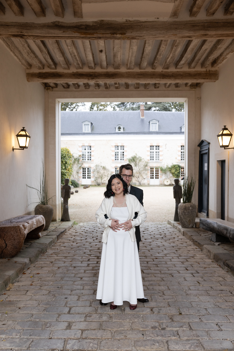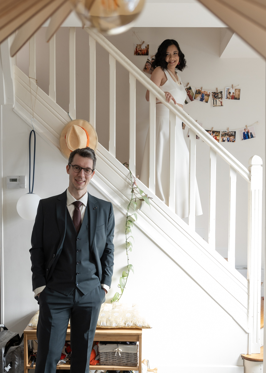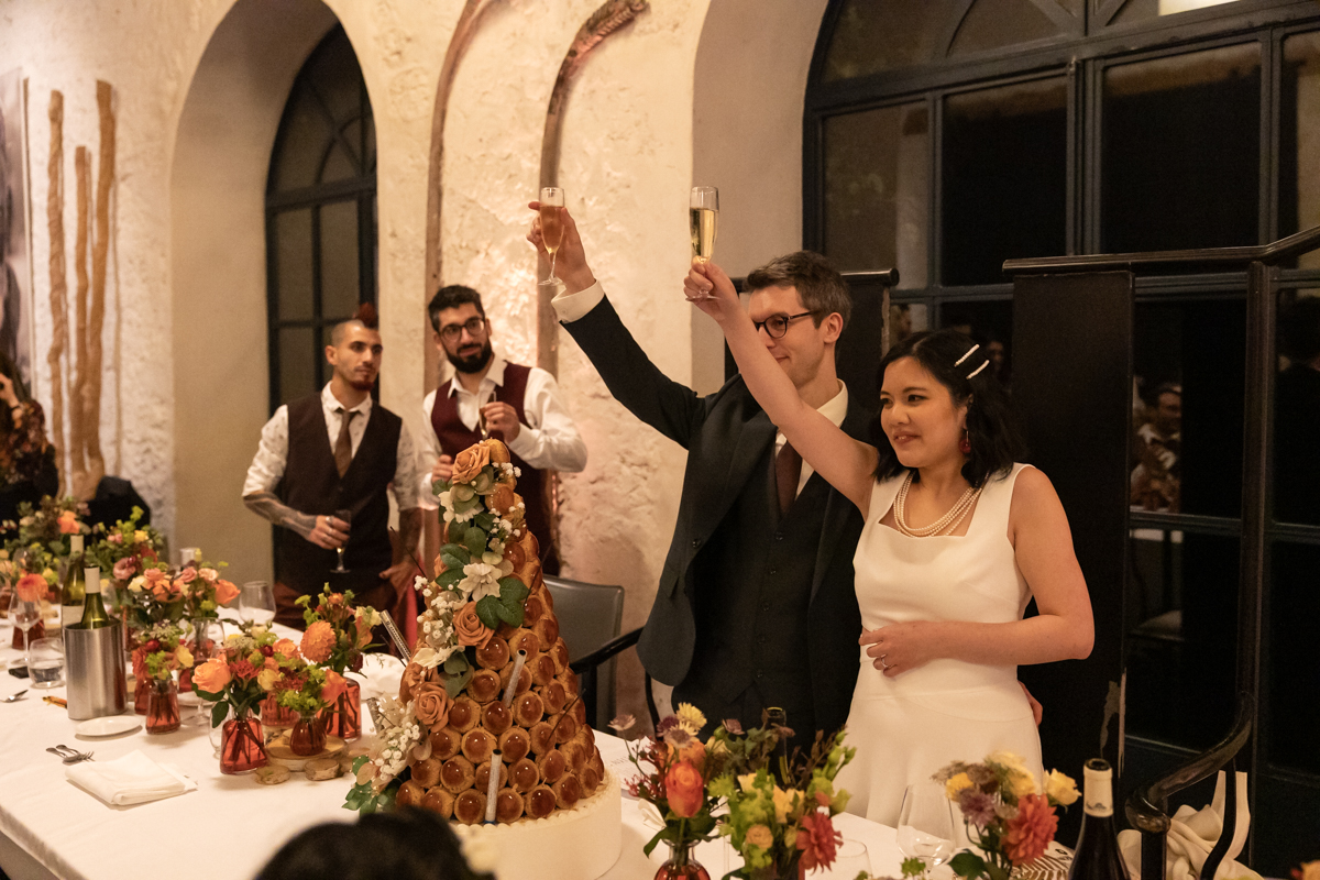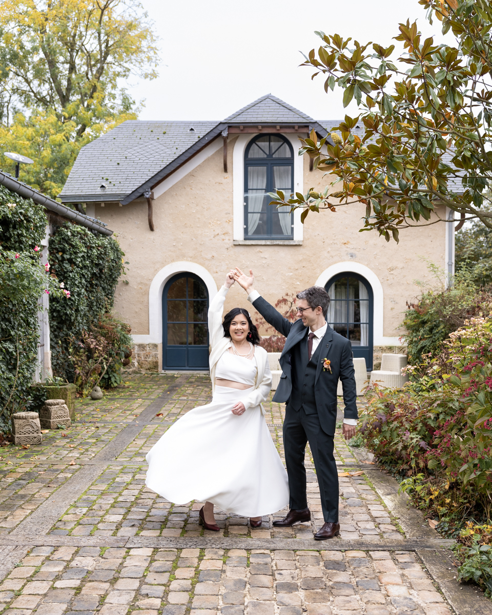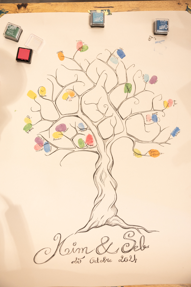 Kim-Mai et Sébastien ont retrouvé leurs nombreux amis à la mairie de Cachan, à quelques pas à peine de leur domicile, à l’occasion de leur mariage civil, avant de continuer les festivités au Domaine de Quincampoix. Kim-Mai portait un ensemble en crêpe fermé par des boutons en nacre, qui faisaient écho au superbe collier de famille, composé de plusieurs rangs de perles retenus par un magnifique boucle en forme de fleur. Leur petite fille arborait une tenue blanche également pour l’occasion. Pendant la réception et le dîner les animations se sont succédé au grand plaisir des invités, qui se sont ensuite déchainés sur la piste de danse!