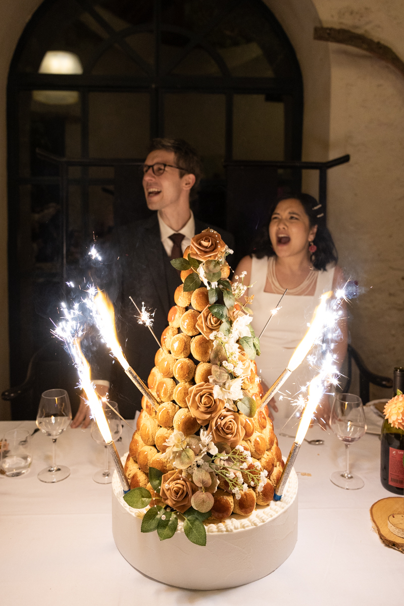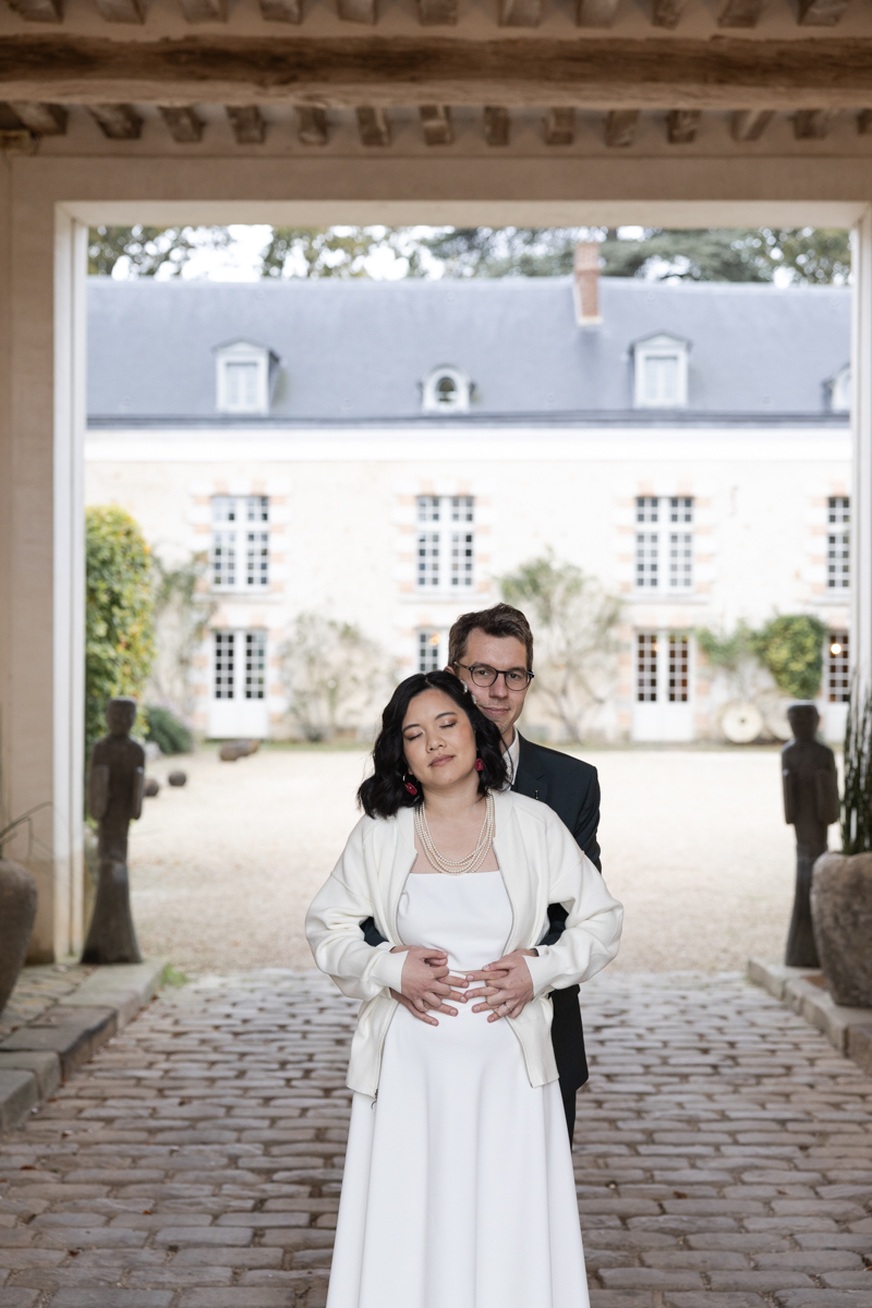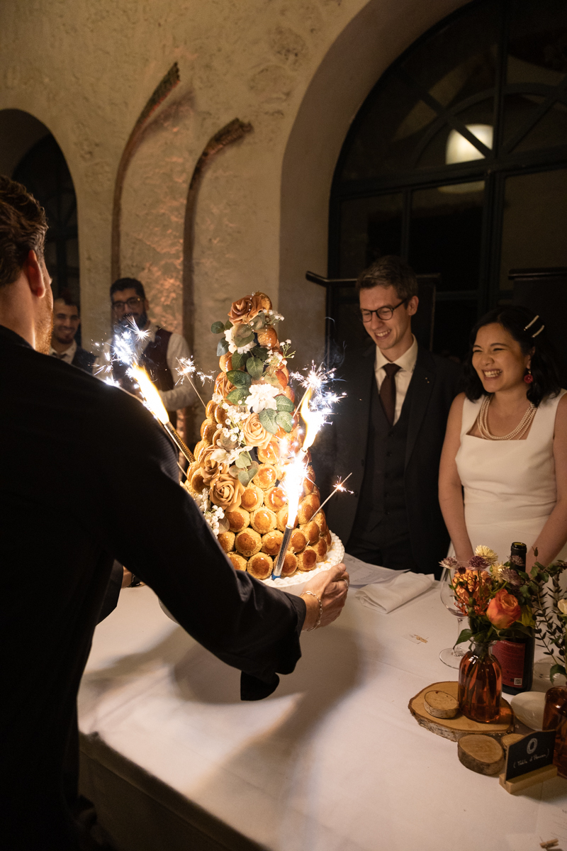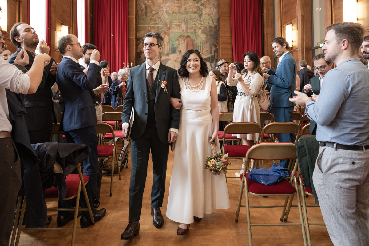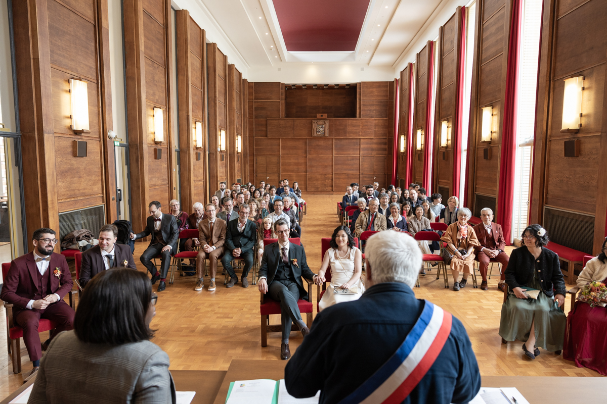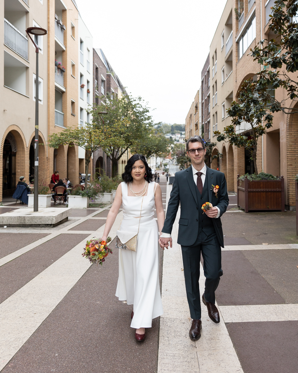 Kim-Mai et Sébastien ont retrouvé leurs nombreux amis à la mairie de Cachan, à quelques pas à peine de leur domicile, à l’occasion de leur mariage civil, avant de continuer les festivités au Domaine de Quincampoix. Kim-Mai portait un ensemble en crêpe fermé par des boutons en nacre, qui faisaient écho au superbe collier de famille, composé de plusieurs rangs de perles retenus par un magnifique boucle en forme de fleur. Leur petite fille arborait une tenue blanche également pour l’occasion. Pendant la réception et le dîner les animations se sont succédé au grand plaisir des invités, qui se sont ensuite déchainés sur la piste de danse!