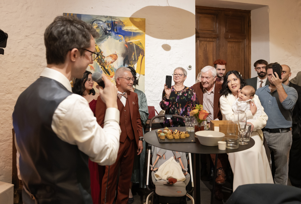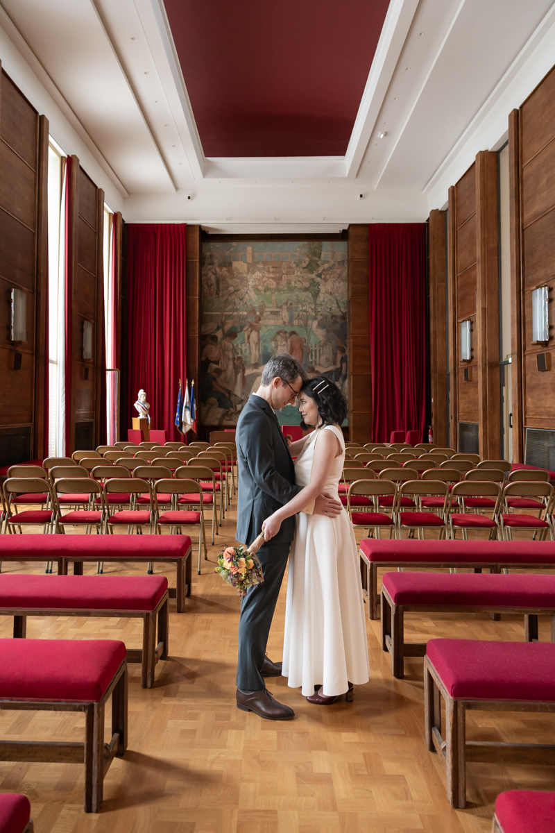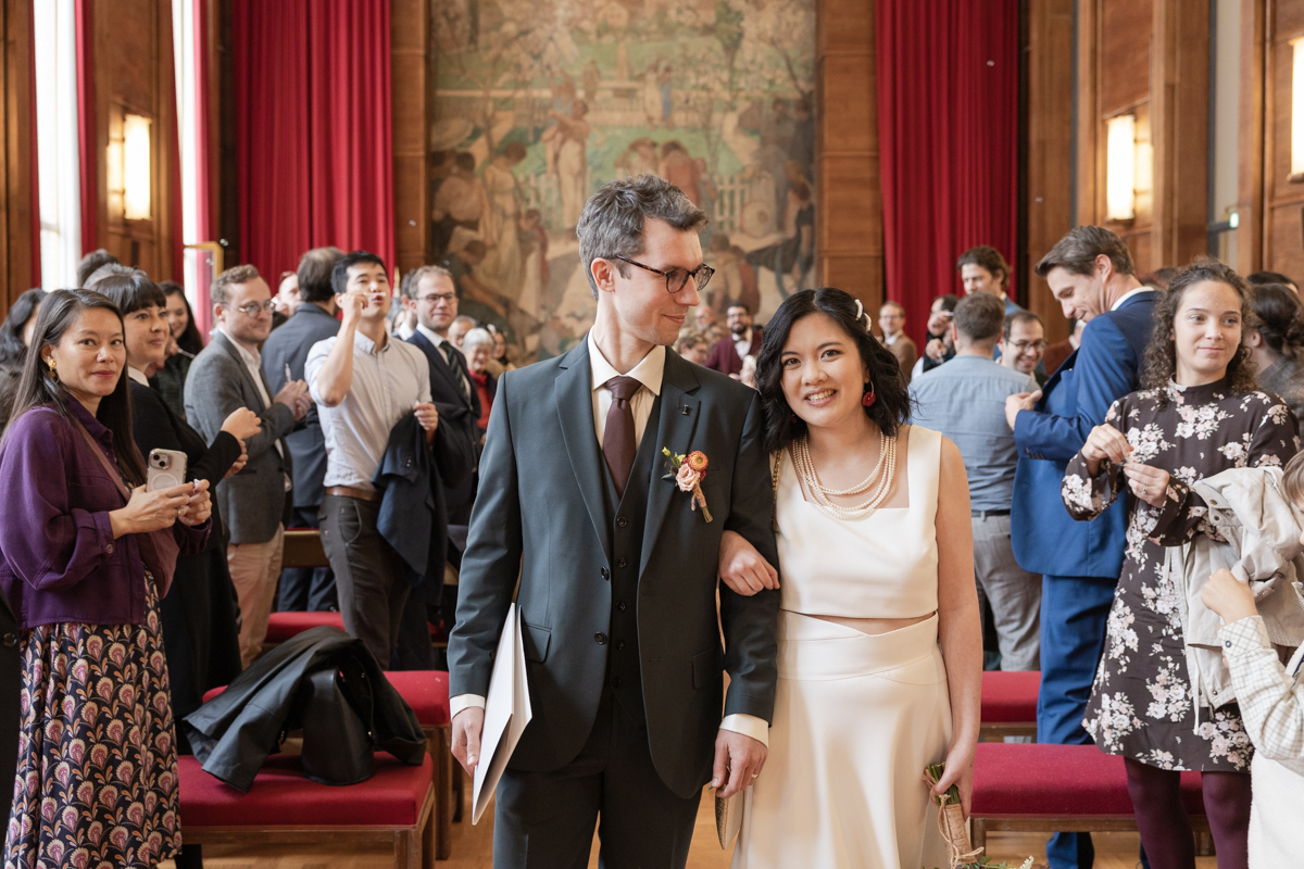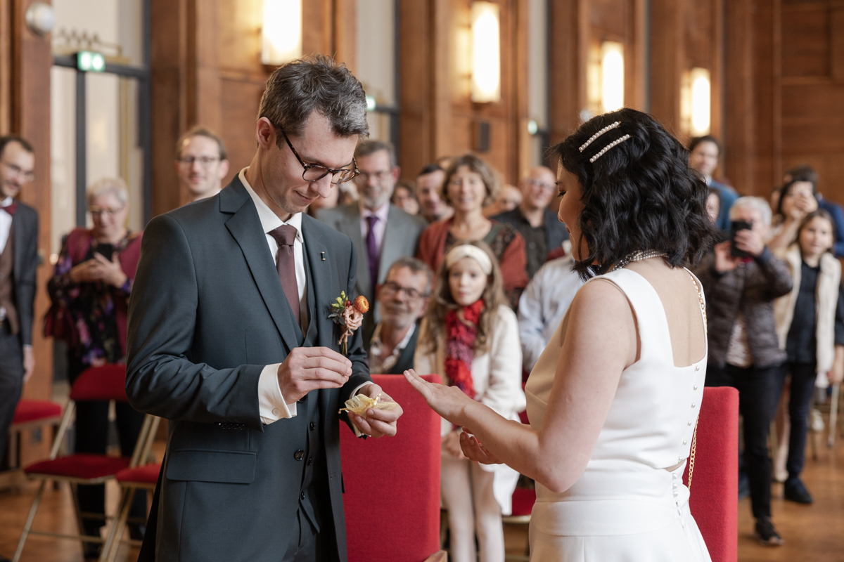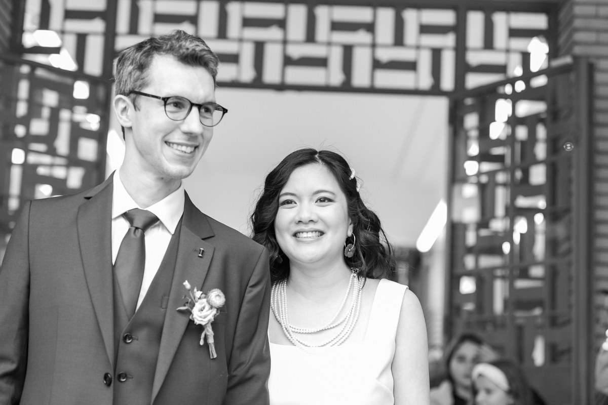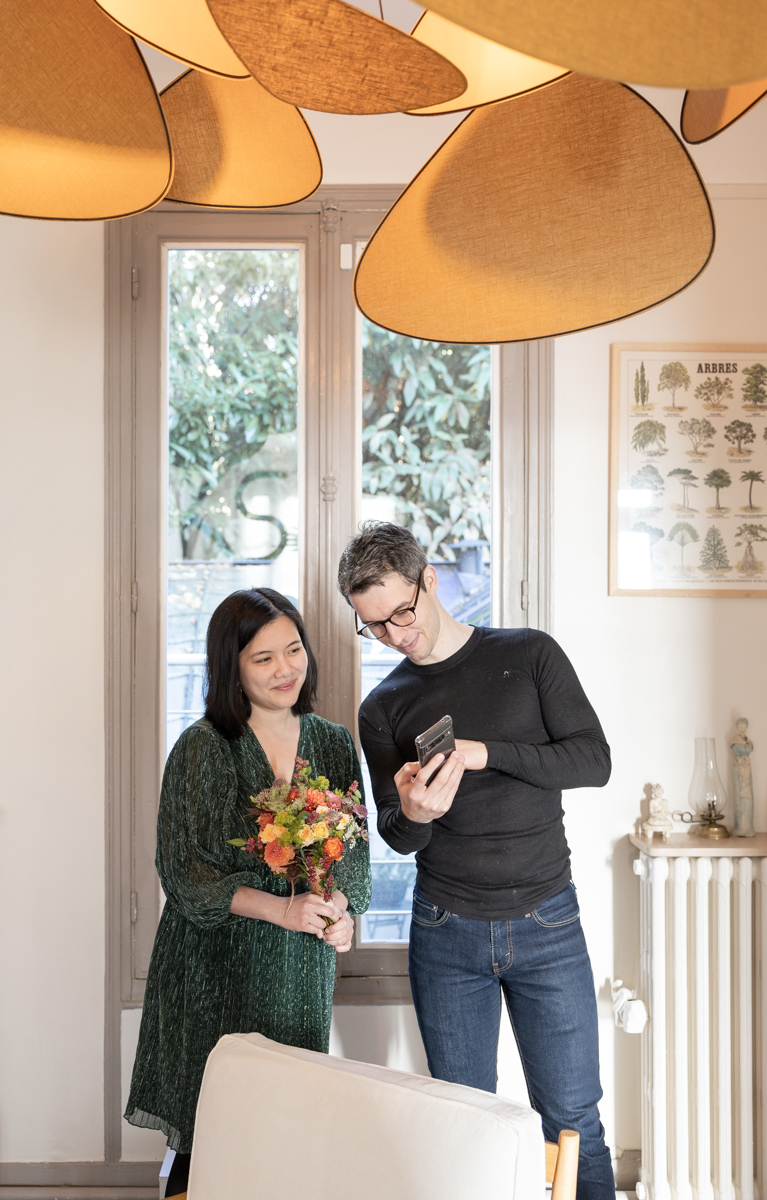 Kim-Mai et Sébastien ont retrouvé leurs nombreux amis à la mairie de Cachan, à quelques pas à peine de leur domicile, à l’occasion de leur mariage civil, avant de continuer les festivités au Domaine de Quincampoix. Kim-Mai portait un ensemble en crêpe fermé par des boutons en nacre, qui faisaient écho au superbe collier de famille, composé de plusieurs rangs de perles retenus par un magnifique boucle en forme de fleur. Leur petite fille arborait une tenue blanche également pour l’occasion. Pendant la réception et le dîner les animations se sont succédé au grand plaisir des invités, qui se sont ensuite déchainés sur la piste de danse!