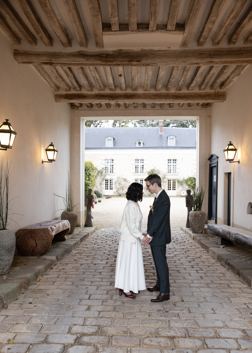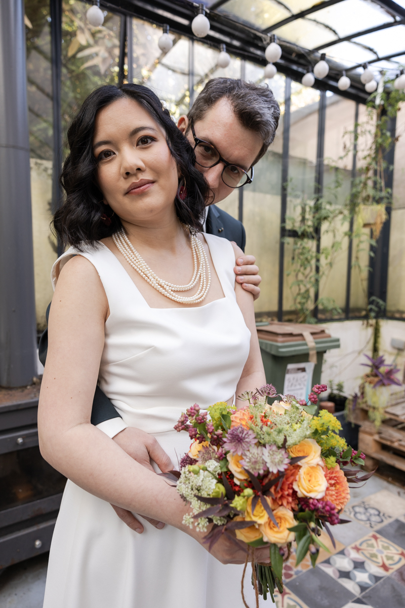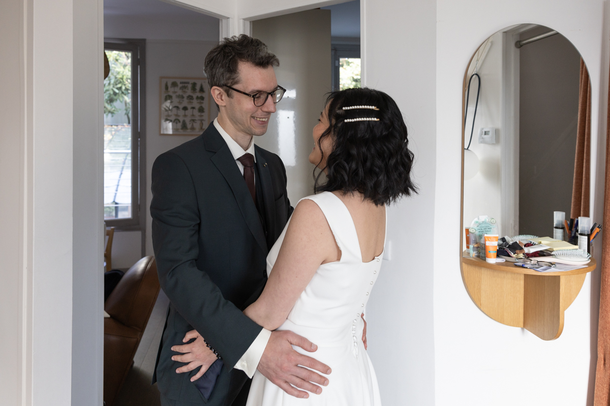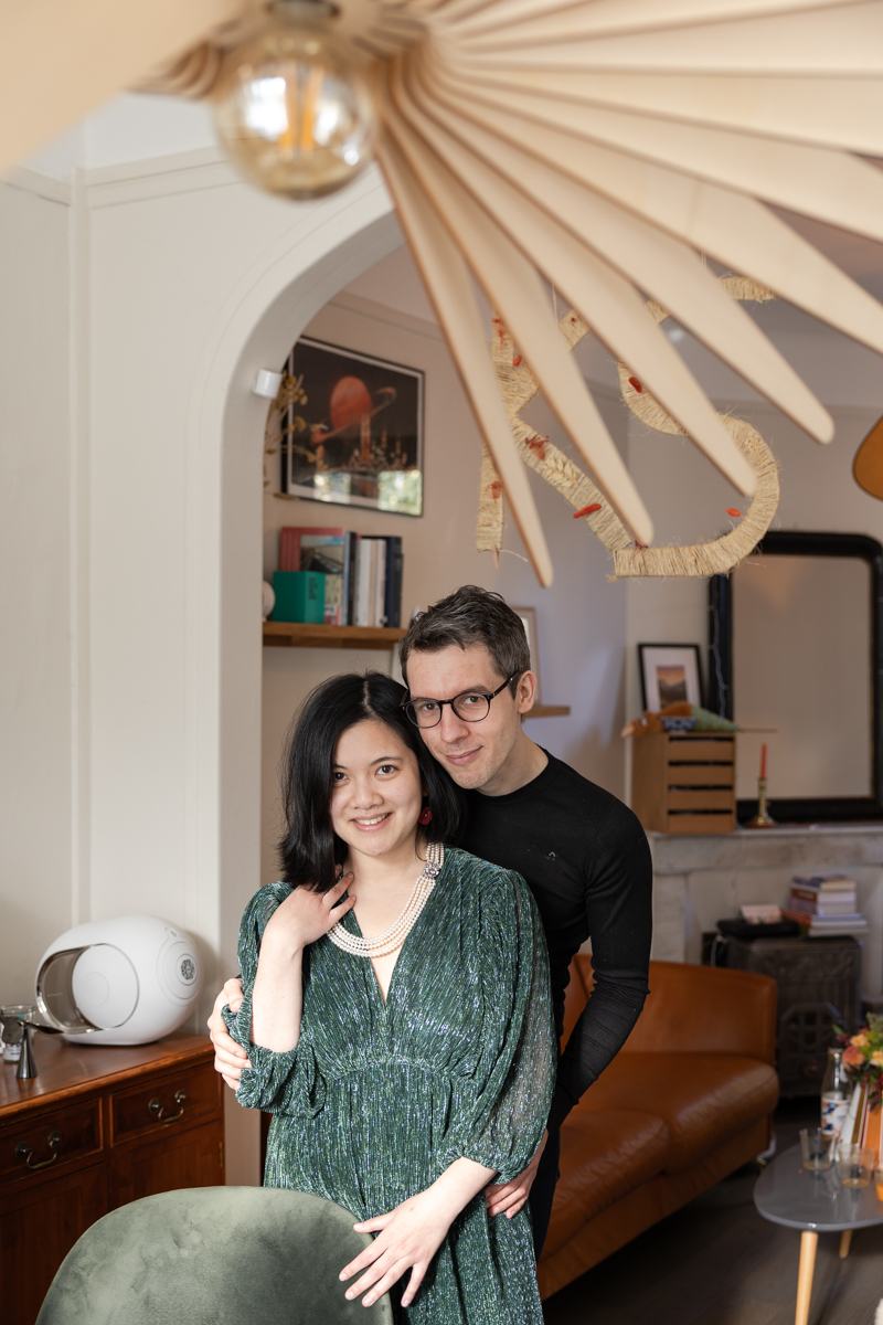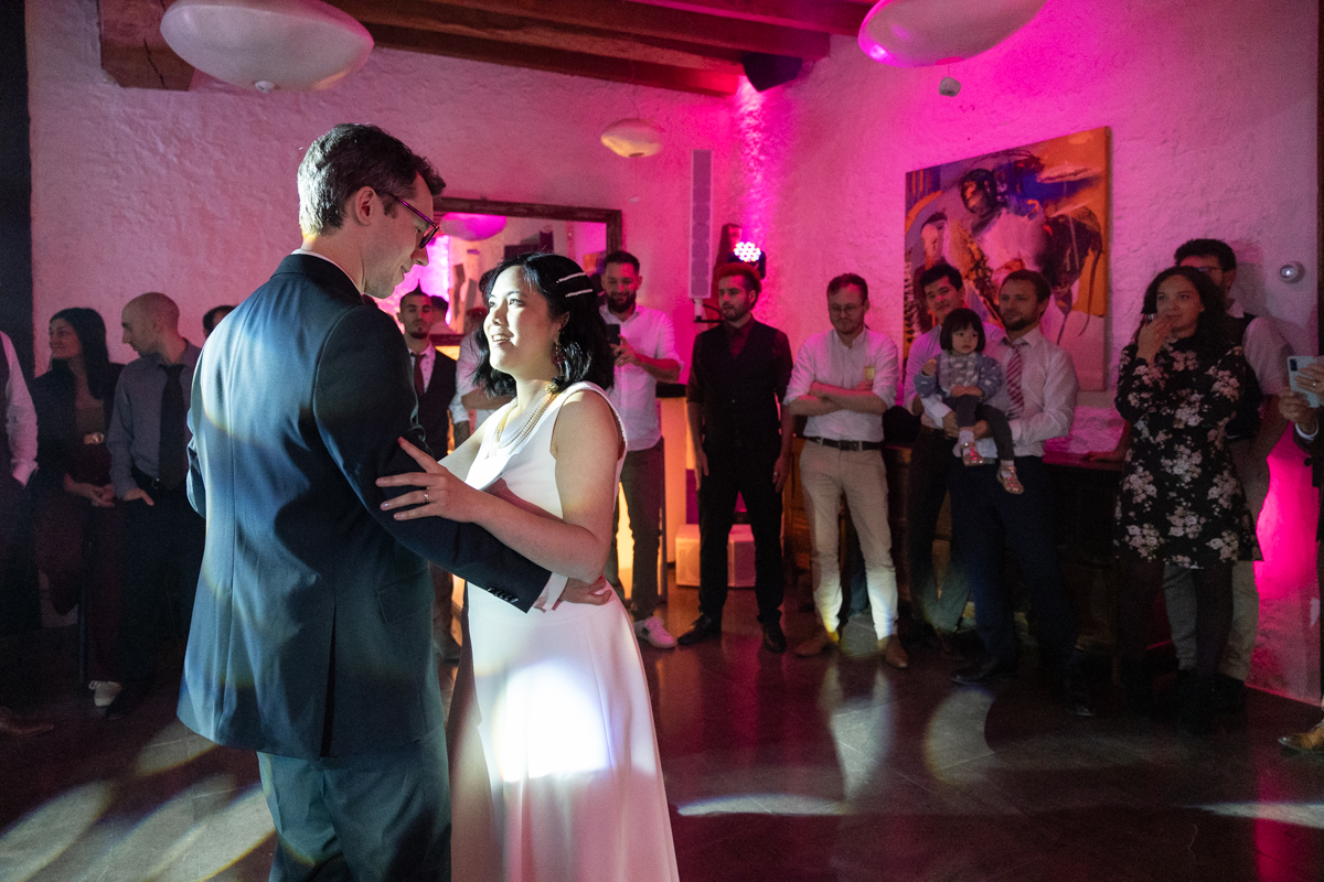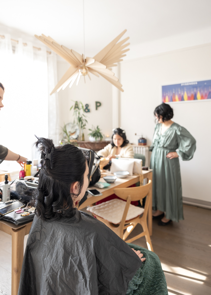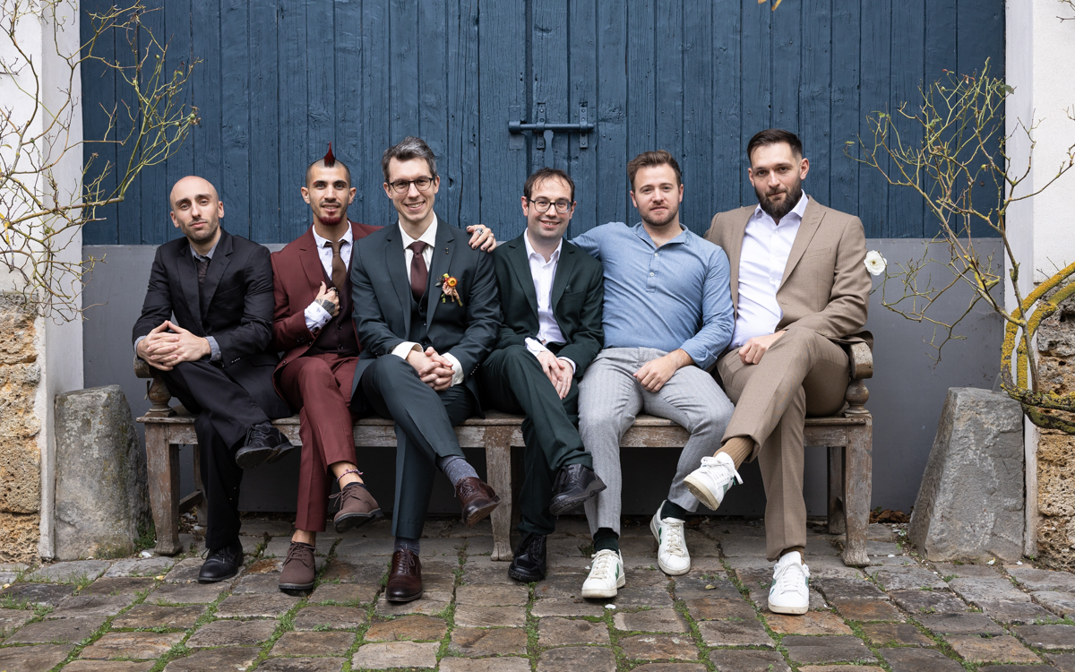 Kim-Mai et Sébastien ont retrouvé leurs nombreux amis à la mairie de Cachan, à quelques pas à peine de leur domicile, à l’occasion de leur mariage civil, avant de continuer les festivités au Domaine de Quincampoix. Kim-Mai portait un ensemble en crêpe fermé par des boutons en nacre, qui faisaient écho au superbe collier de famille, composé de plusieurs rangs de perles retenus par un magnifique boucle en forme de fleur. Leur petite fille arborait une tenue blanche également pour l’occasion. Pendant la réception et le dîner les animations se sont succédé au grand plaisir des invités, qui se sont ensuite déchainés sur la piste de danse!