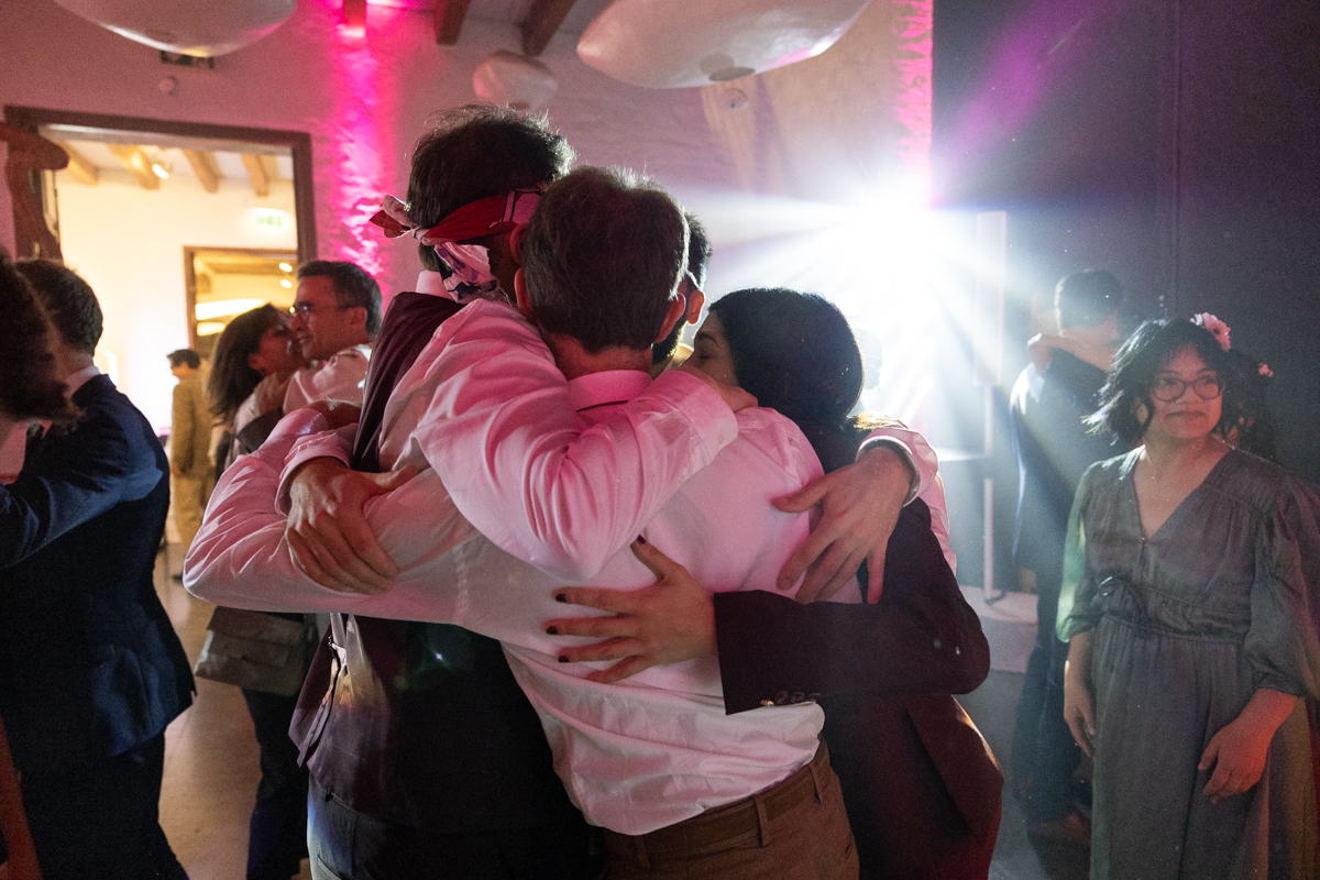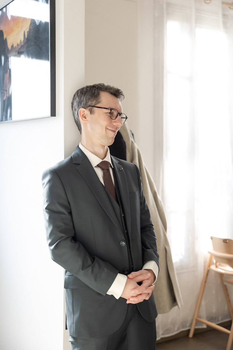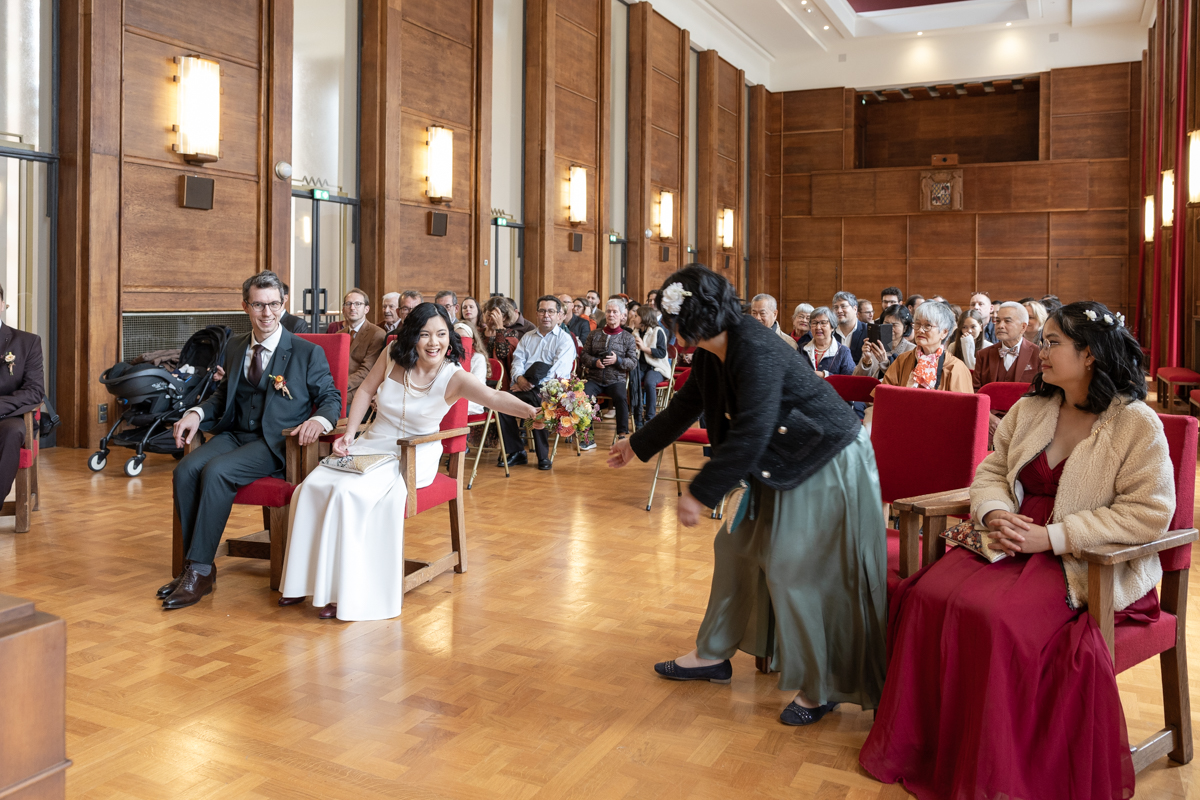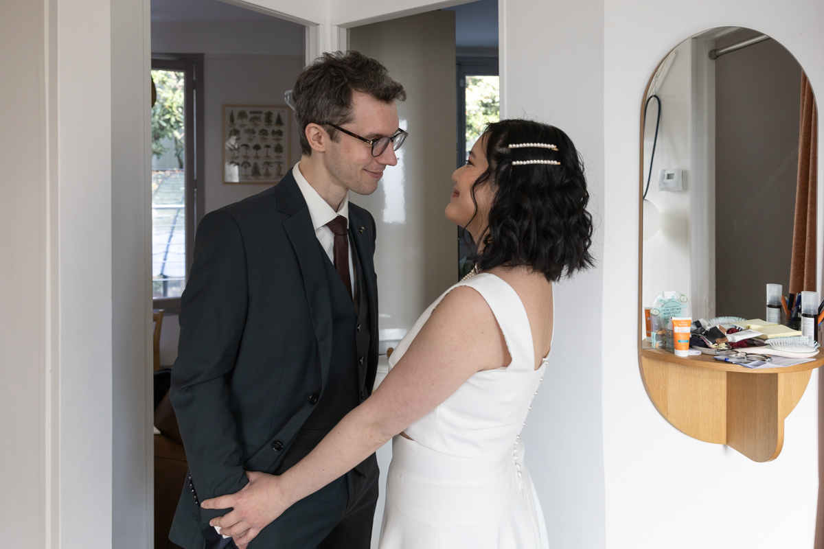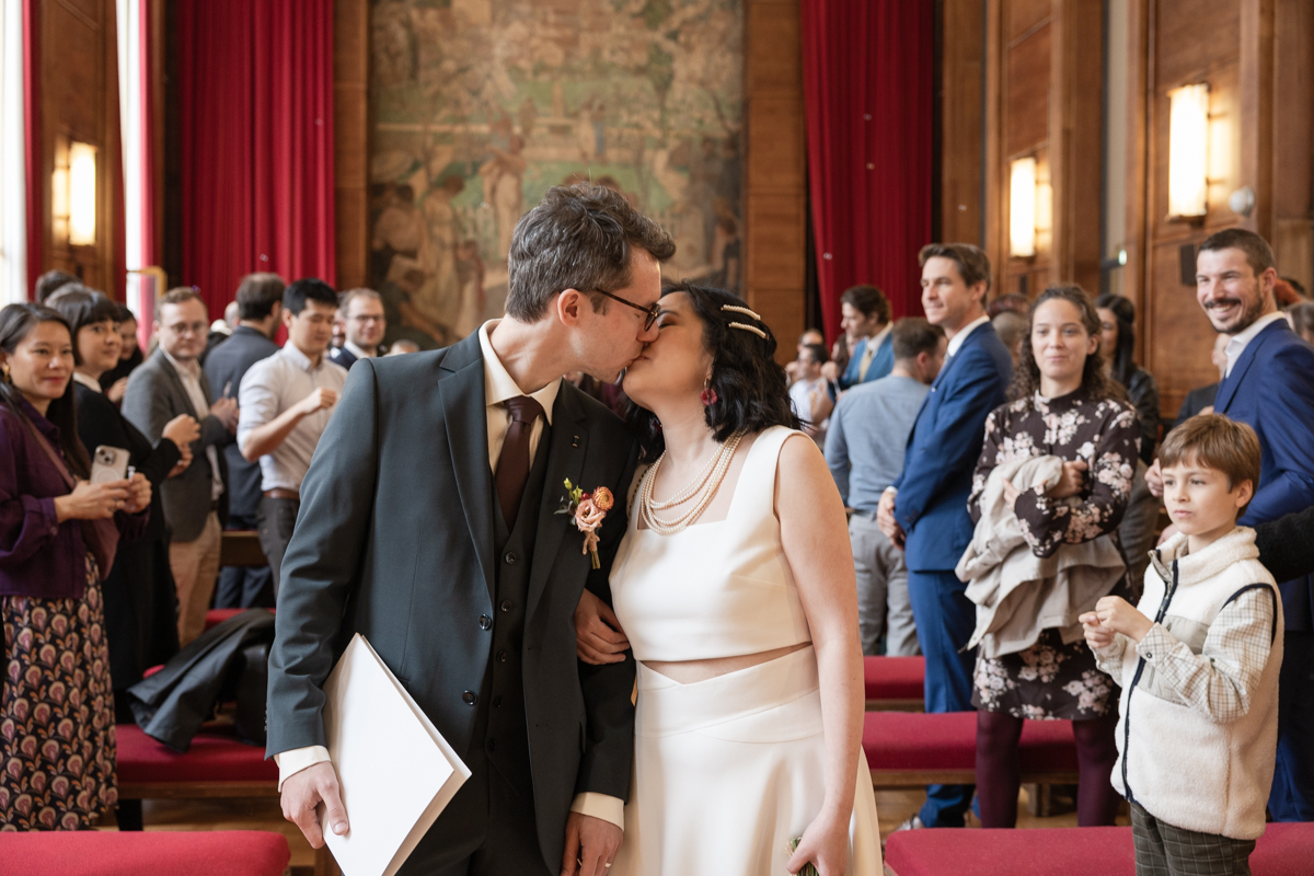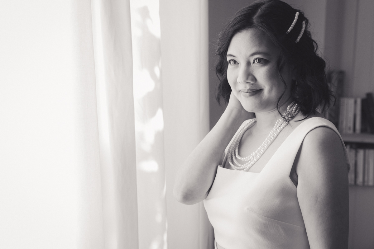 Kim-Mai et Sébastien ont retrouvé leurs nombreux amis à la mairie de Cachan, à quelques pas à peine de leur domicile, à l’occasion de leur mariage civil, avant de continuer les festivités au Domaine de Quincampoix. Kim-Mai portait un ensemble en crêpe fermé par des boutons en nacre, qui faisaient écho au superbe collier de famille, composé de plusieurs rangs de perles retenus par un magnifique boucle en forme de fleur. Leur petite fille arborait une tenue blanche également pour l’occasion. Pendant la réception et le dîner les animations se sont succédé au grand plaisir des invités, qui se sont ensuite déchainés sur la piste de danse!