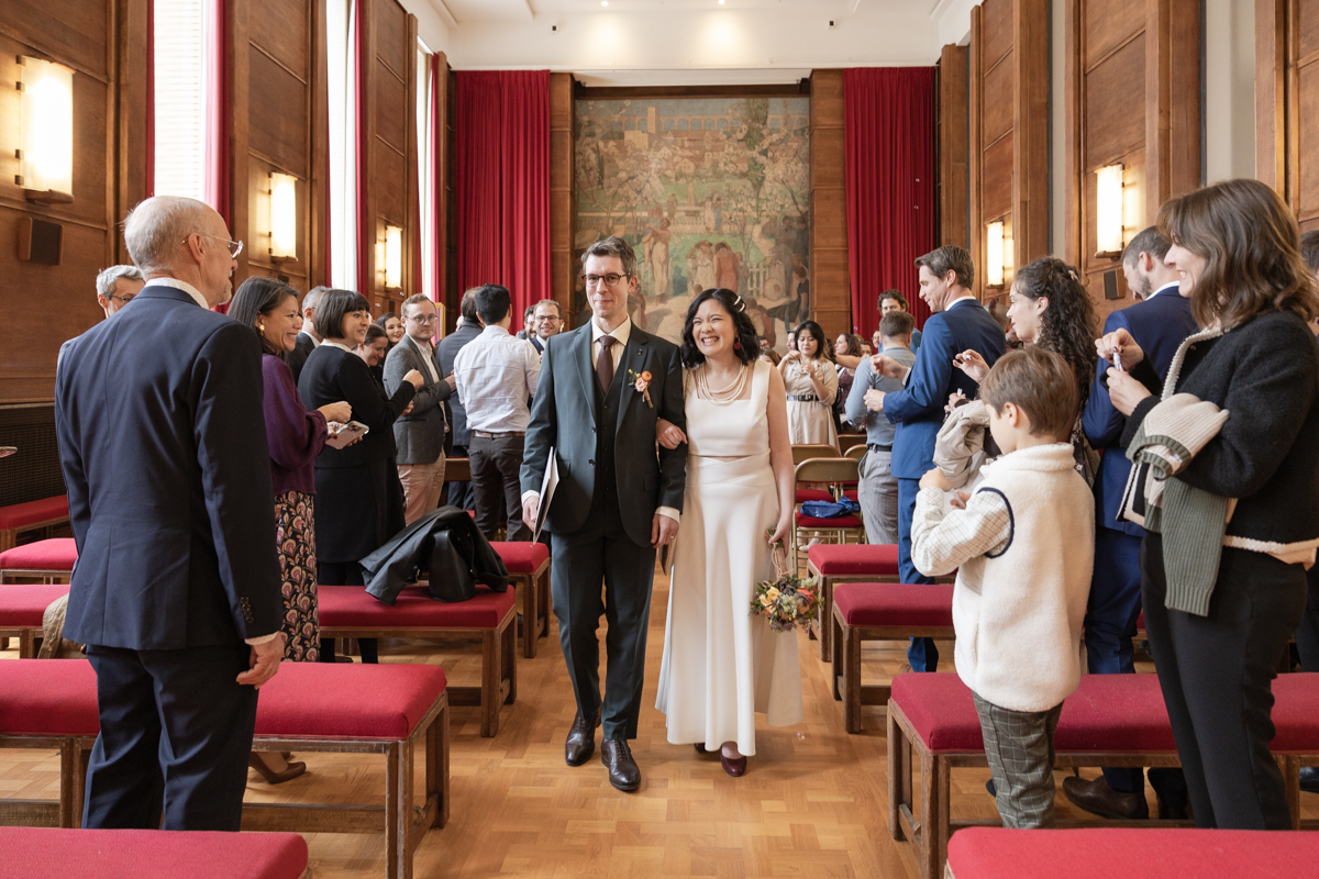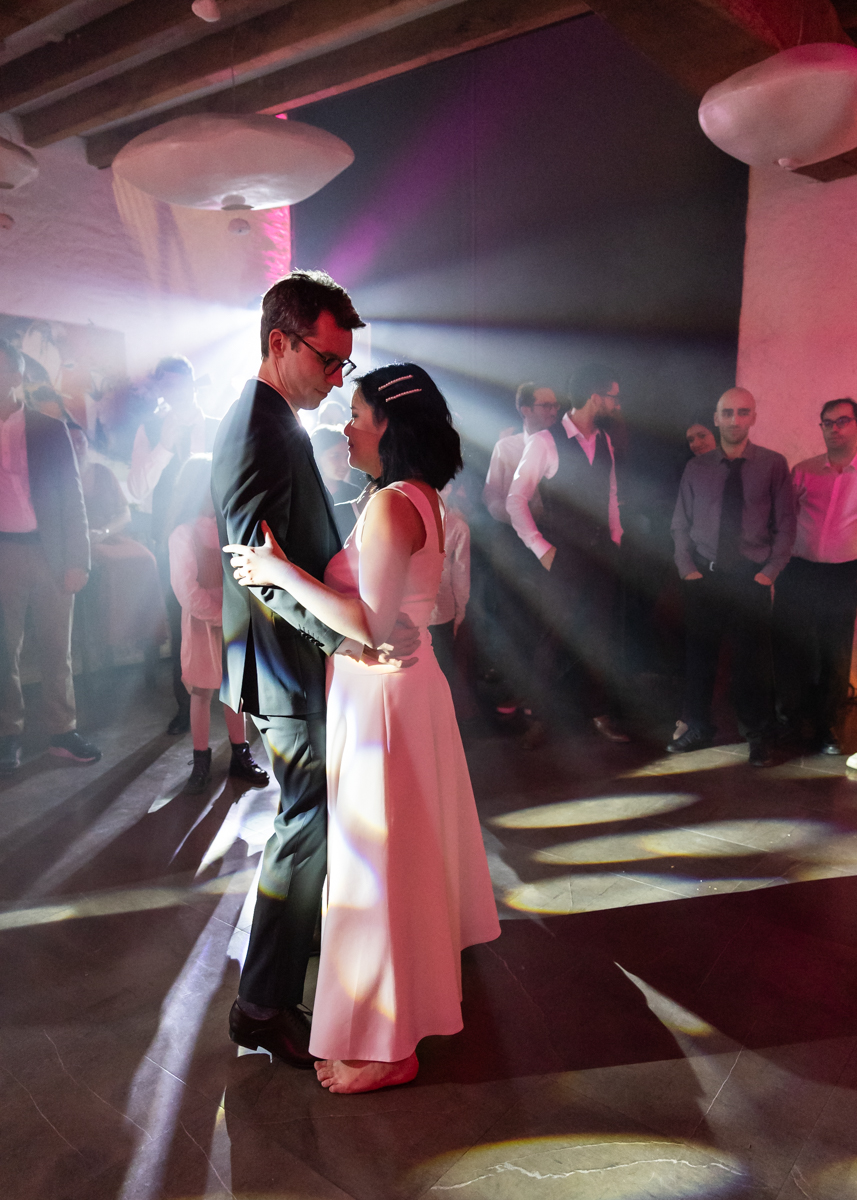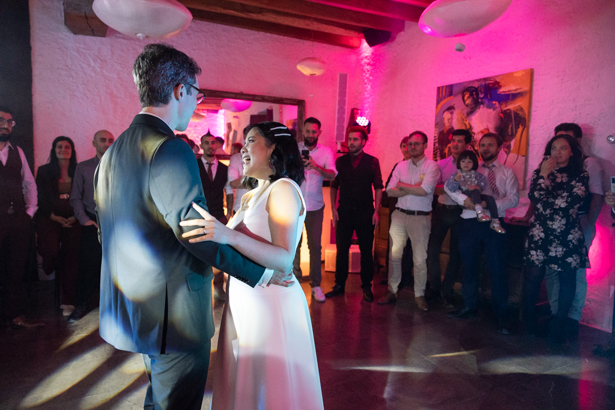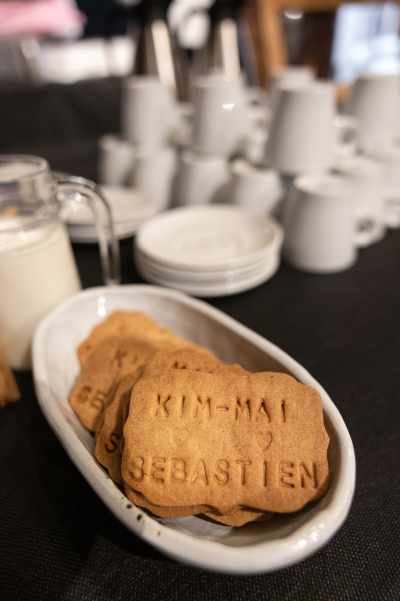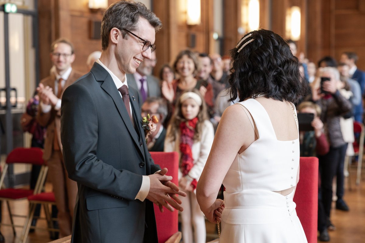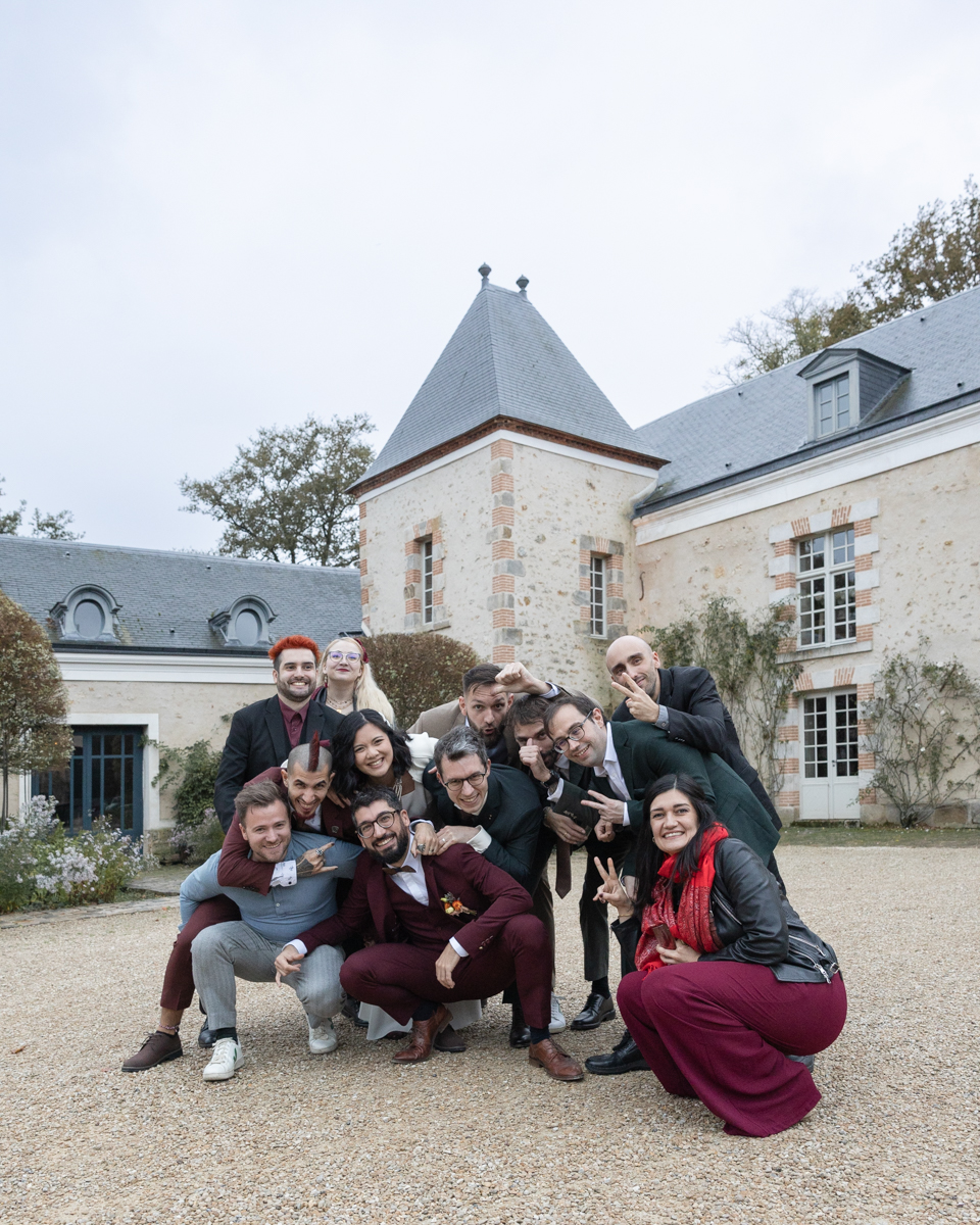 Kim-Mai et Sébastien ont retrouvé leurs nombreux amis à la mairie de Cachan, à quelques pas à peine de leur domicile, à l’occasion de leur mariage civil, avant de continuer les festivités au Domaine de Quincampoix. Kim-Mai portait un ensemble en crêpe fermé par des boutons en nacre, qui faisaient écho au superbe collier de famille, composé de plusieurs rangs de perles retenus par un magnifique boucle en forme de fleur. Leur petite fille arborait une tenue blanche également pour l’occasion. Pendant la réception et le dîner les animations se sont succédé au grand plaisir des invités, qui se sont ensuite déchainés sur la piste de danse!