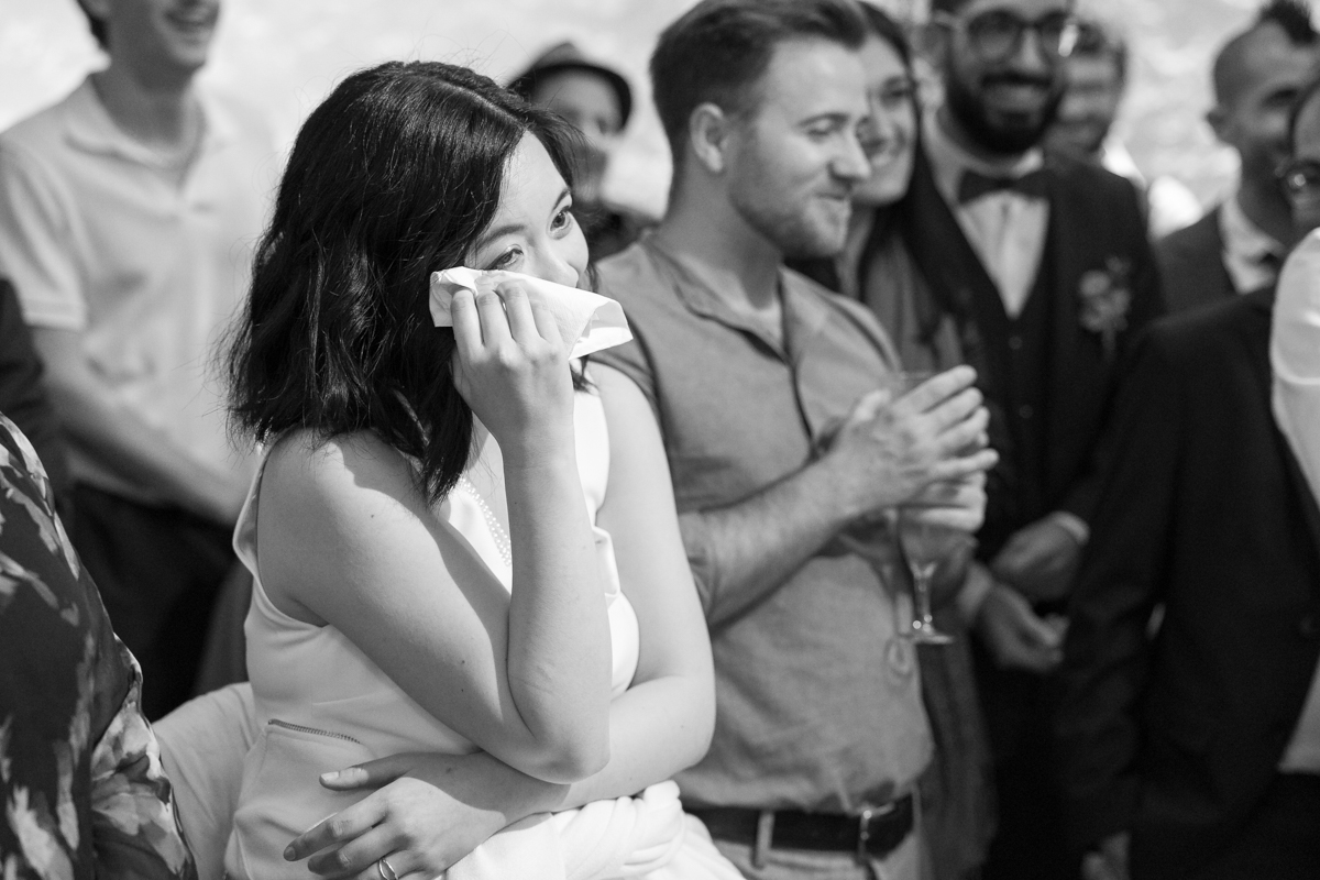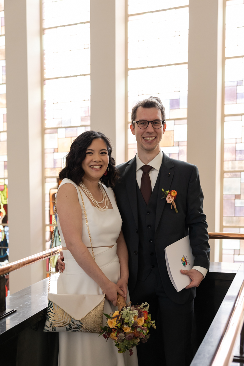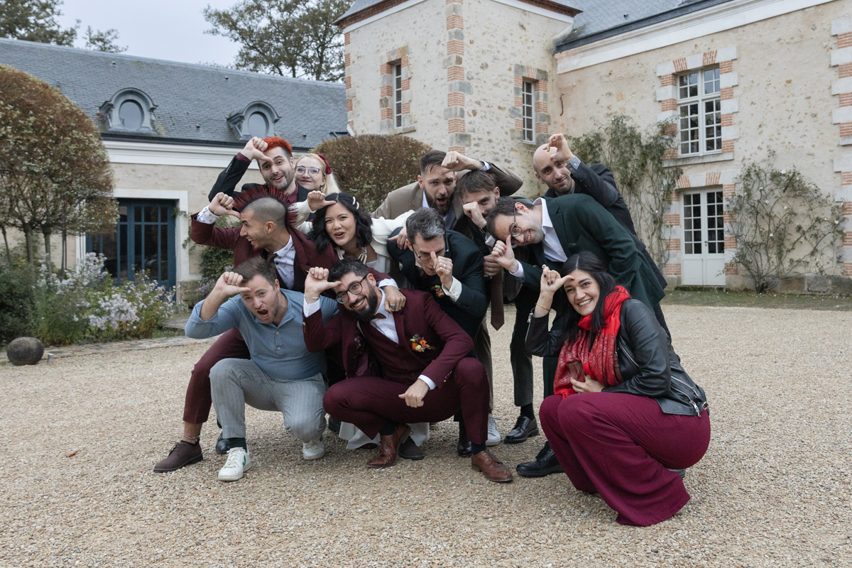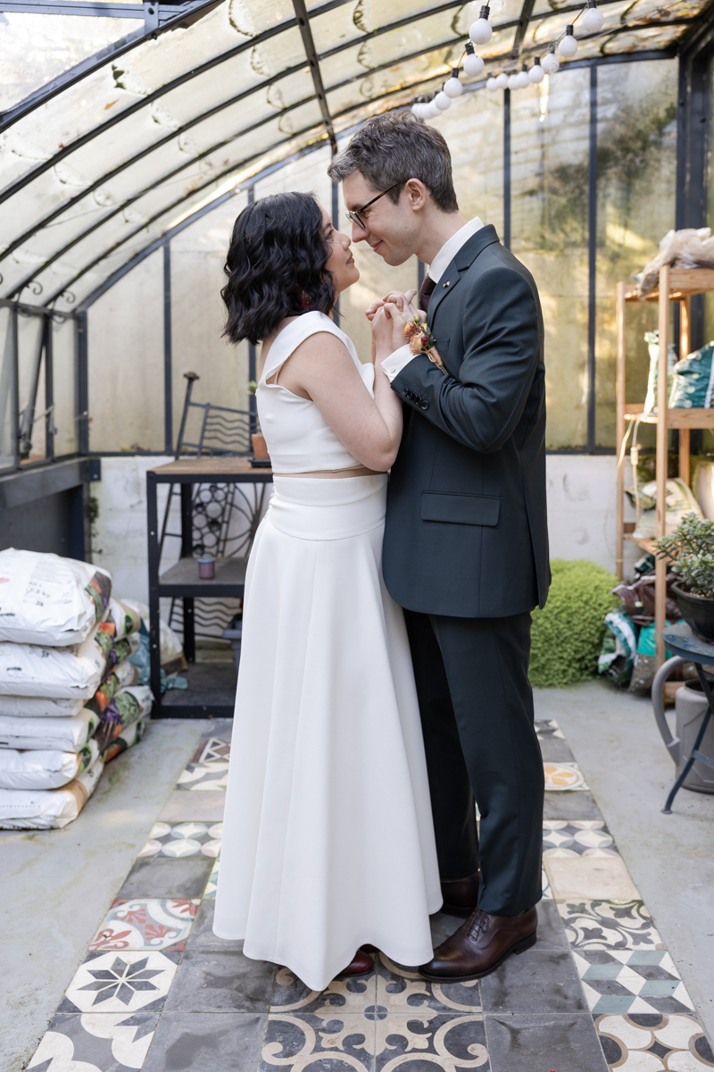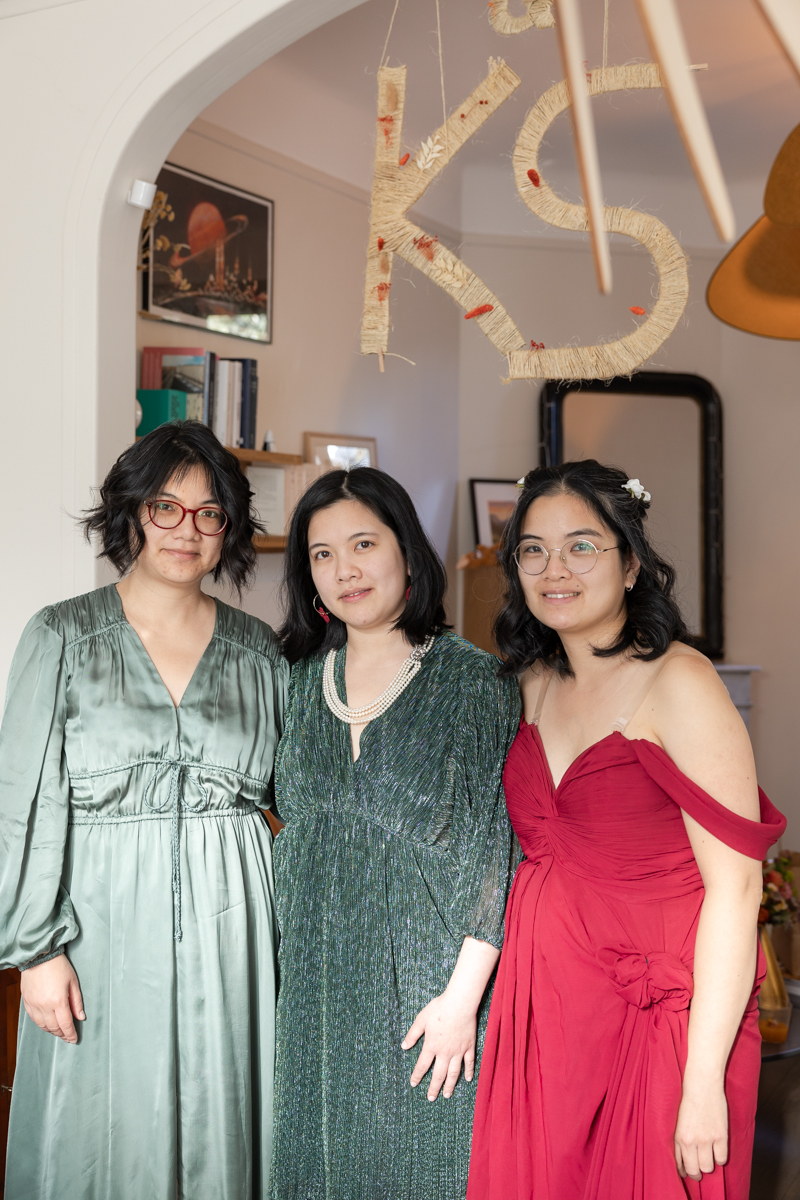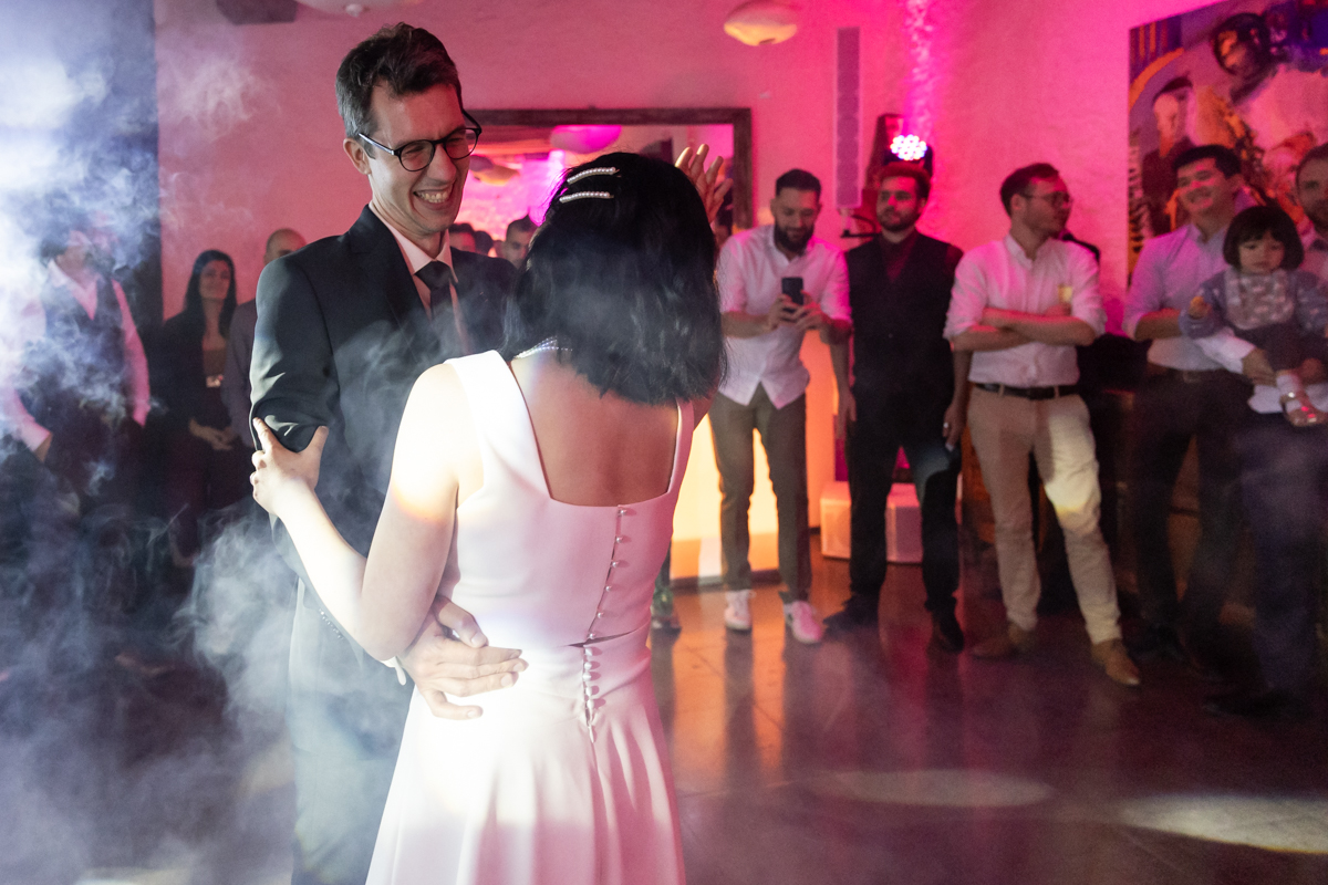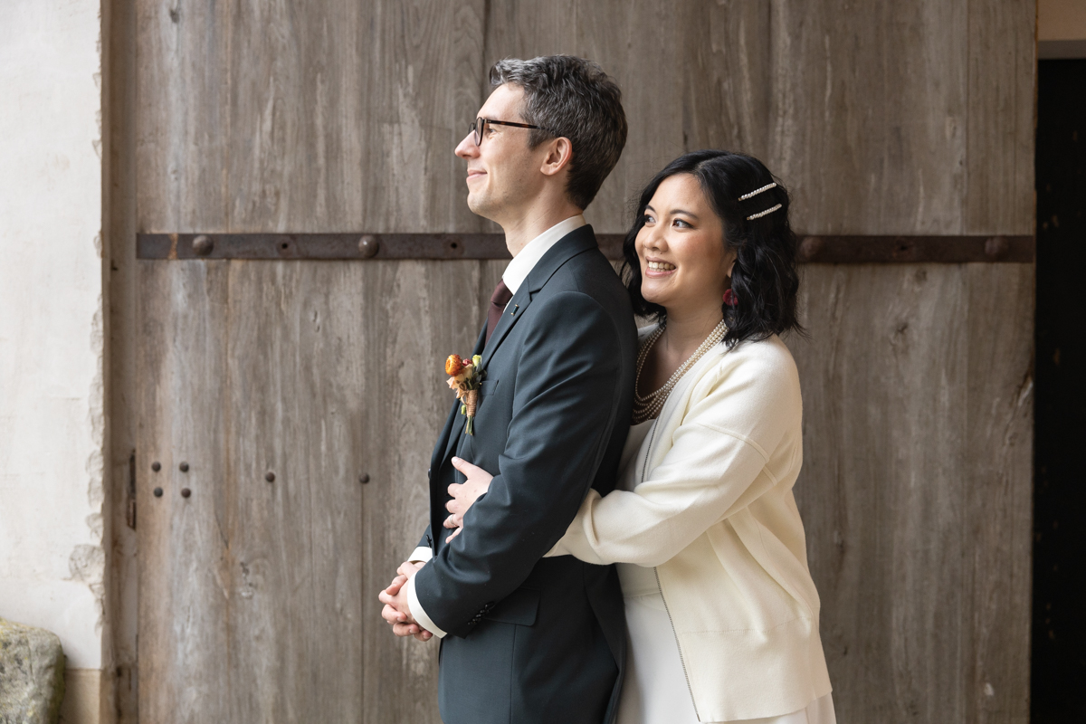 Kim-Mai et Sébastien ont retrouvé leurs nombreux amis à la mairie de Cachan, à quelques pas à peine de leur domicile, à l’occasion de leur mariage civil, avant de continuer les festivités au Domaine de Quincampoix. Kim-Mai portait un ensemble en crêpe fermé par des boutons en nacre, qui faisaient écho au superbe collier de famille, composé de plusieurs rangs de perles retenus par un magnifique boucle en forme de fleur. Leur petite fille arborait une tenue blanche également pour l’occasion. Pendant la réception et le dîner les animations se sont succédé au grand plaisir des invités, qui se sont ensuite déchainés sur la piste de danse!