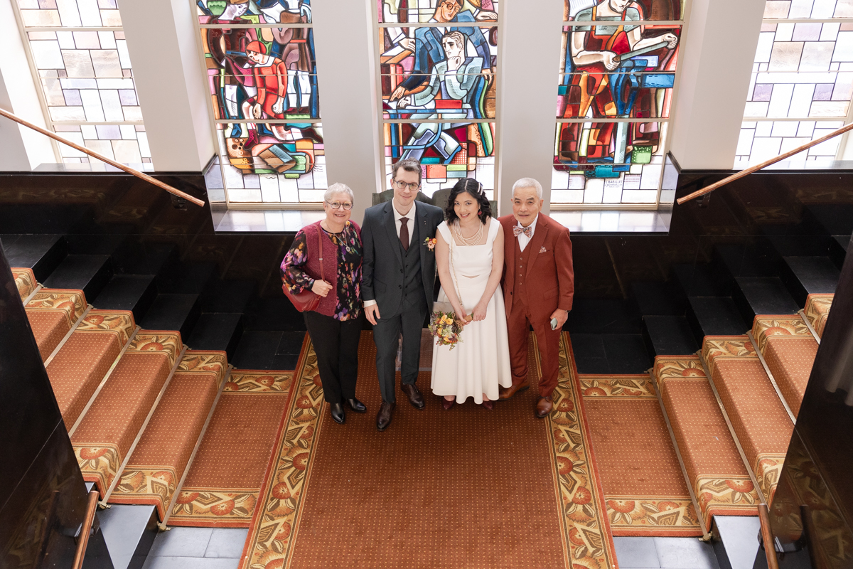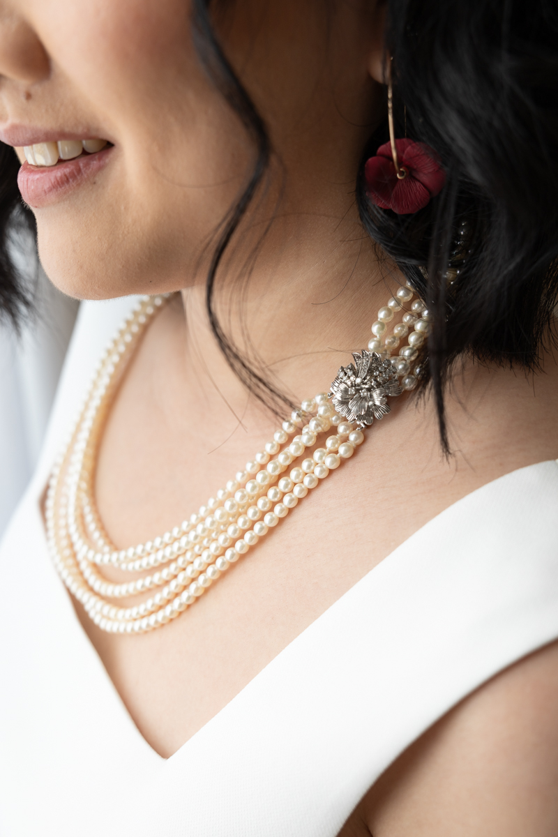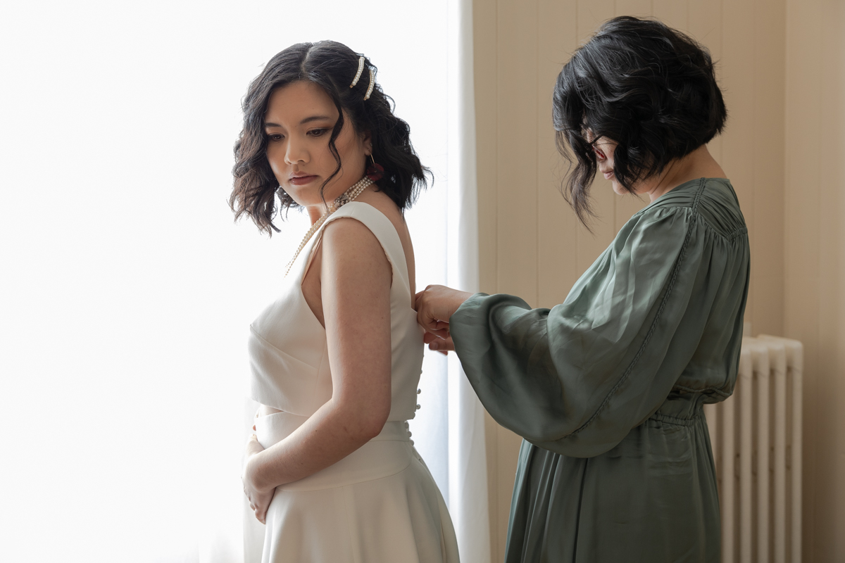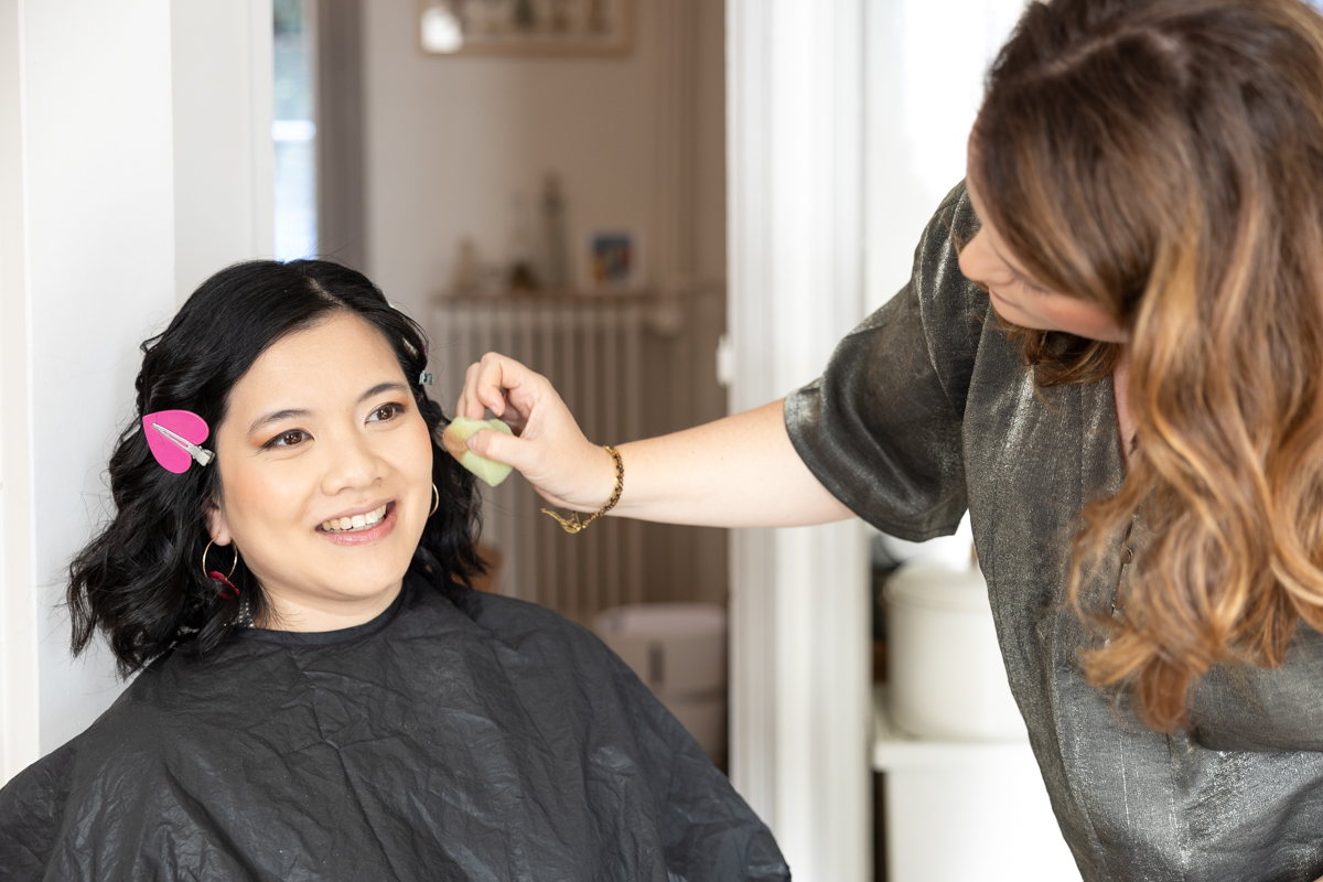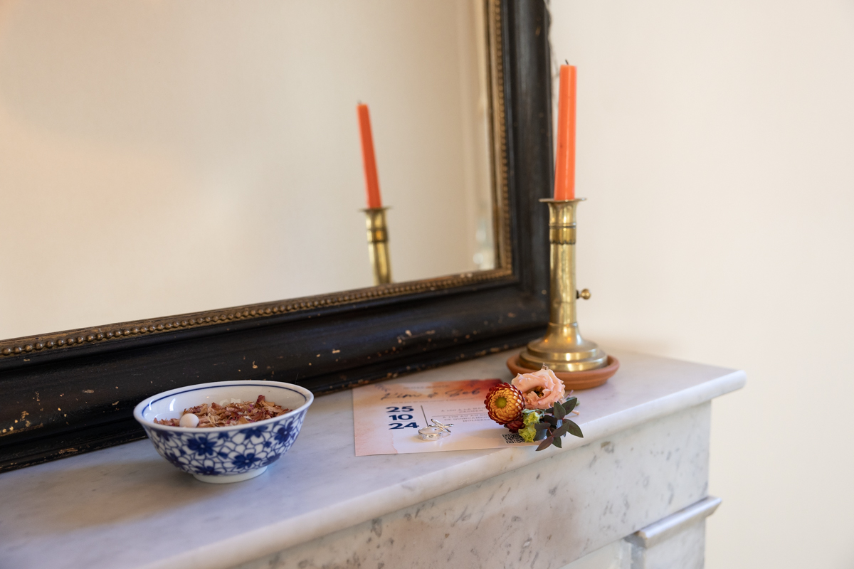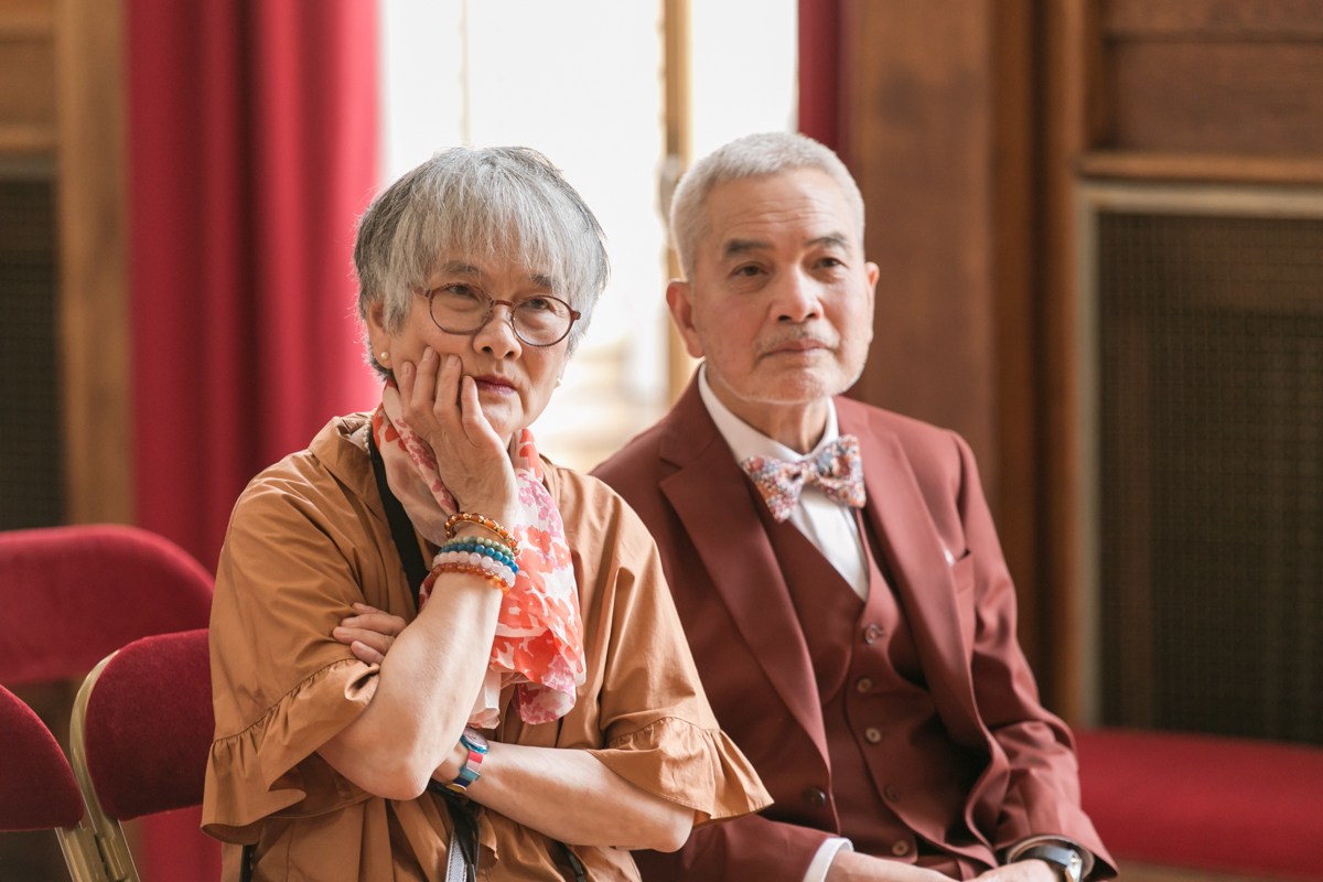 Kim-Mai et Sébastien ont retrouvé leurs nombreux amis à la mairie de Cachan, à quelques pas à peine de leur domicile, à l’occasion de leur mariage civil, avant de continuer les festivités au Domaine de Quincampoix. Kim-Mai portait un ensemble en crêpe fermé par des boutons en nacre, qui faisaient écho au superbe collier de famille, composé de plusieurs rangs de perles retenus par un magnifique boucle en forme de fleur. Leur petite fille arborait une tenue blanche également pour l’occasion. Pendant la réception et le dîner les animations se sont succédé au grand plaisir des invités, qui se sont ensuite déchainés sur la piste de danse!