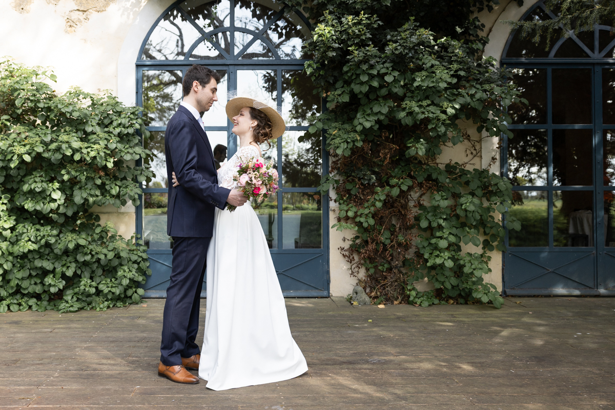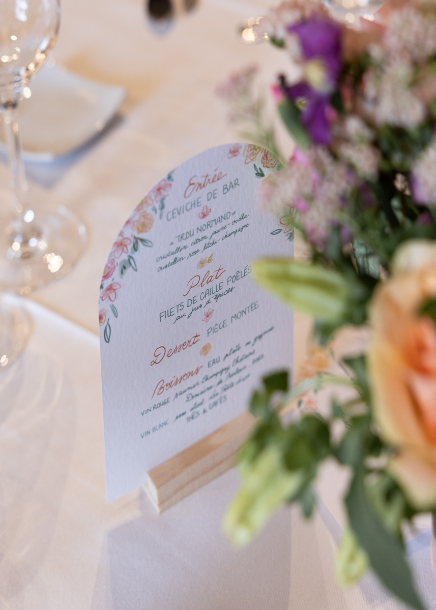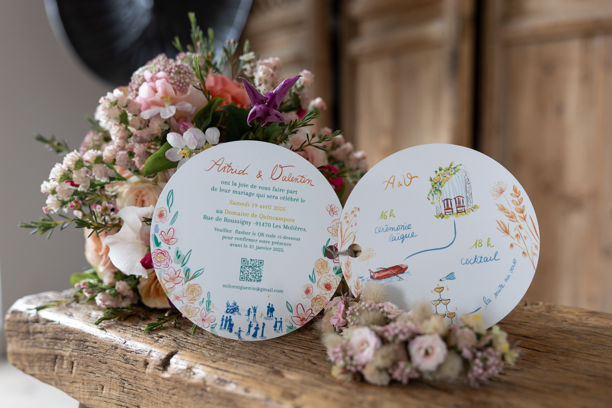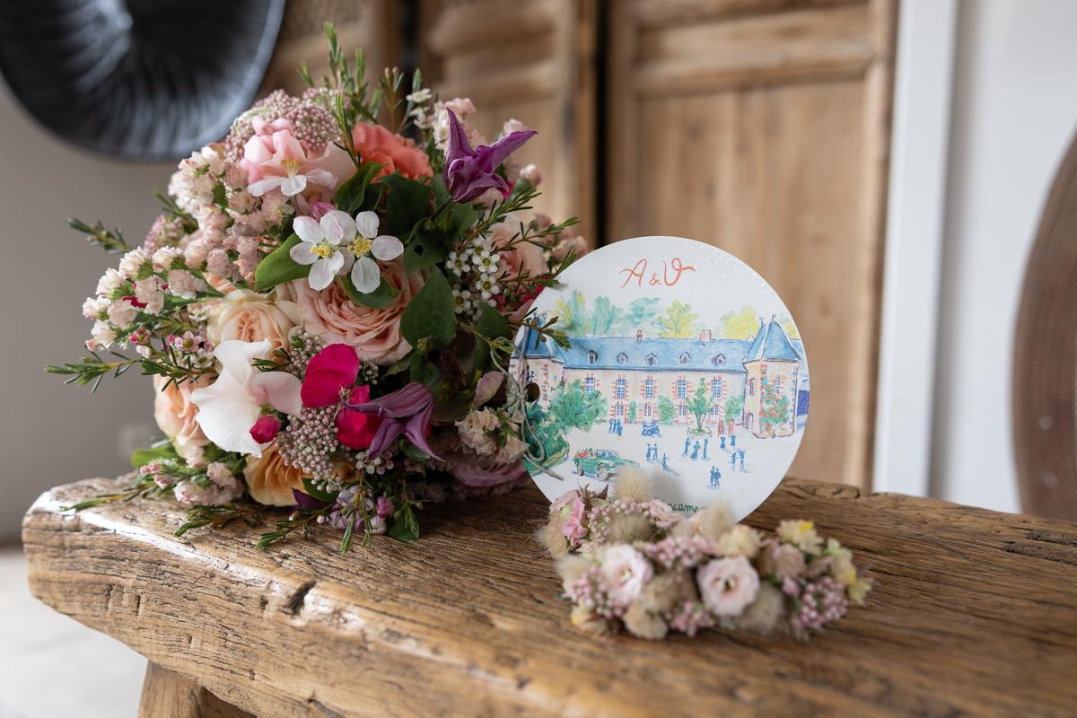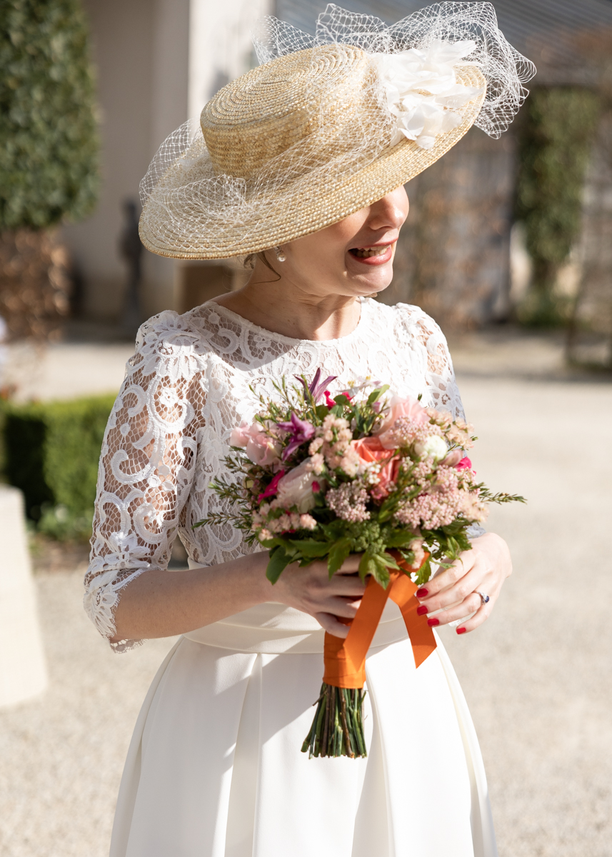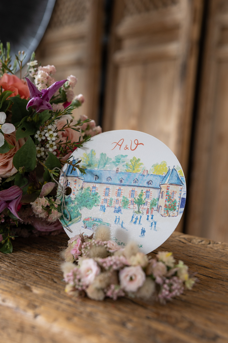 Robe et chapeau de mariée: Victoire – Chaussures : Jonak – Costume du marié : Chaussures : – Alliances et bague de fiançailles: Naravi – Fleurs: Le Fleuriste du Coin – Traiteur: Le Grand Chemin – Papeterie illustrée par Estelle B – DJ Marko – Lieu de réception: Domaine de Quincampoix (91)
