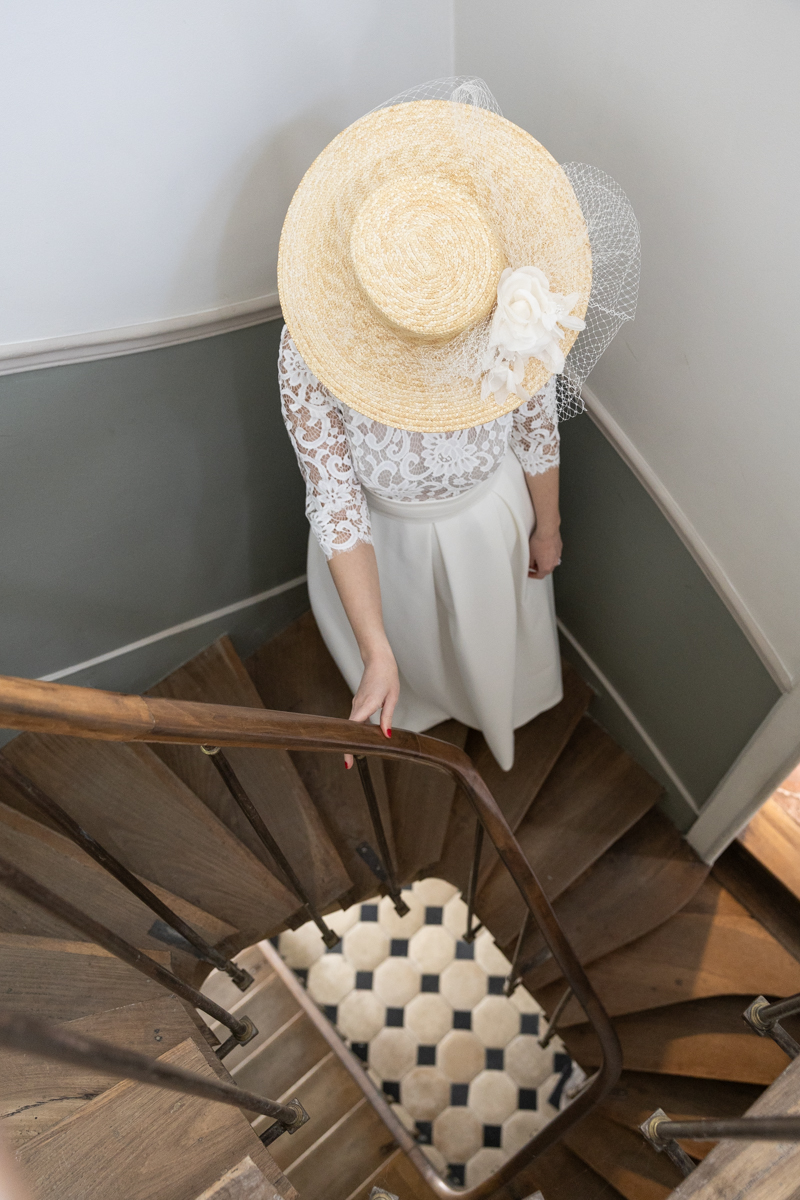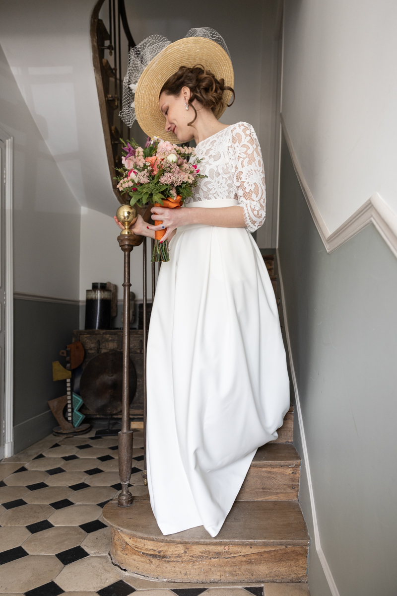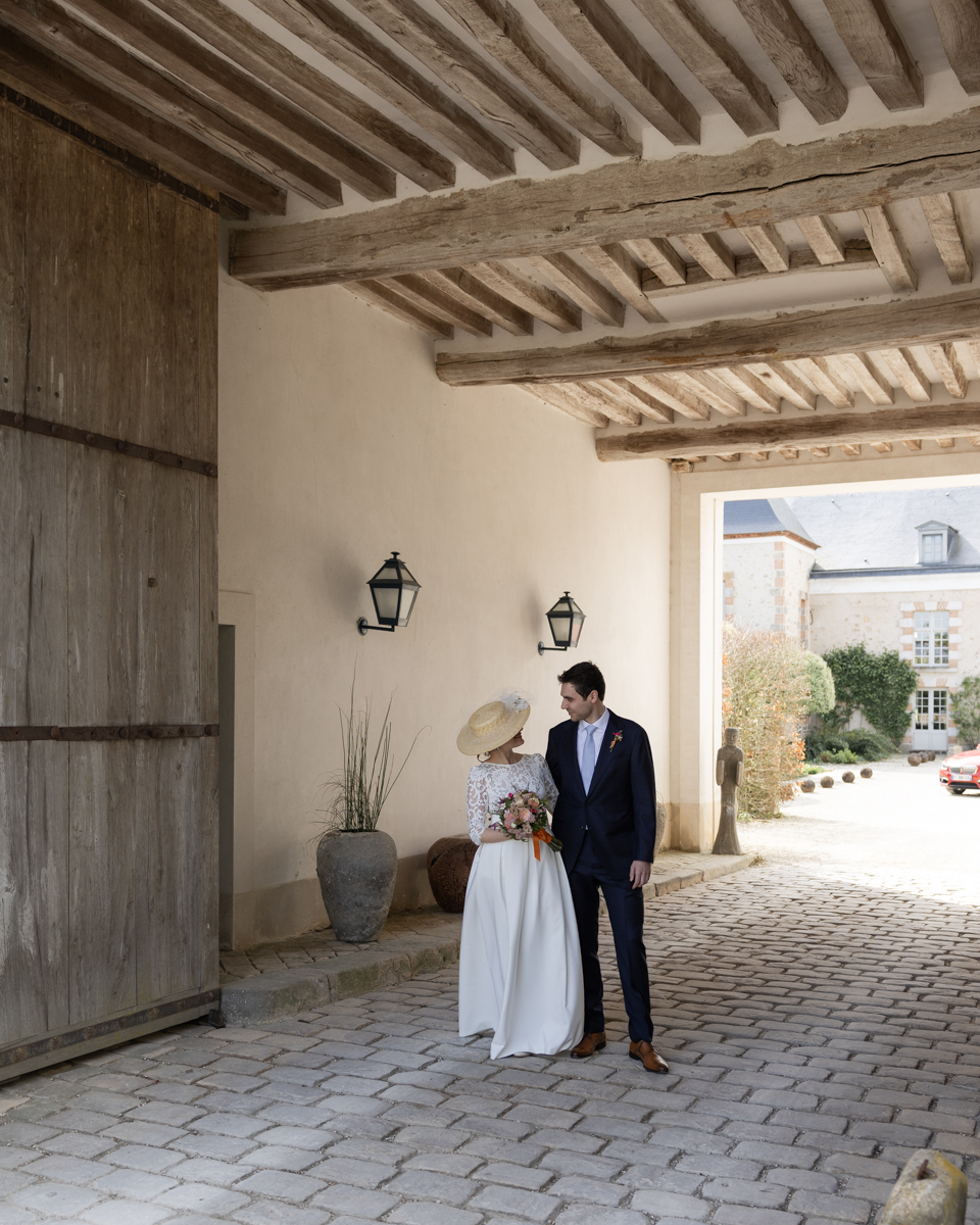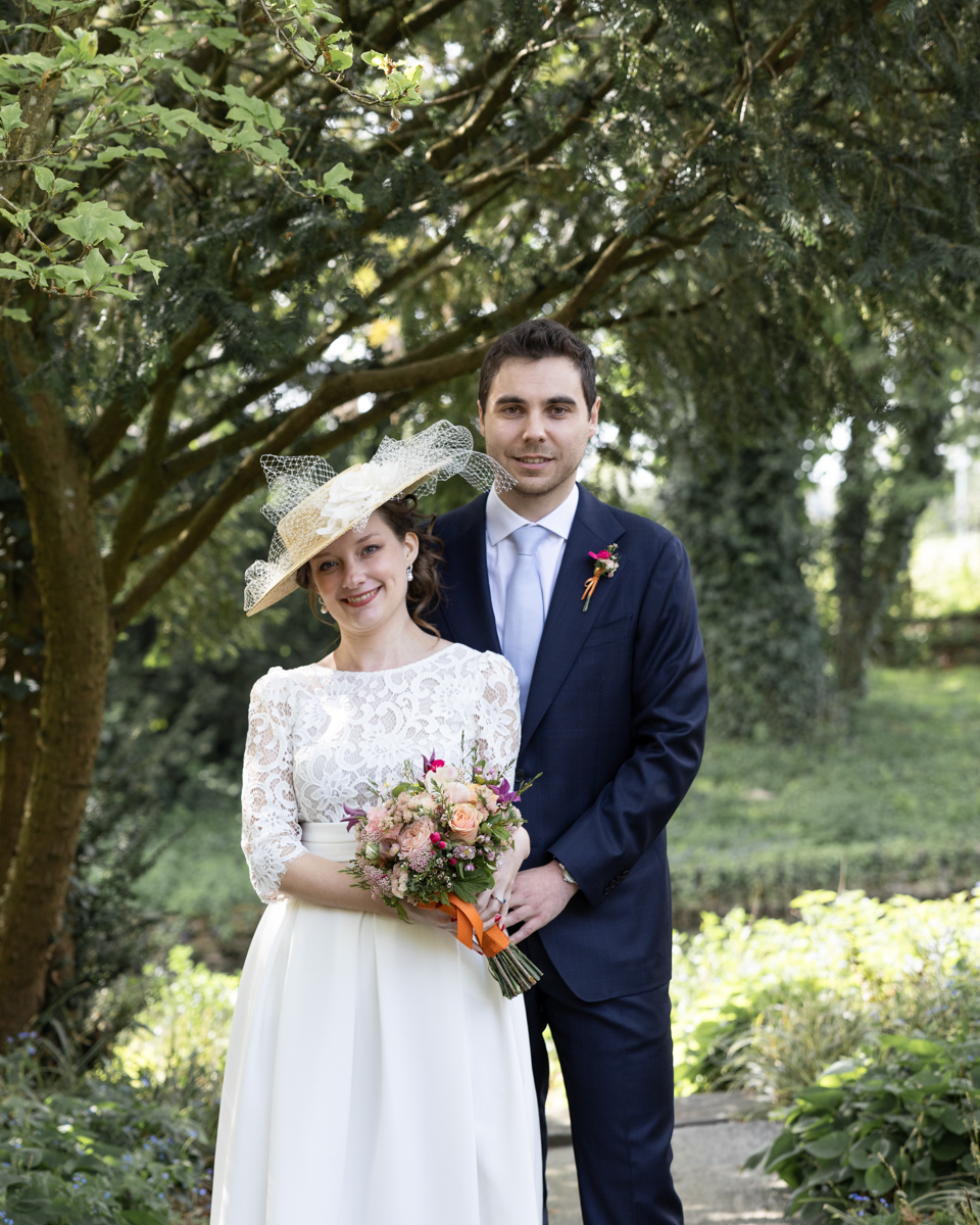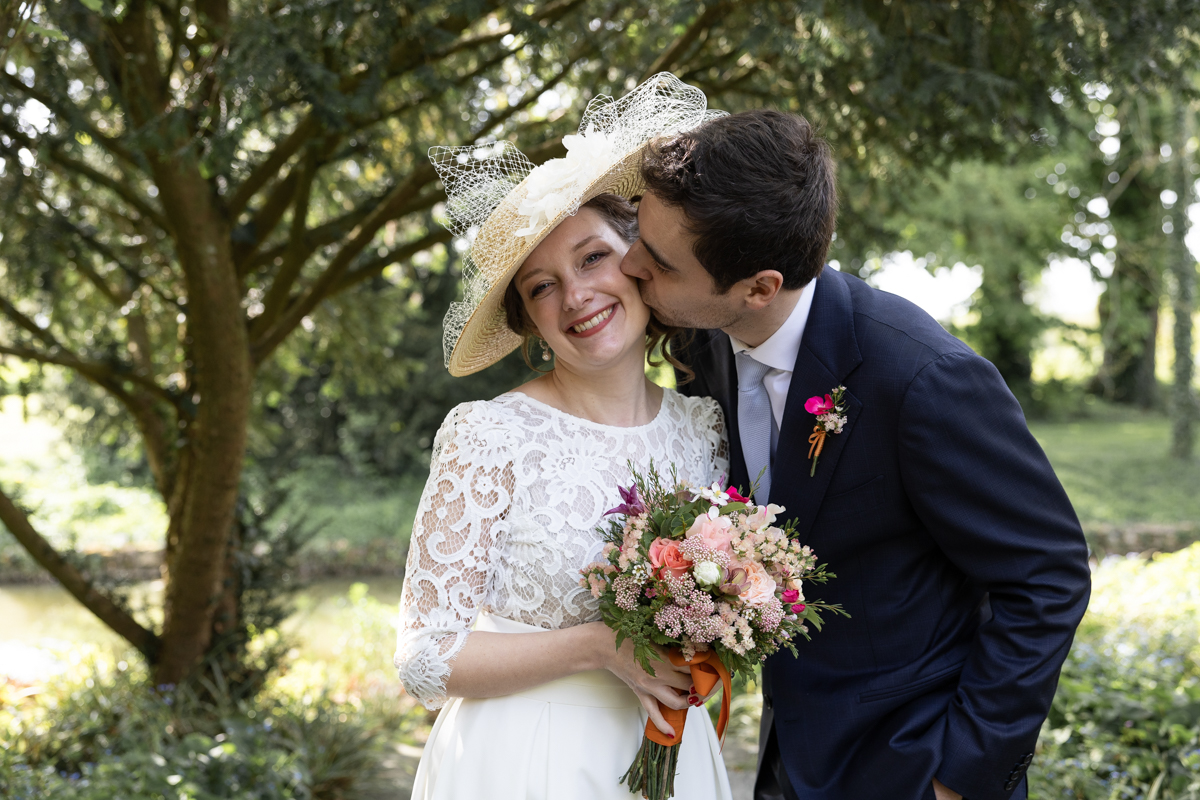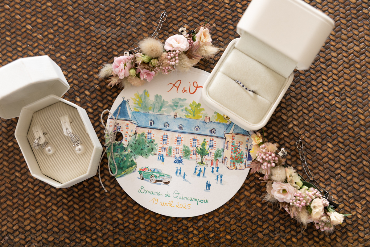 Robe et chapeau de mariée: Victoire – Chaussures : Jonak – Costume du marié : Chaussures : – Alliances et bague de fiançailles: Naravi – Fleurs: Le Fleuriste du Coin – Traiteur: Le Grand Chemin – Papeterie illustrée par Estelle B – DJ Marko – Lieu de réception: Domaine de Quincampoix (91)
