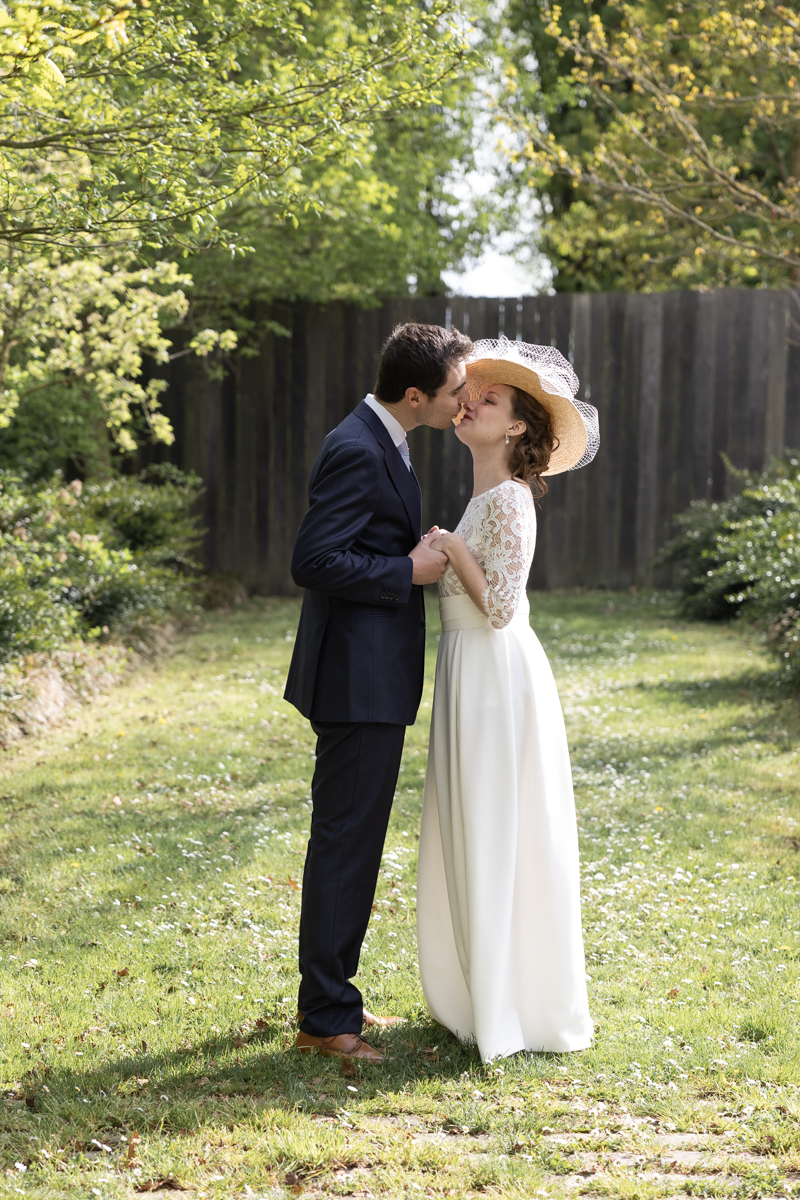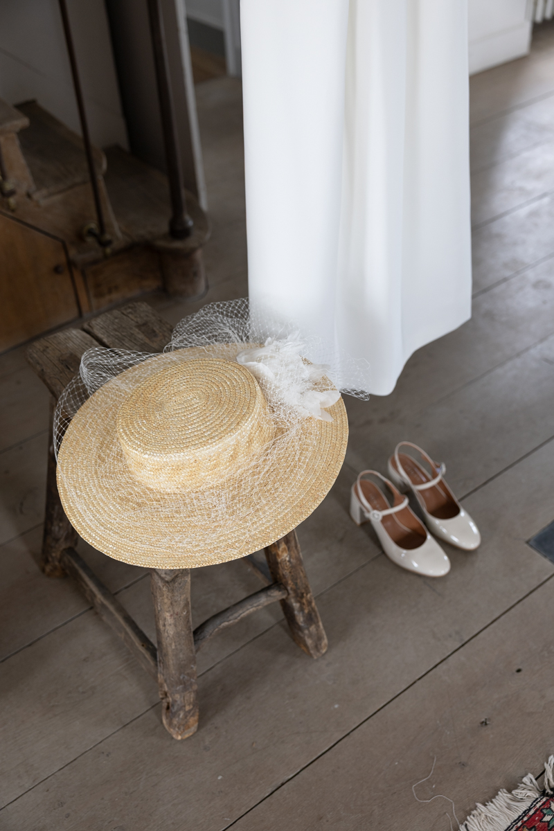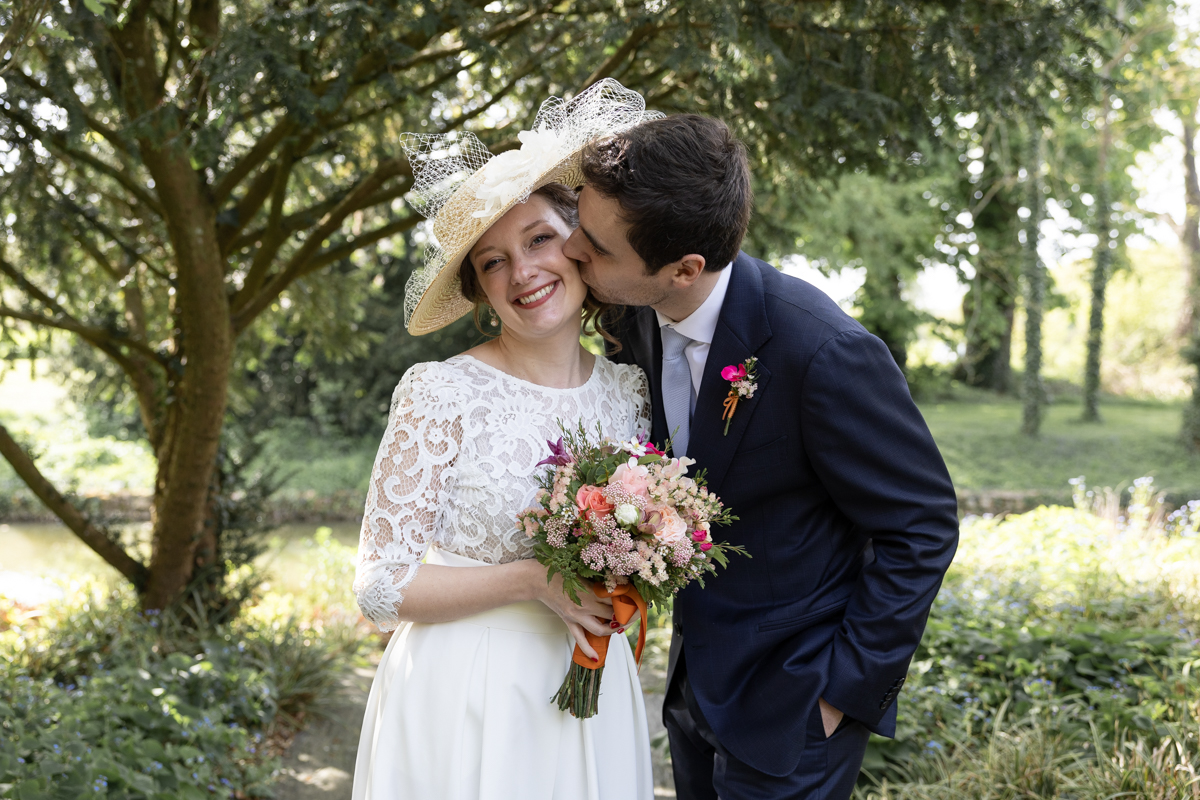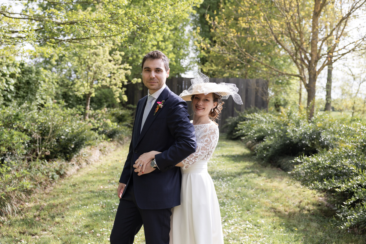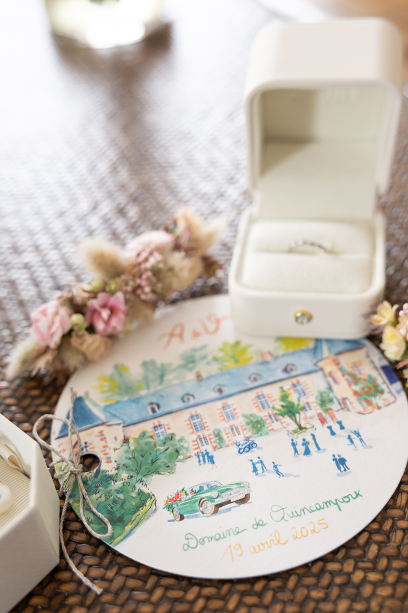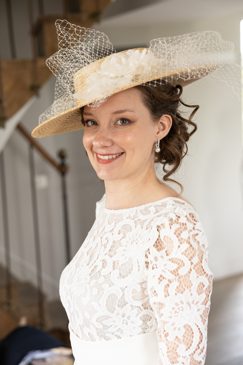 Robe et chapeau de mariée: Victoire – Chaussures : Jonak – Costume du marié : Chaussures : – Alliances et bague de fiançailles: Naravi – Fleurs: Le Fleuriste du Coin – Traiteur: Le Grand Chemin – Papeterie illustrée par Estelle B – DJ Marko – Lieu de réception: Domaine de Quincampoix (91)
