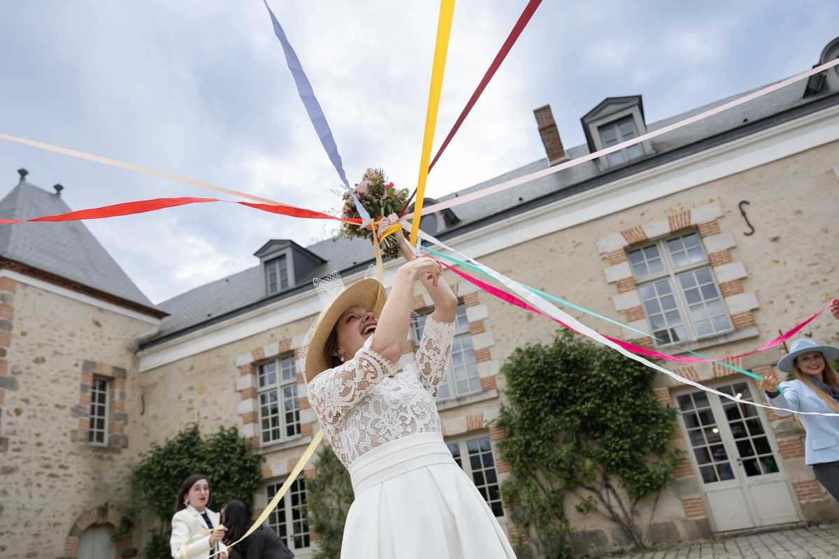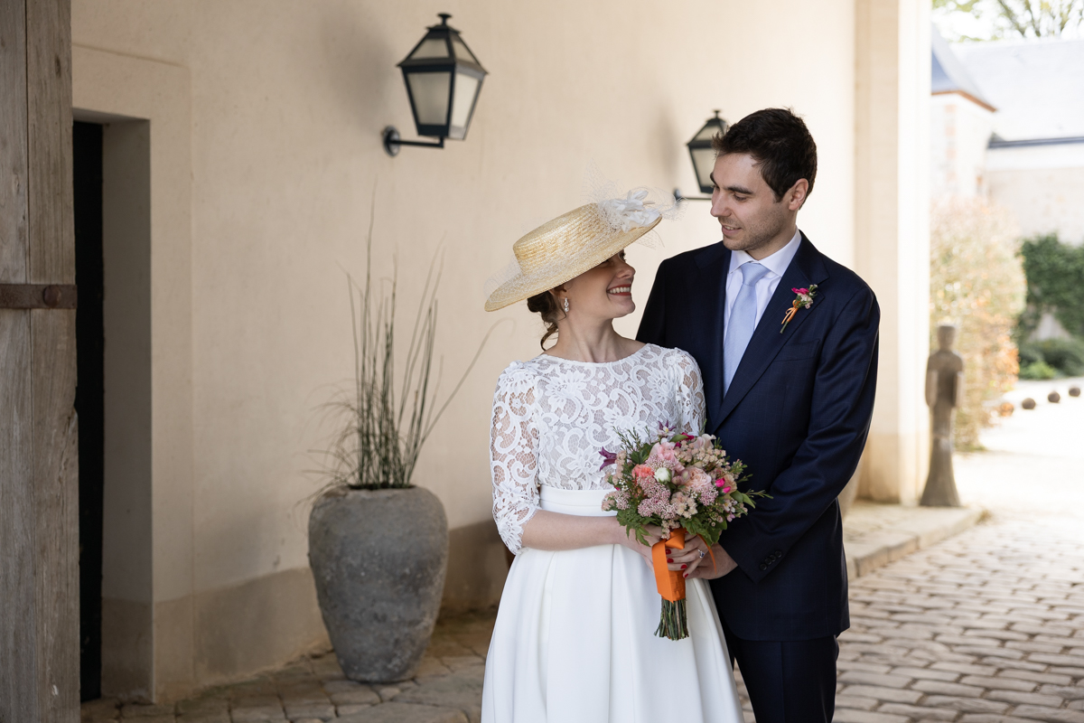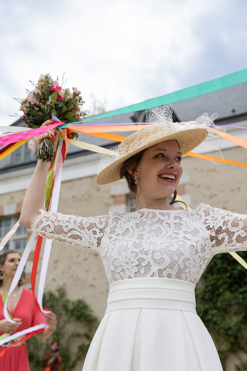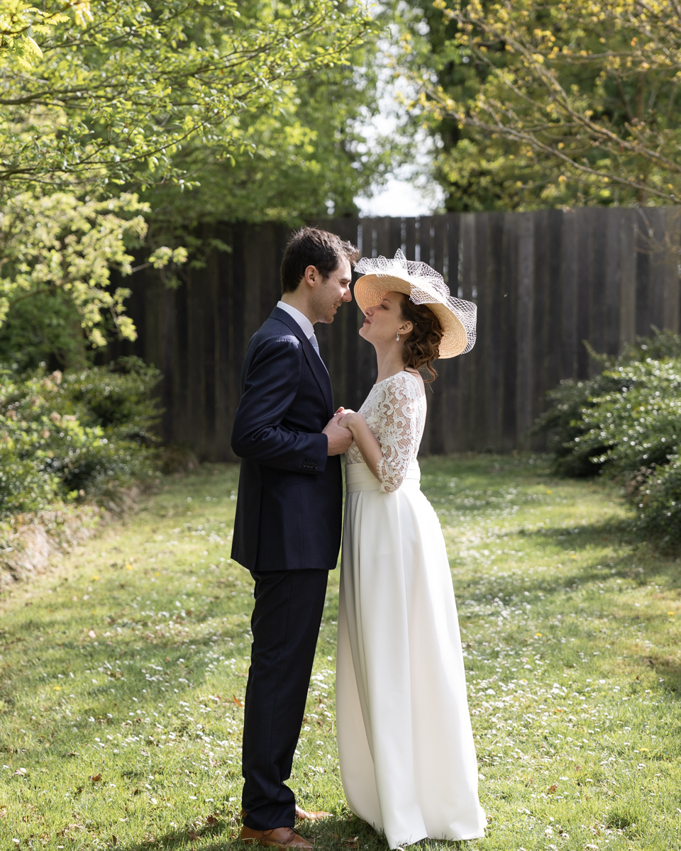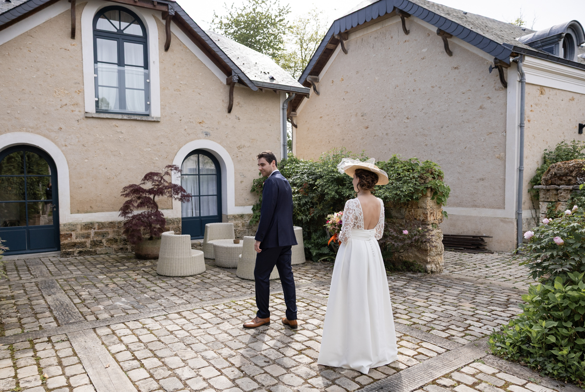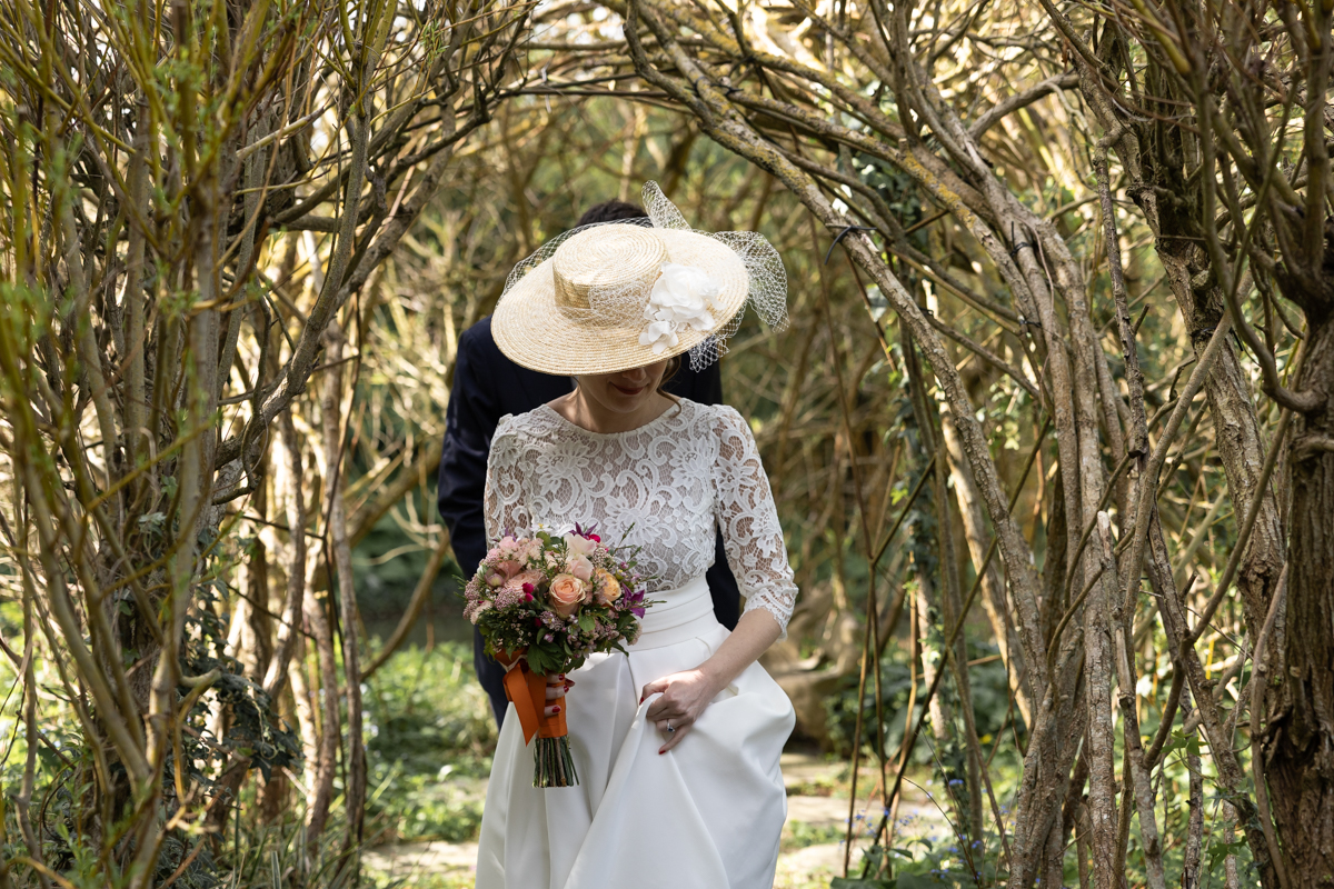 Robe et chapeau de mariée: Victoire – Chaussures : Jonak – Costume du marié : Chaussures : – Alliances et bague de fiançailles: Naravi – Fleurs: Le Fleuriste du Coin – Traiteur: Le Grand Chemin – Papeterie illustrée par Estelle B – DJ Marko – Lieu de réception: Domaine de Quincampoix (91)