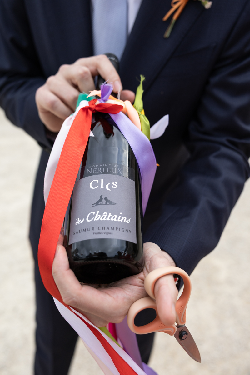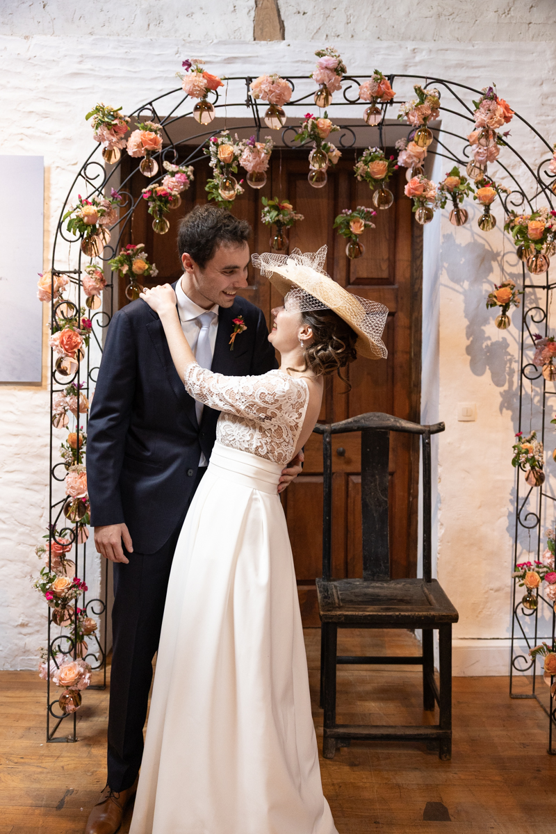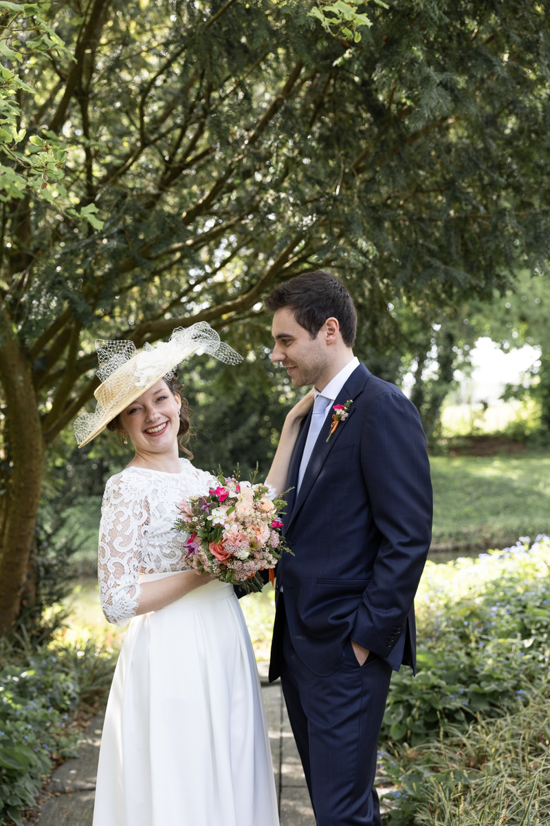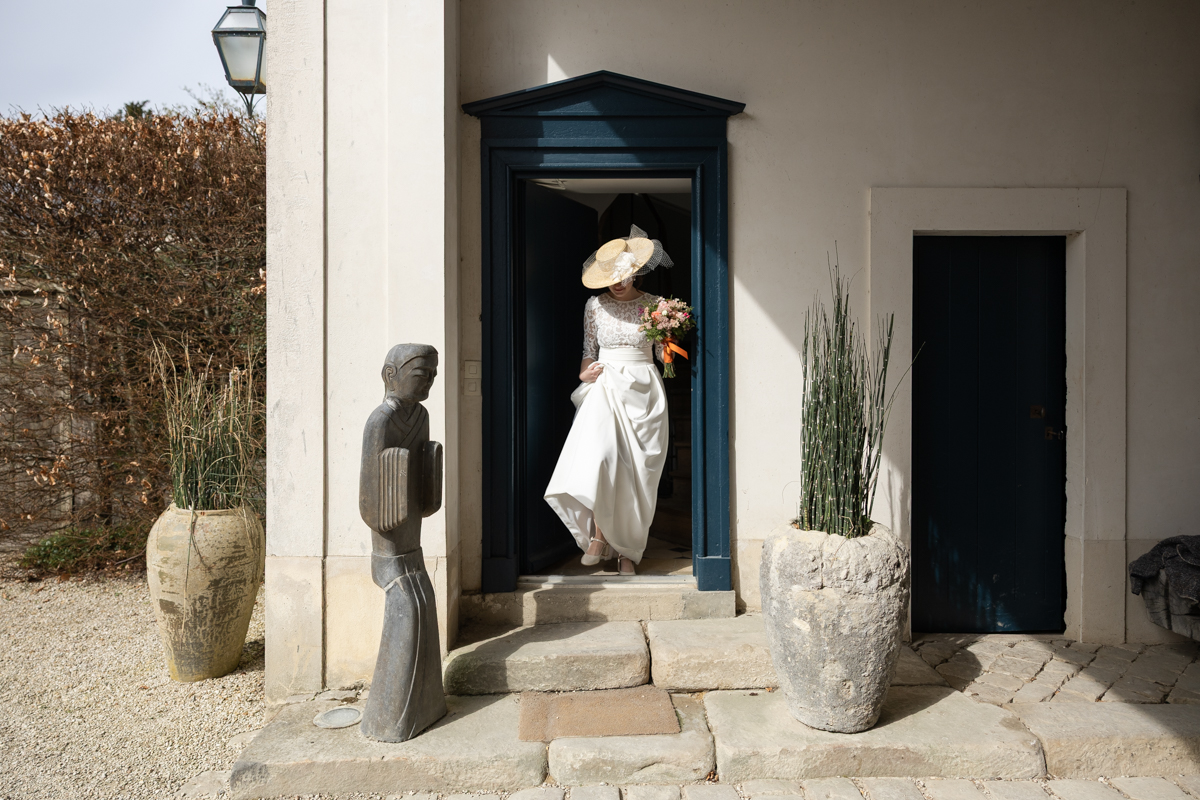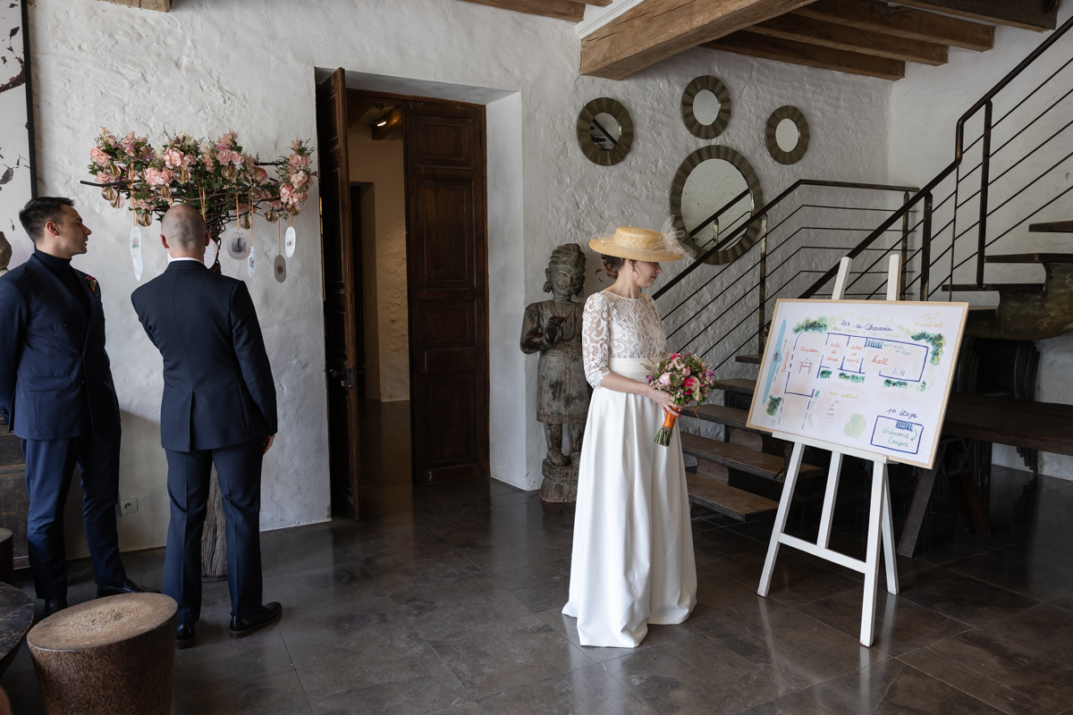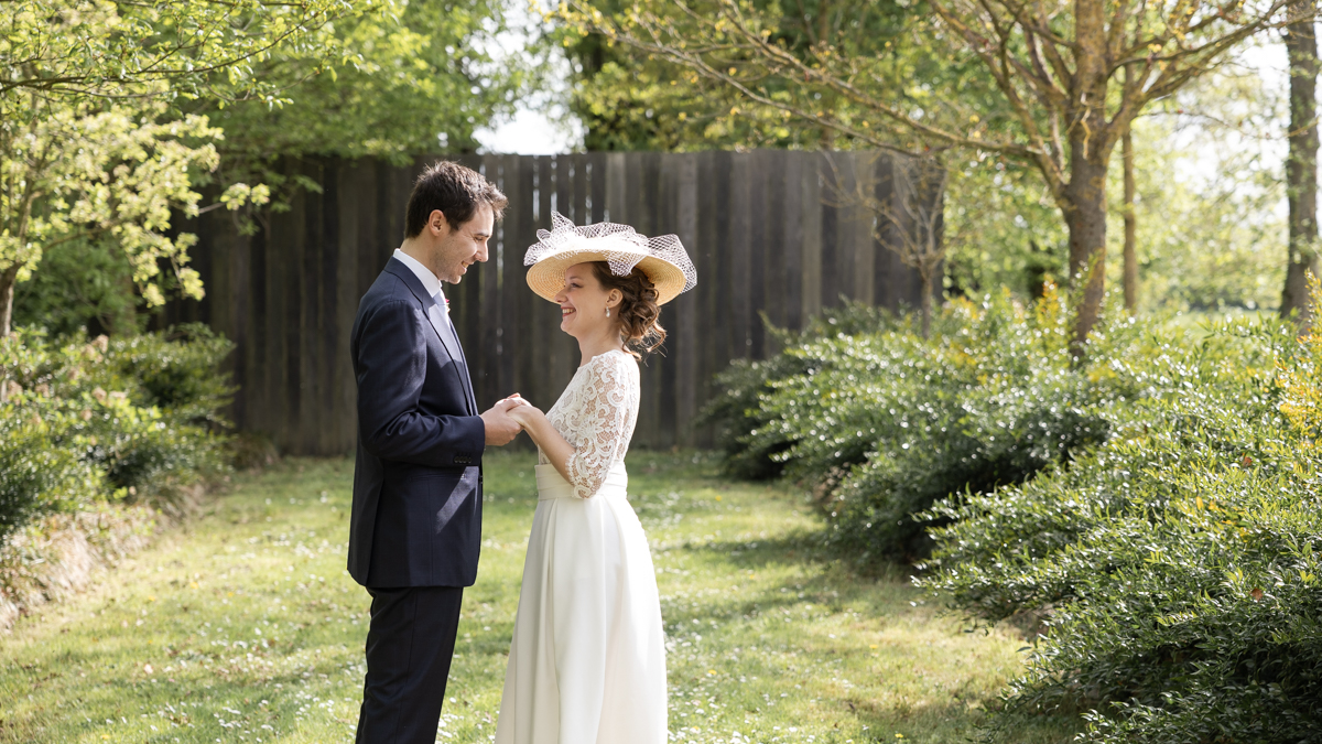 Robe et chapeau de mariée: Victoire – Chaussures : Jonak – Costume du marié : Chaussures : – Alliances et bague de fiançailles: Naravi – Fleurs: Le Fleuriste du Coin – Traiteur: Le Grand Chemin – Papeterie illustrée par Estelle B – DJ Marko – Lieu de réception: Domaine de Quincampoix (91)