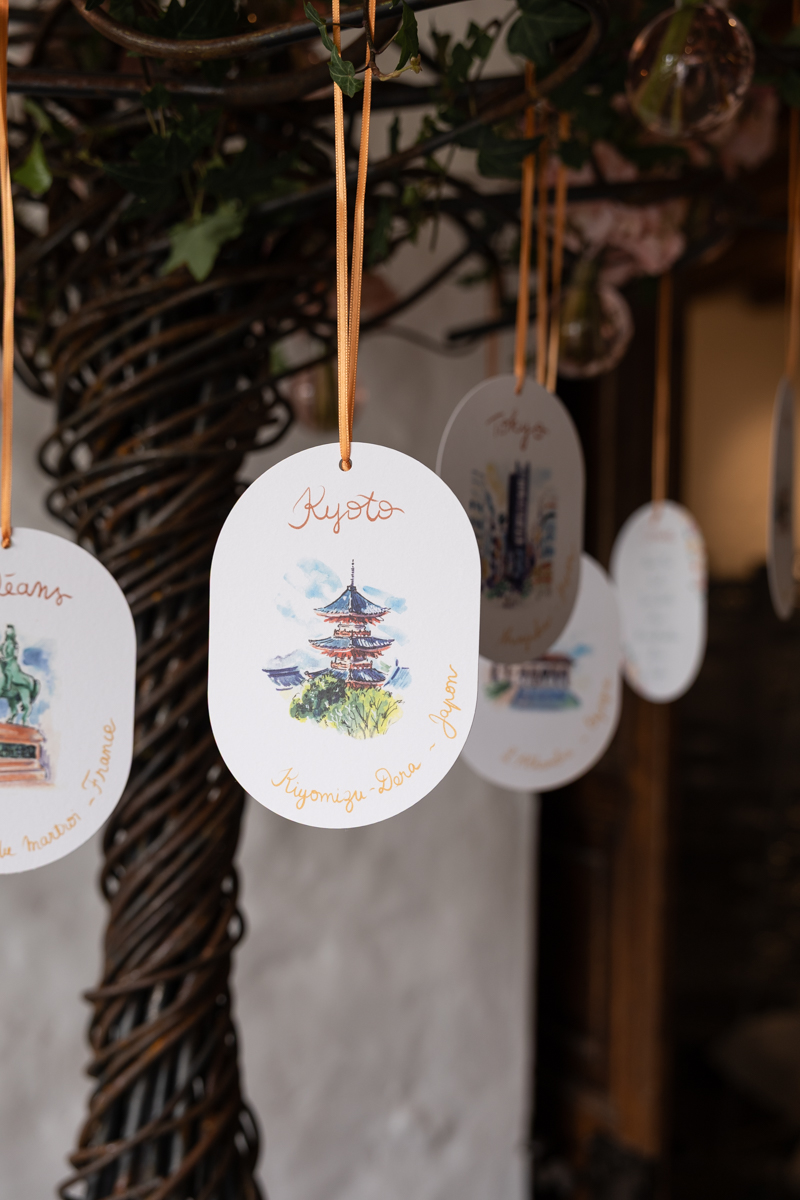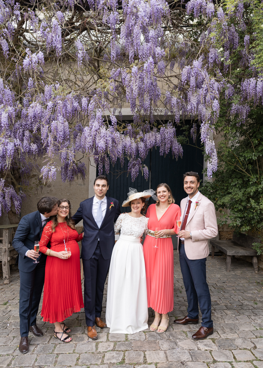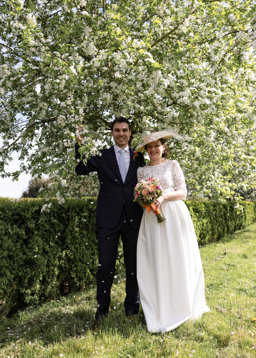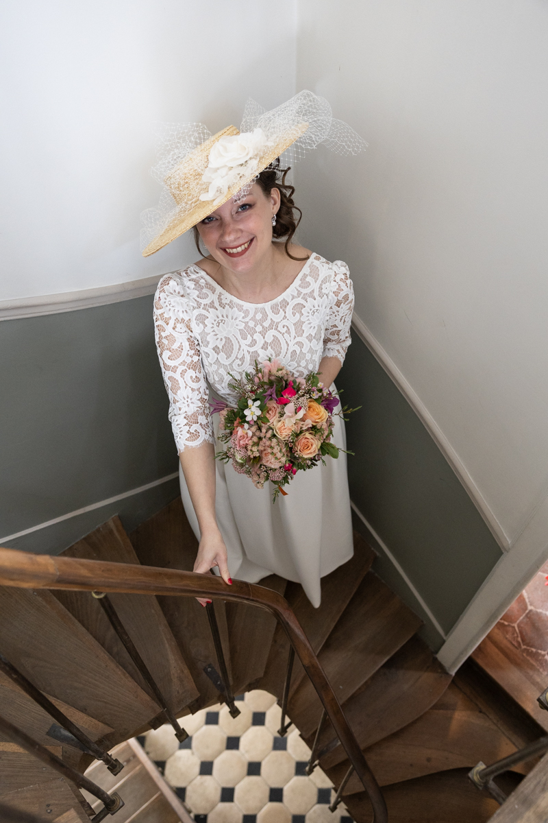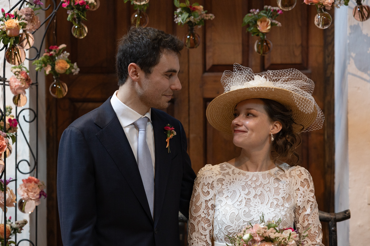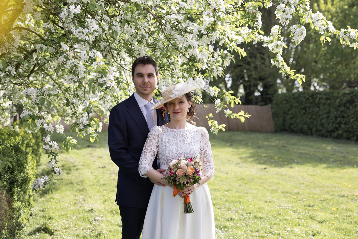 Robe et chapeau de mariée: Victoire – Chaussures : Jonak – Costume du marié : Chaussures : – Alliances et bague de fiançailles: Naravi – Fleurs: Le Fleuriste du Coin – Traiteur: Le Grand Chemin – Papeterie illustrée par Estelle B – DJ Marko – Lieu de réception: Domaine de Quincampoix (91)
