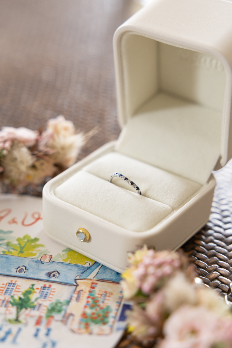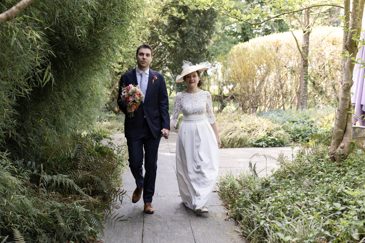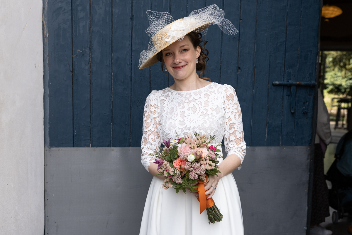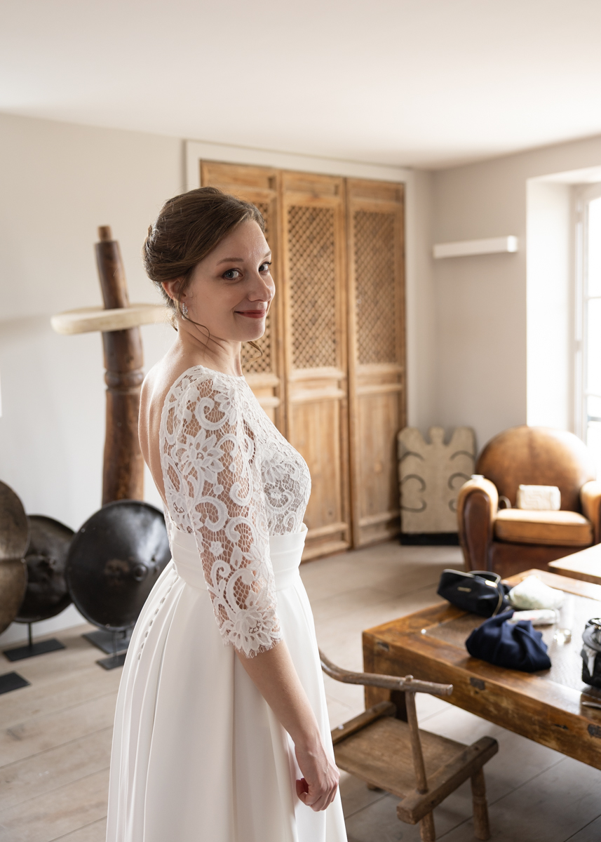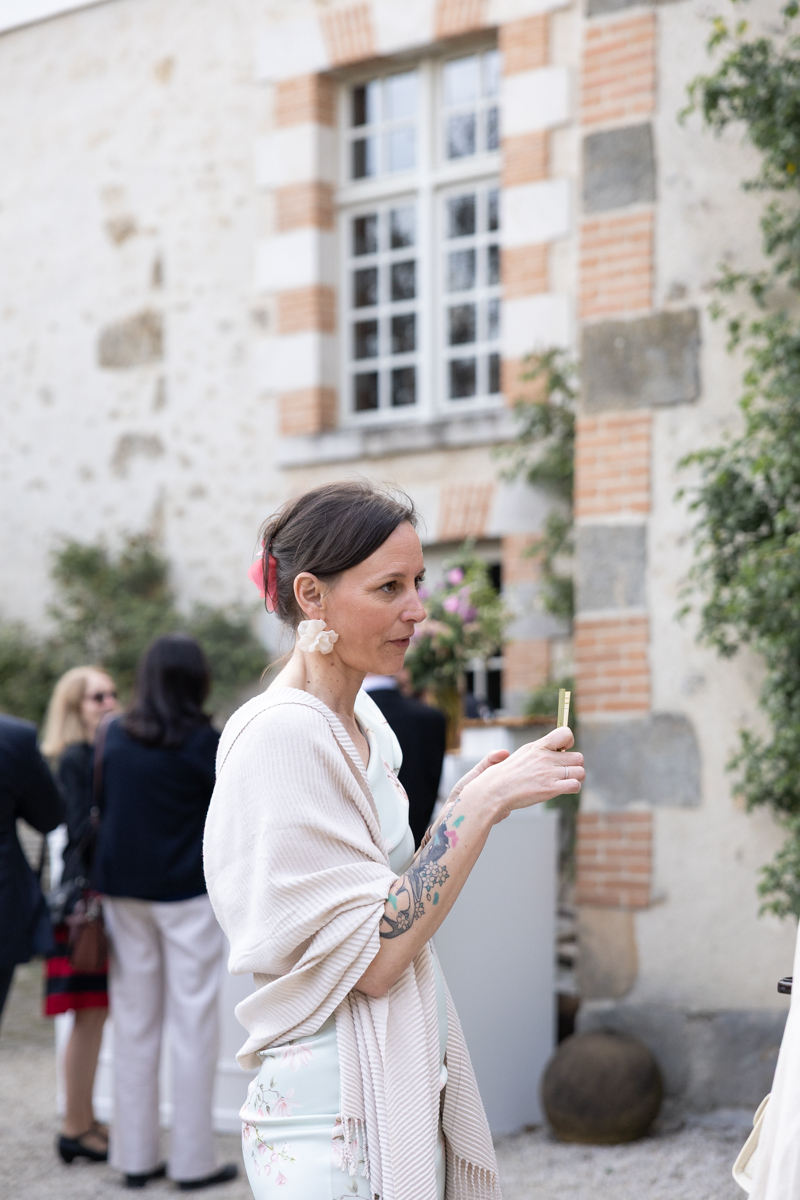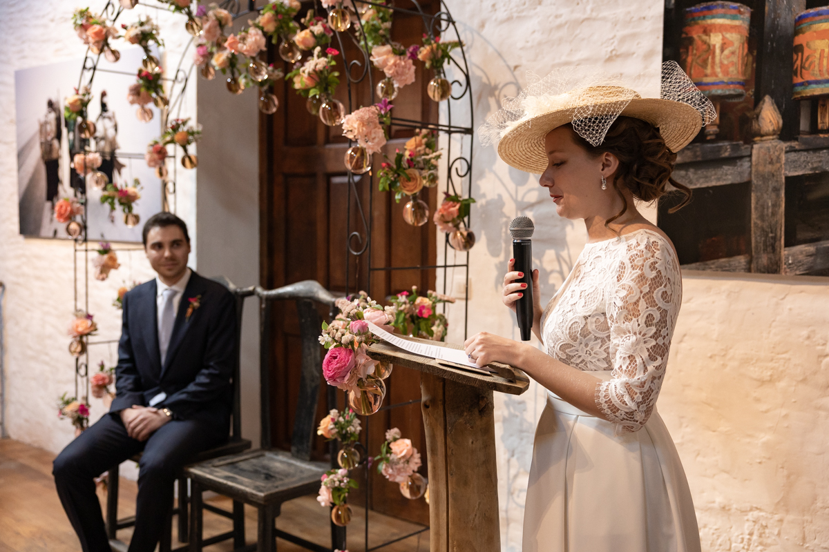 Robe et chapeau de mariée: Victoire – Chaussures : Jonak – Costume du marié : Chaussures : – Alliances et bague de fiançailles: Naravi – Fleurs: Le Fleuriste du Coin – Traiteur: Le Grand Chemin – Papeterie illustrée par Estelle B – DJ Marko – Lieu de réception: Domaine de Quincampoix (91)