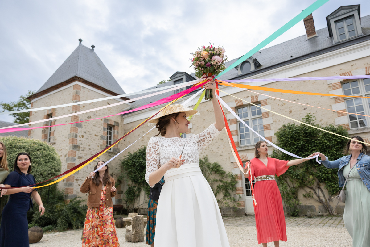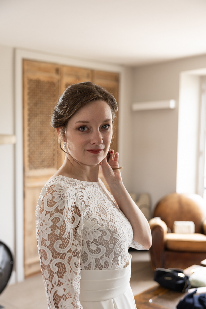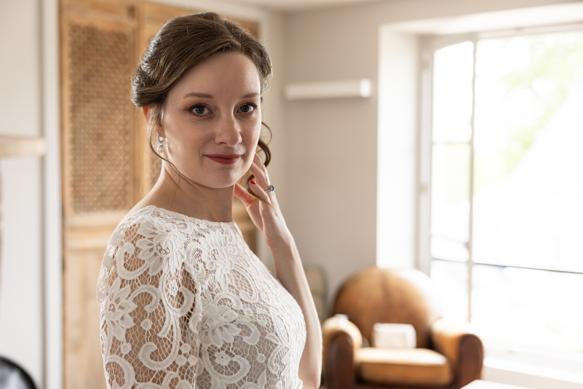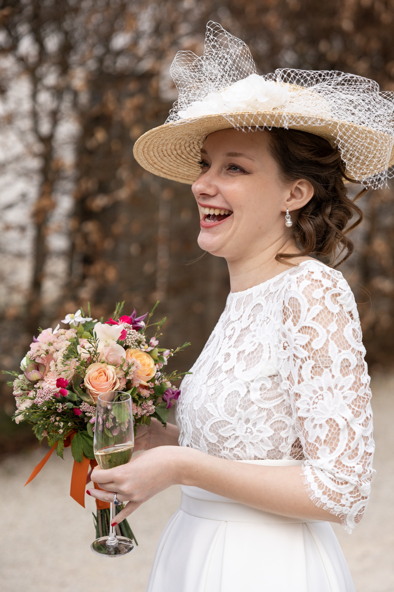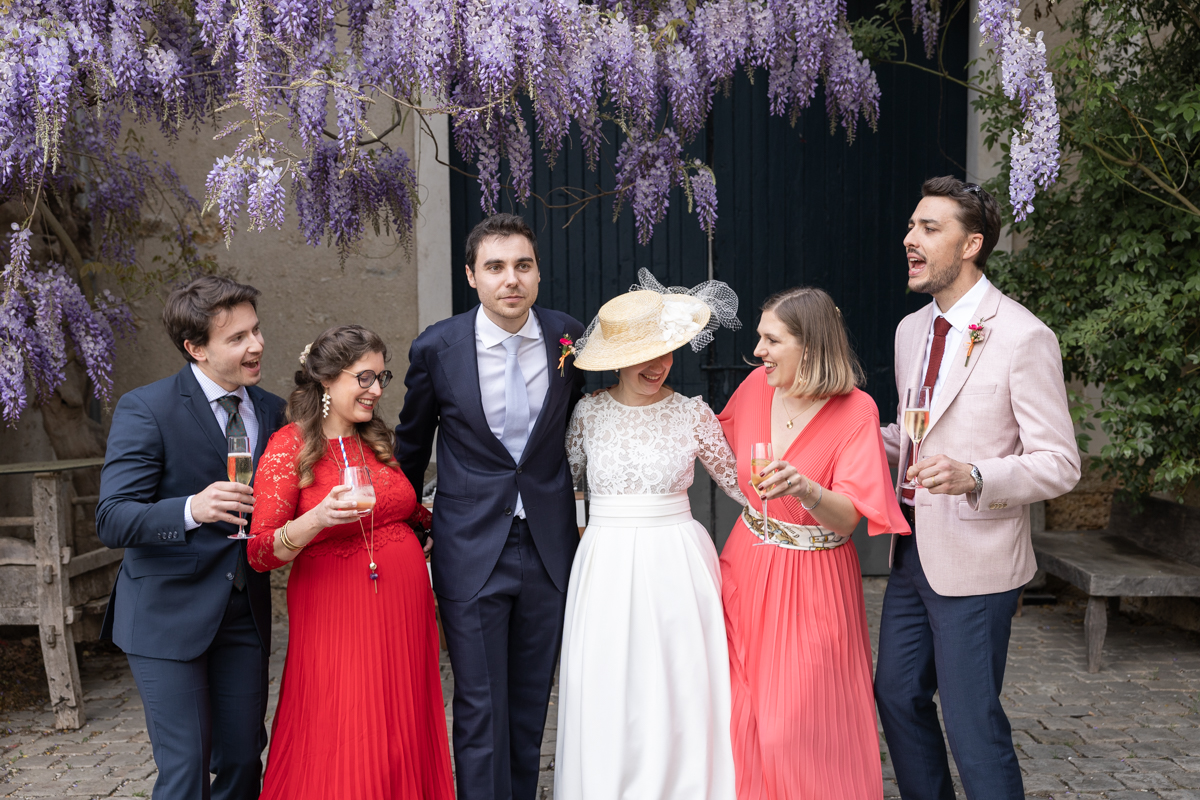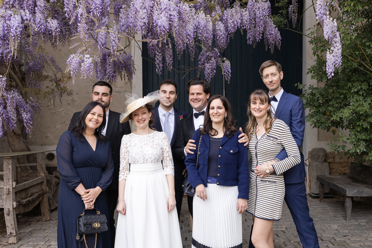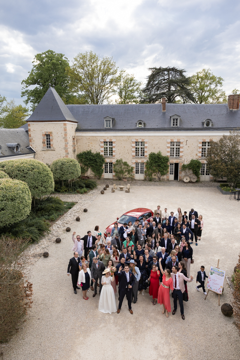 Robe et chapeau de mariée: Victoire – Chaussures : Jonak – Costume du marié : Chaussures : – Alliances et bague de fiançailles: Naravi – Fleurs: Le Fleuriste du Coin – Traiteur: Le Grand Chemin – Papeterie illustrée par Estelle B – DJ Marko – Lieu de réception: Domaine de Quincampoix (91)