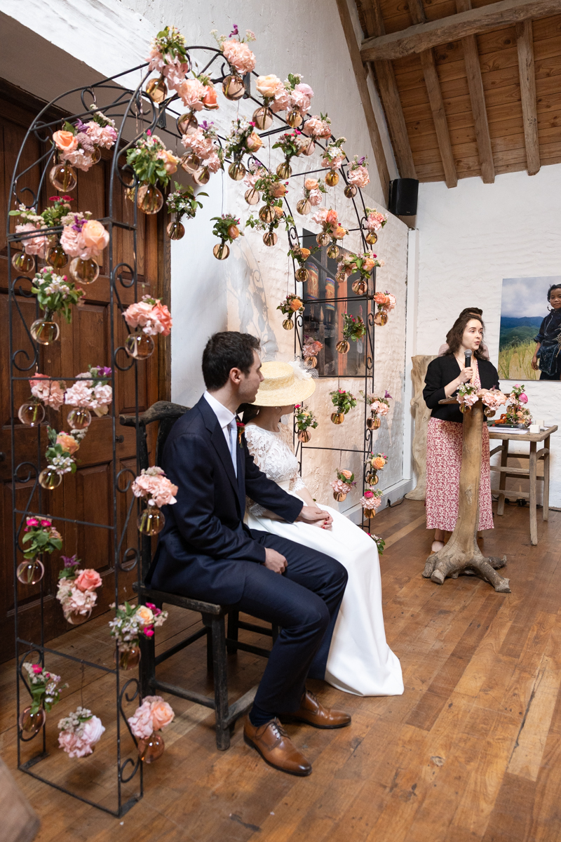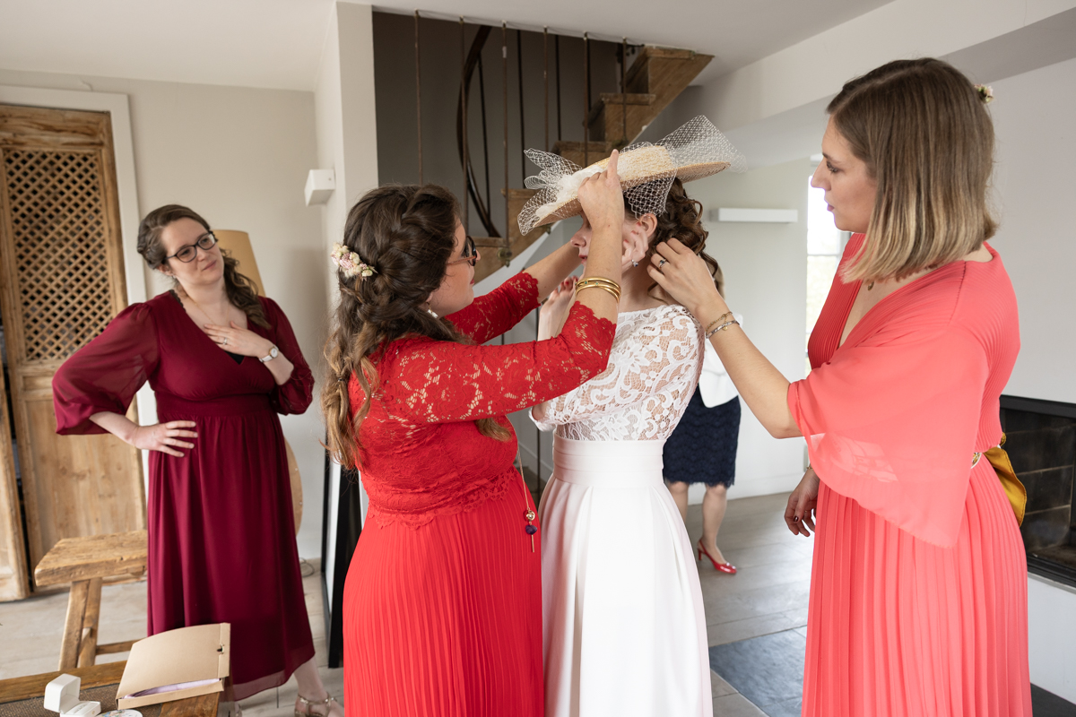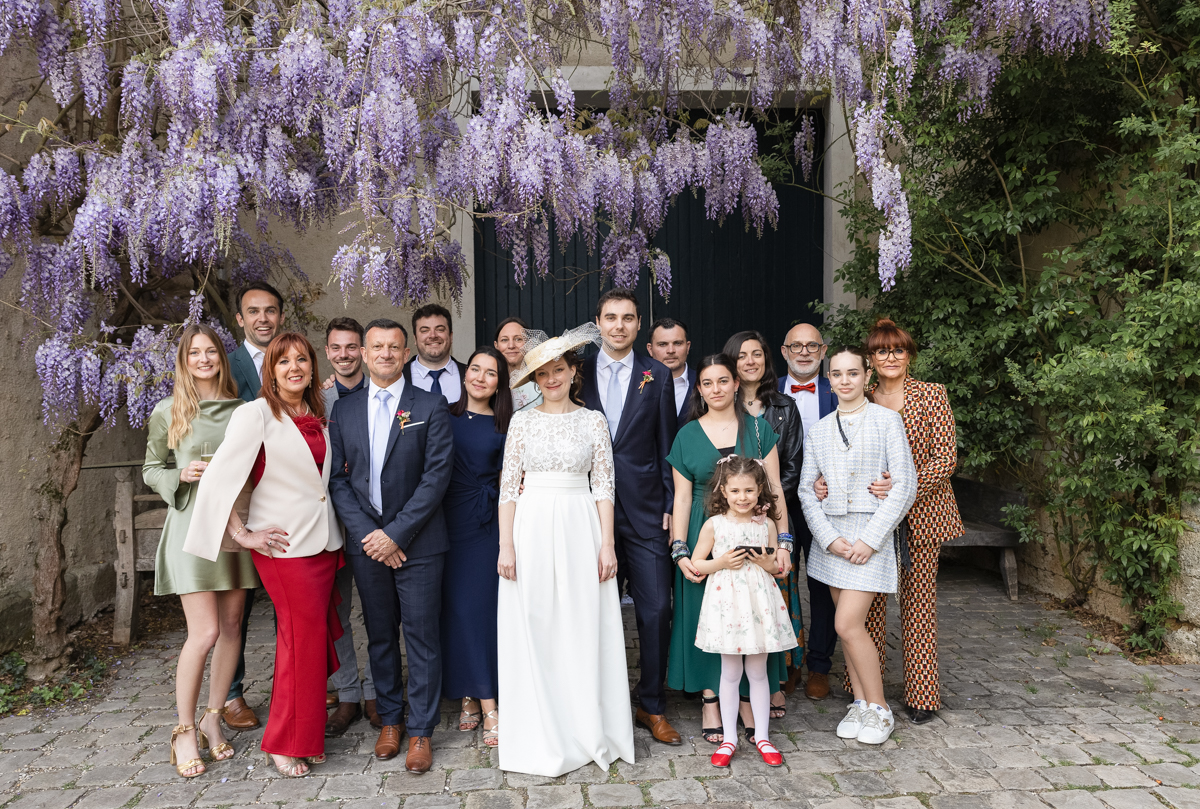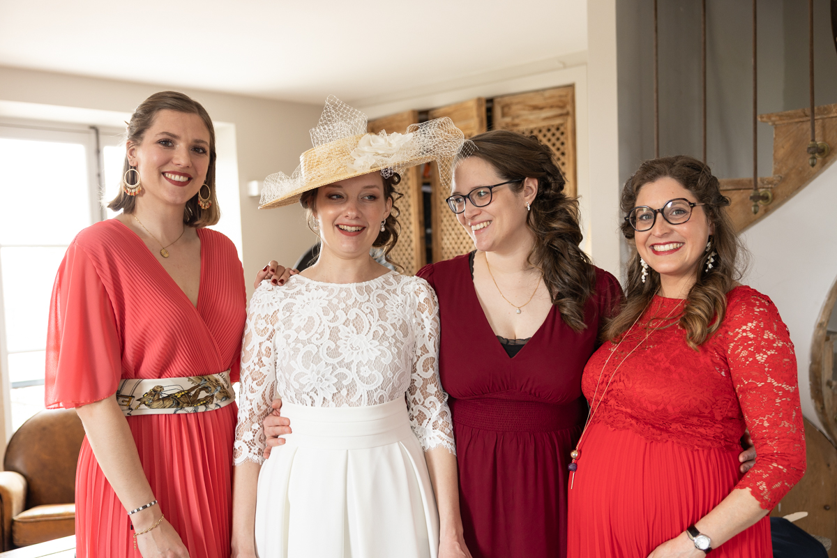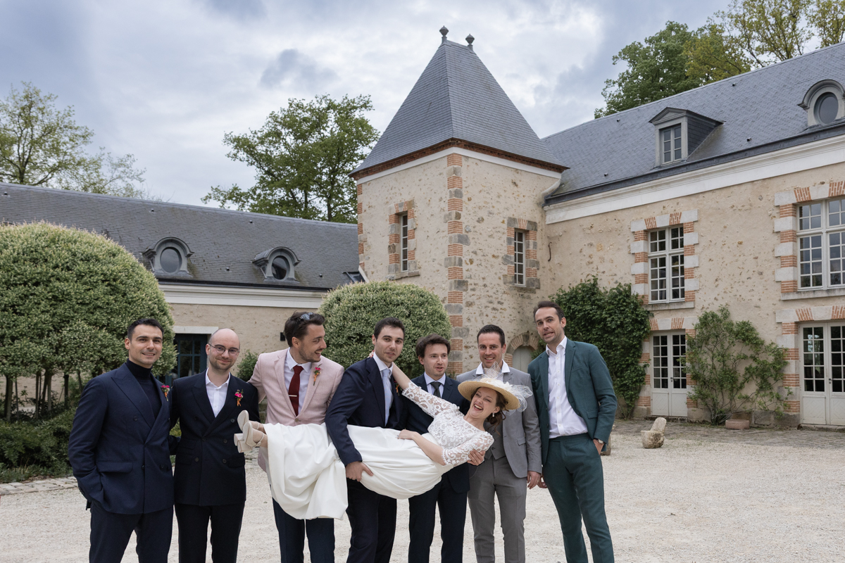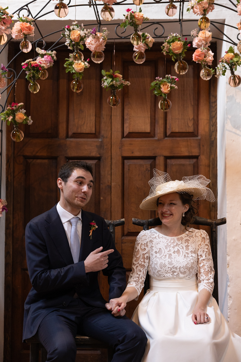 Robe et chapeau de mariée: Victoire – Chaussures : Jonak – Costume du marié : Chaussures : – Alliances et bague de fiançailles: Naravi – Fleurs: Le Fleuriste du Coin – Traiteur: Le Grand Chemin – Papeterie illustrée par Estelle B – DJ Marko – Lieu de réception: Domaine de Quincampoix (91)