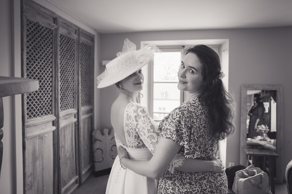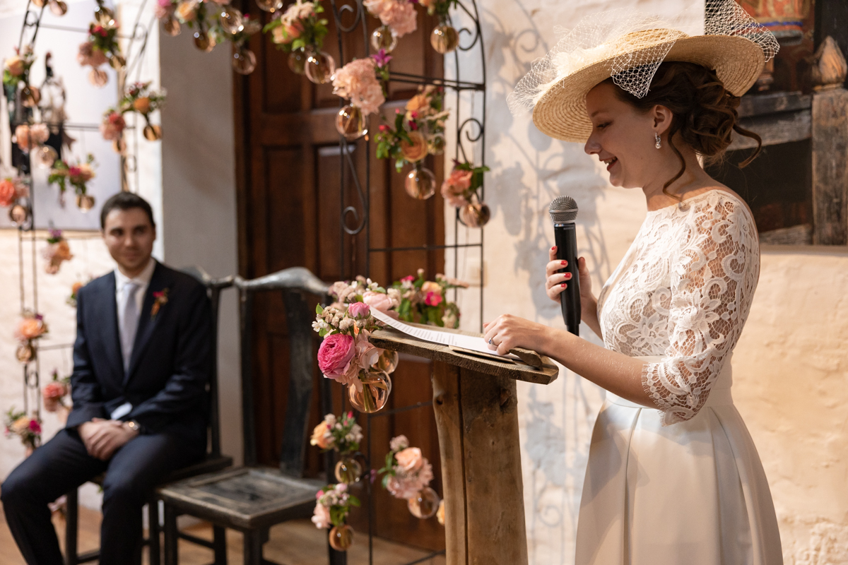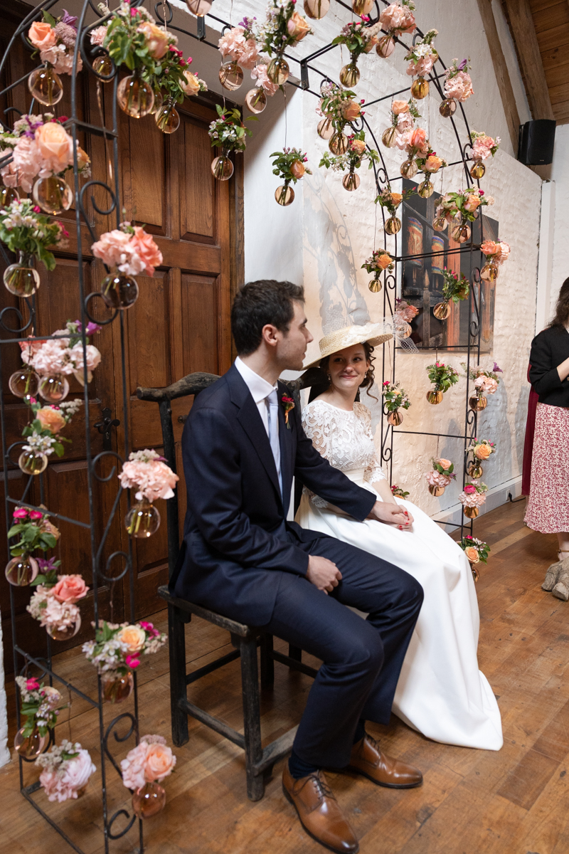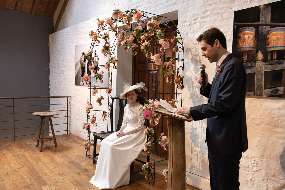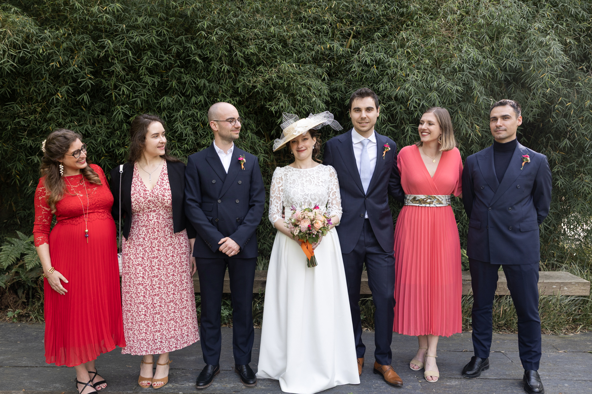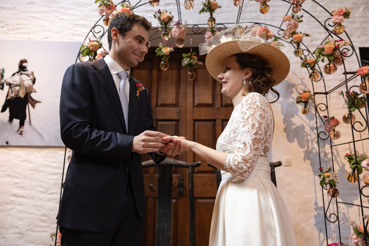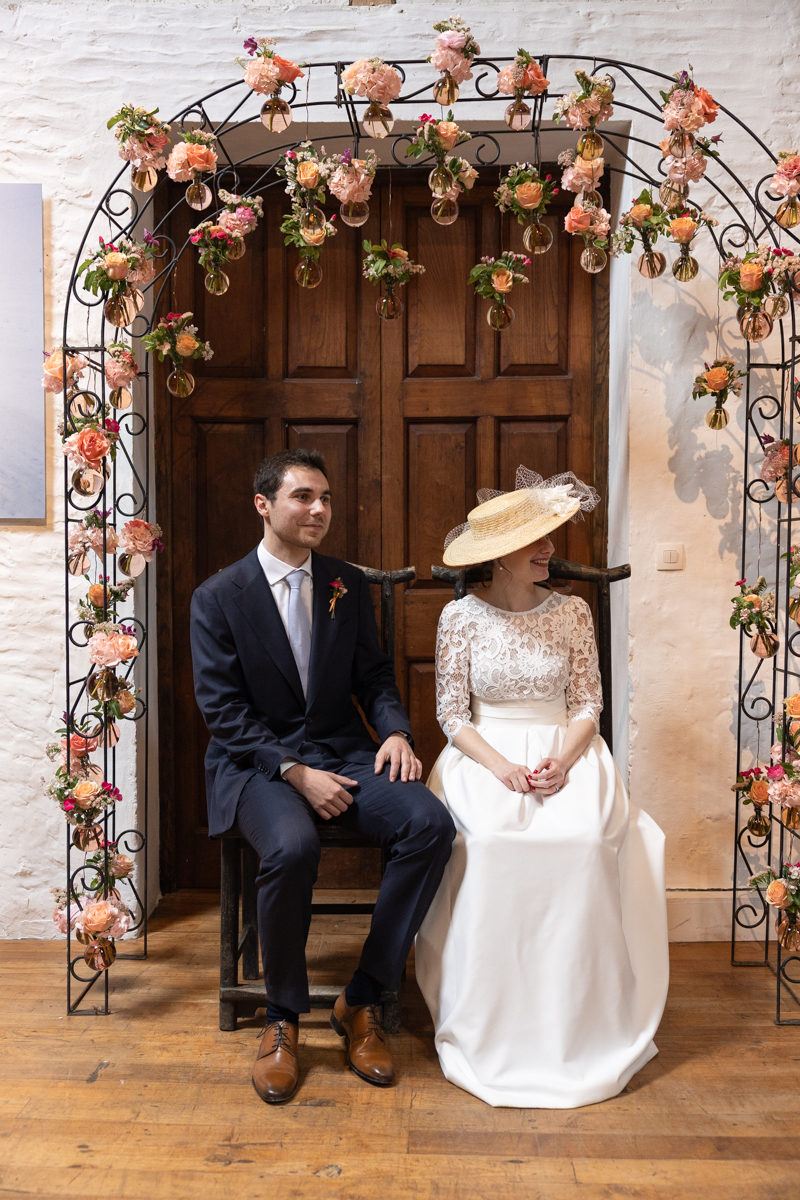 Robe et chapeau de mariée: Victoire – Chaussures : Jonak – Costume du marié : Chaussures : – Alliances et bague de fiançailles: Naravi – Fleurs: Le Fleuriste du Coin – Traiteur: Le Grand Chemin – Papeterie illustrée par Estelle B – DJ Marko – Lieu de réception: Domaine de Quincampoix (91)