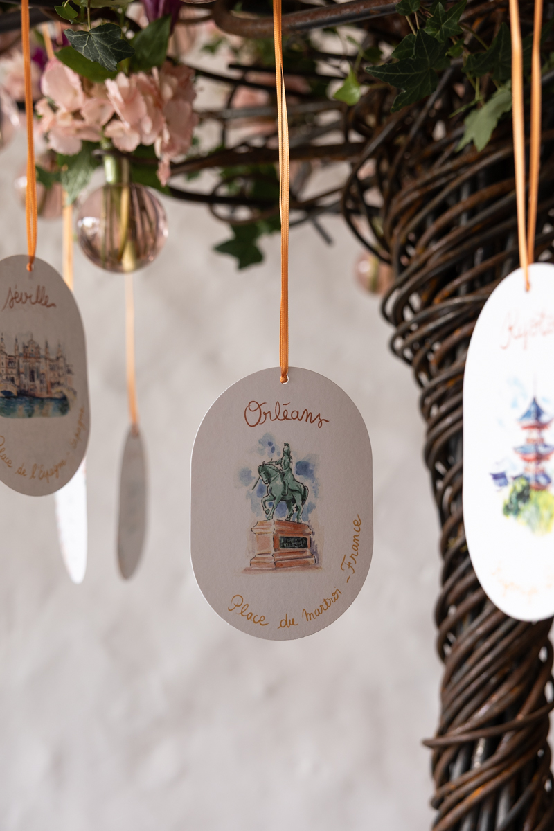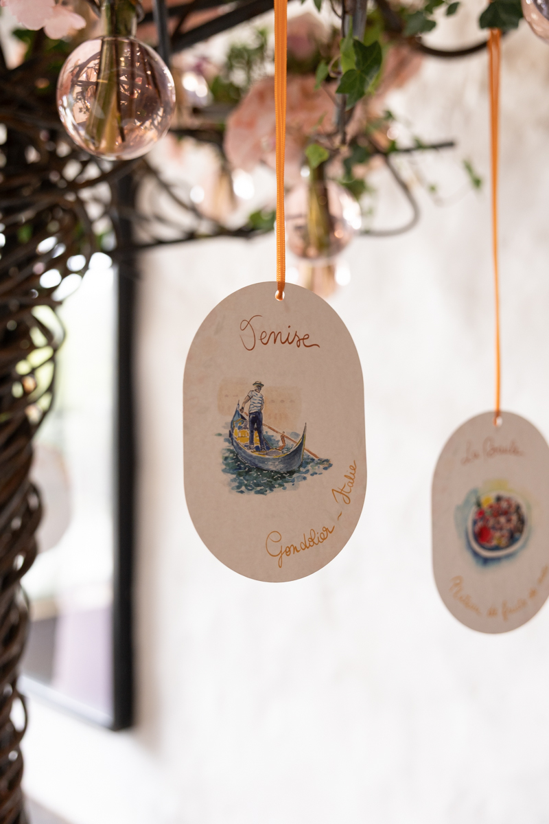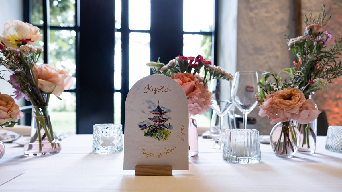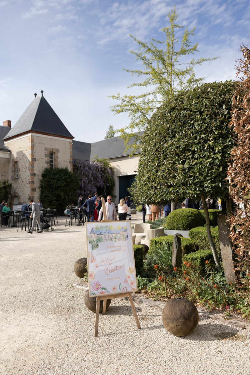 Plusieurs mois après leur mariage civil Astrid et Valentin retrouvaient leurs proches au Domaine de Quincampoix à l’occasion de leur cérémonie laïque, pour laquelle une amie avait dessiné les superbes nombreux motifs qui ornaient le plan des tables, le faire-part, l’affiche de bienvenue.