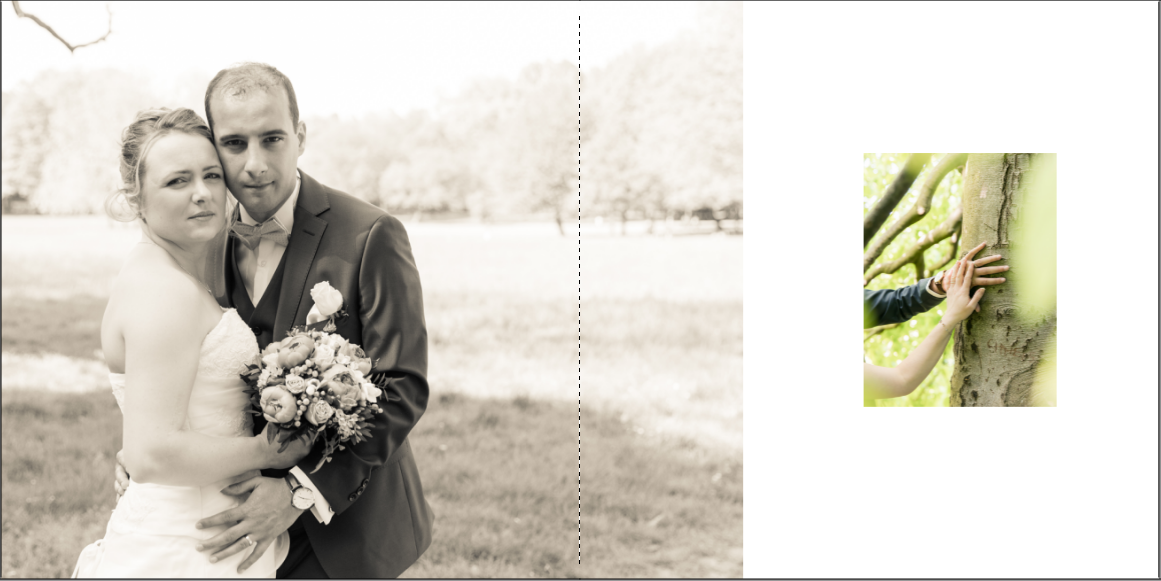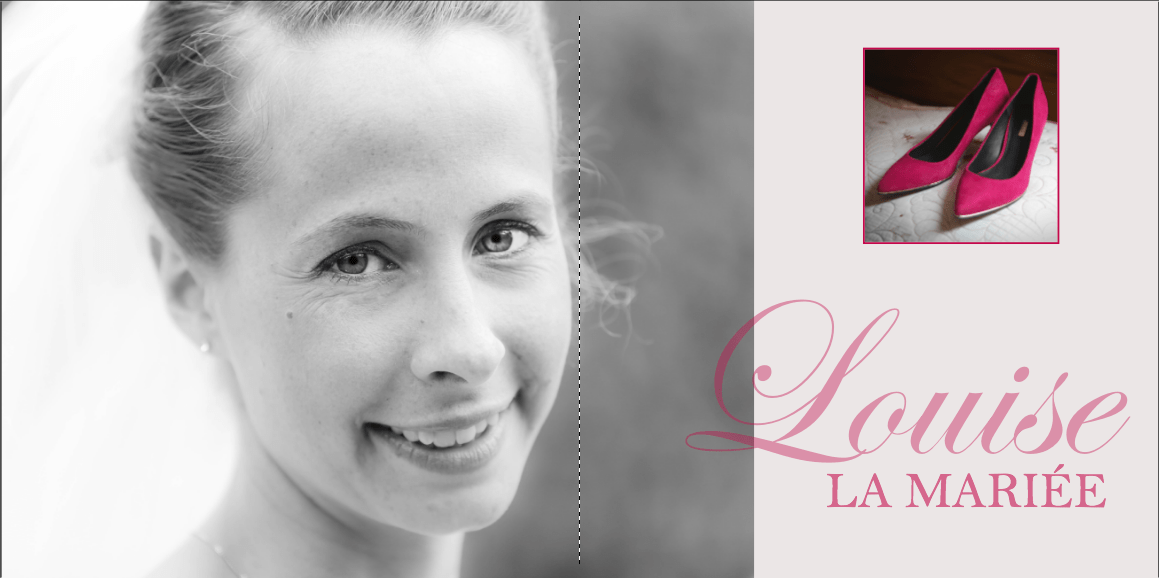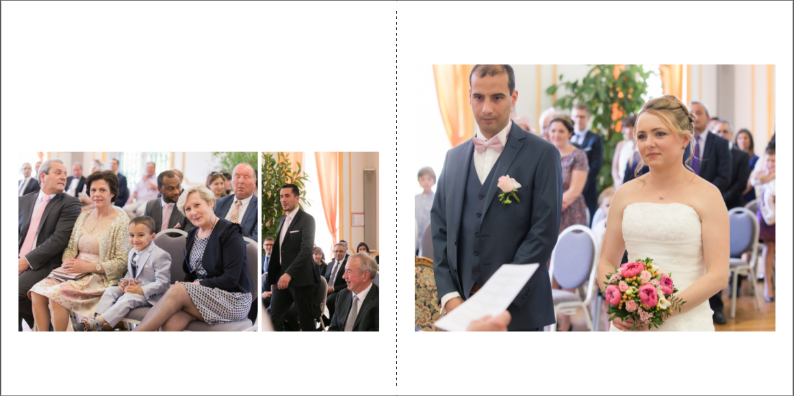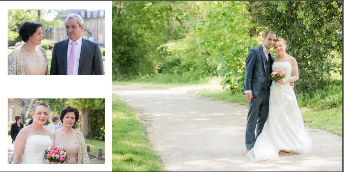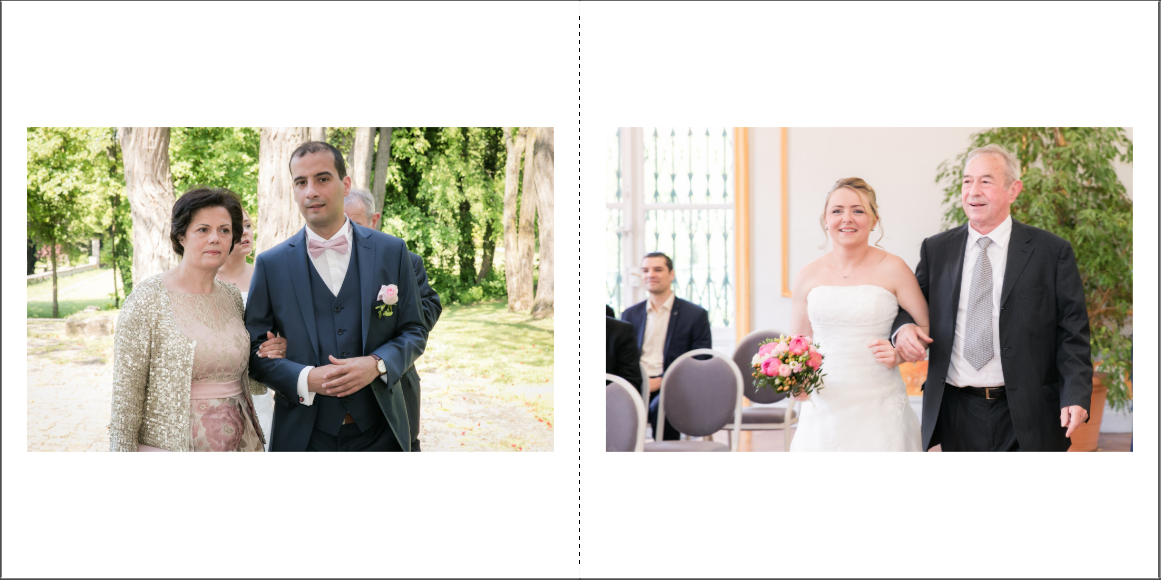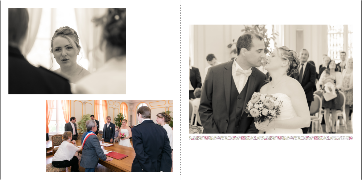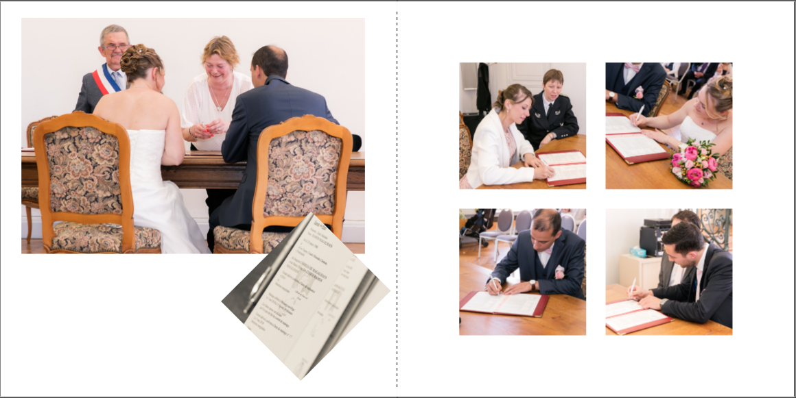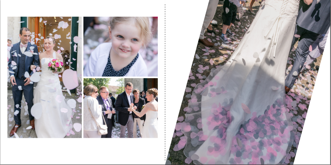 Je prends grand plaisir à composer les pages, en alternant vues d’ensemble, portraits et détails afin de garder un certain rythme. Je propose systématiquement le portrait des mariés, le bouquet, la robe, les parents… mais reste à votre écoute pour la personnalisation des autres pages. La mise en page de tout l’album se fait manuellement exclusivement, à partir des photos que vous aurez choisies.