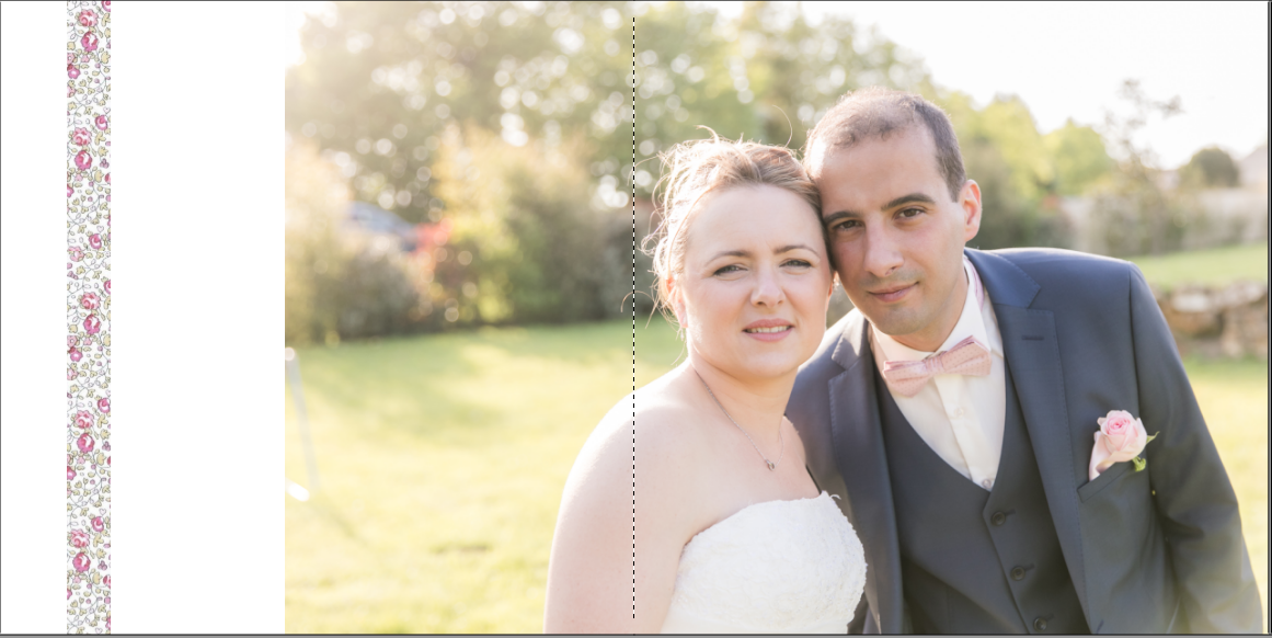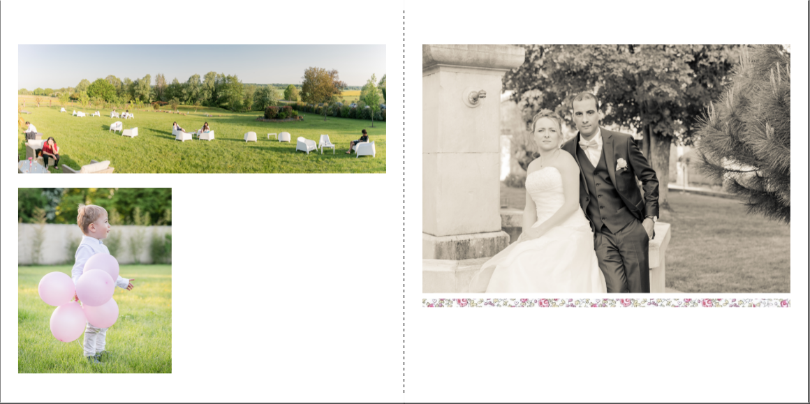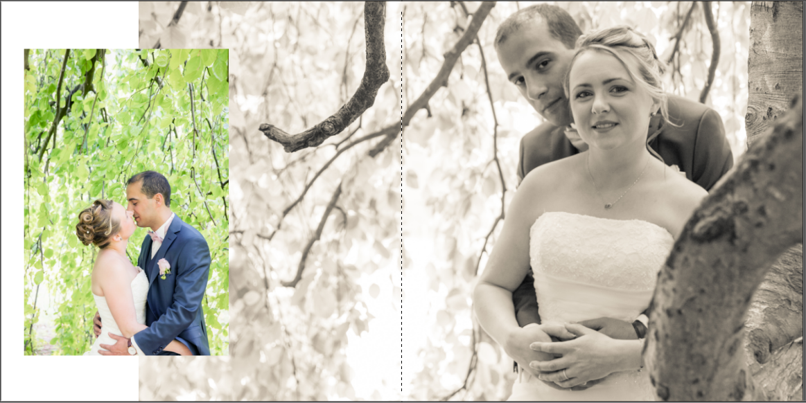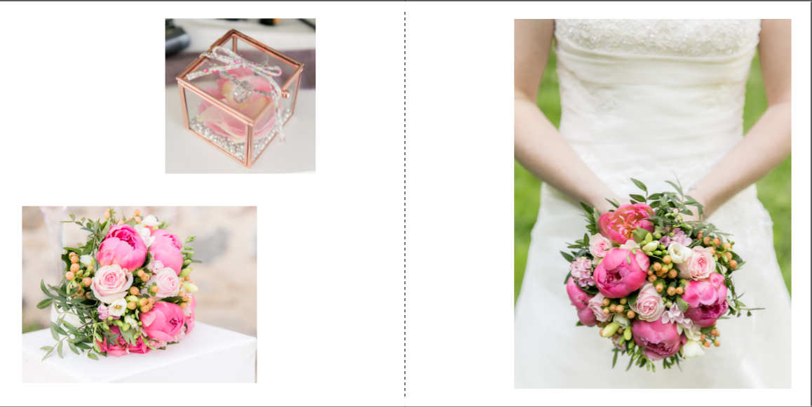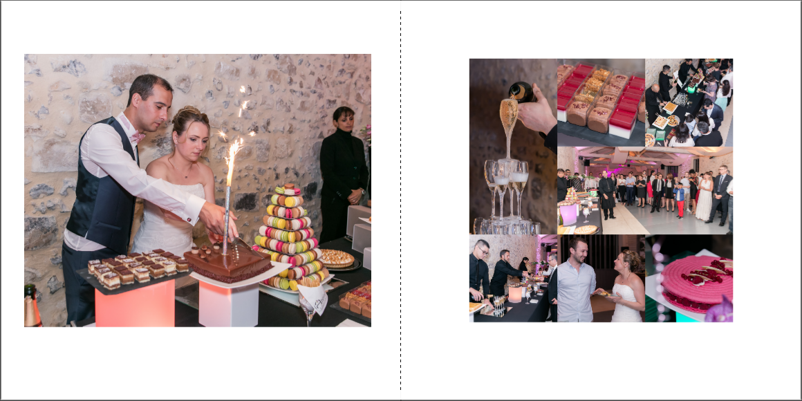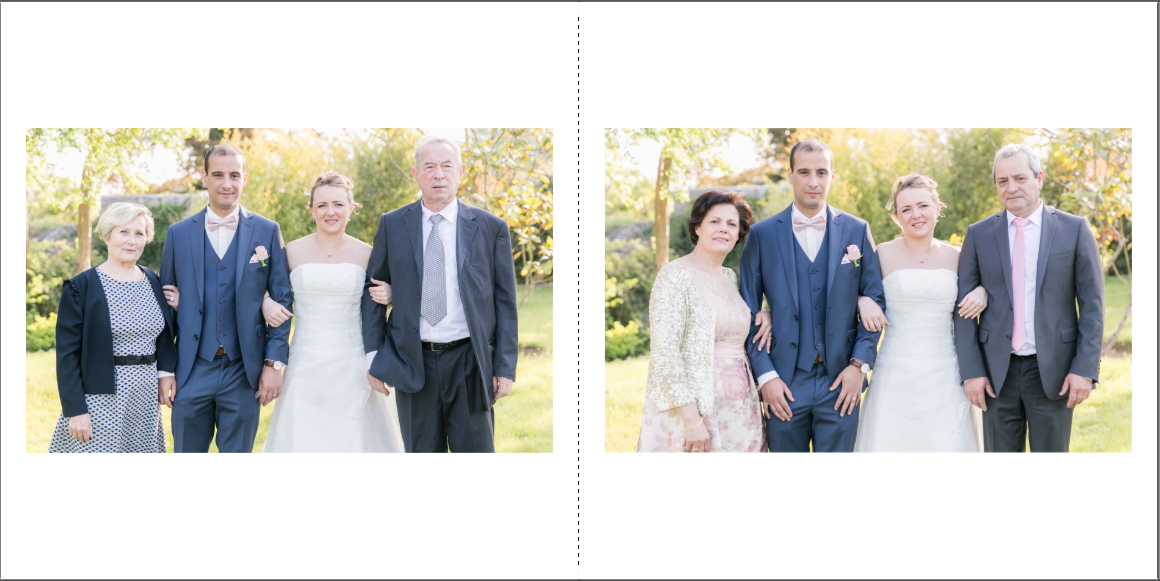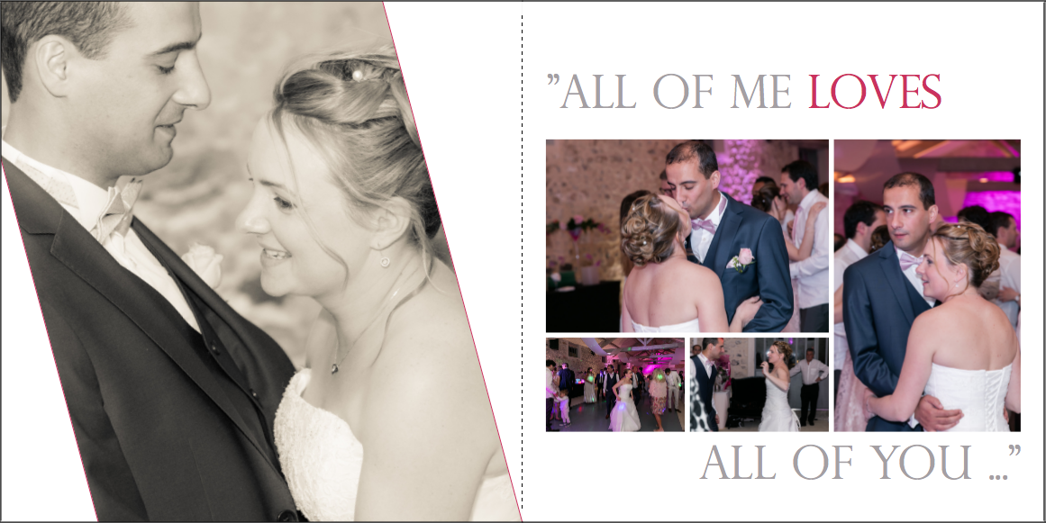 Je prends grand plaisir à composer les pages, en alternant vues d’ensemble, portraits et détails afin de garder un certain rythme. Je propose systématiquement le portrait des mariés, le bouquet, la robe, les parents… mais reste à votre écoute pour la personnalisation des autres pages. La mise en page de tout l’album se fait manuellement exclusivement, à partir des photos que vous aurez choisies.