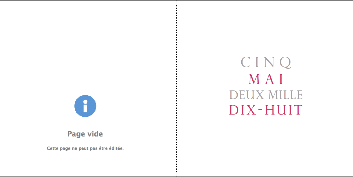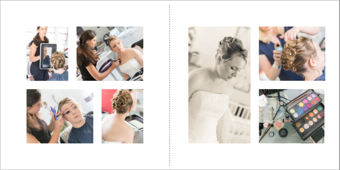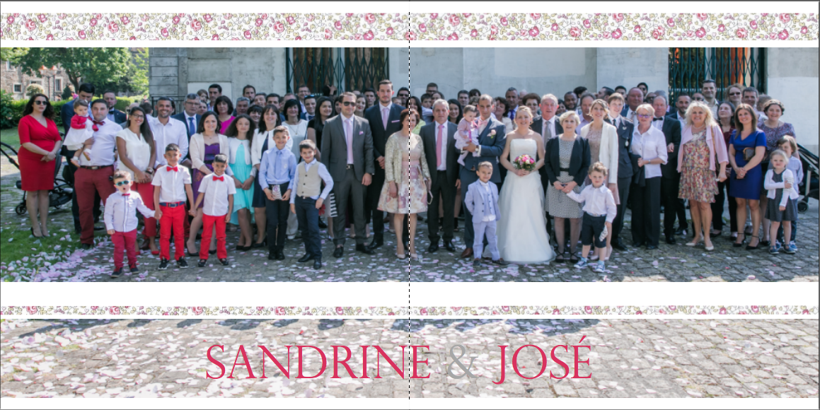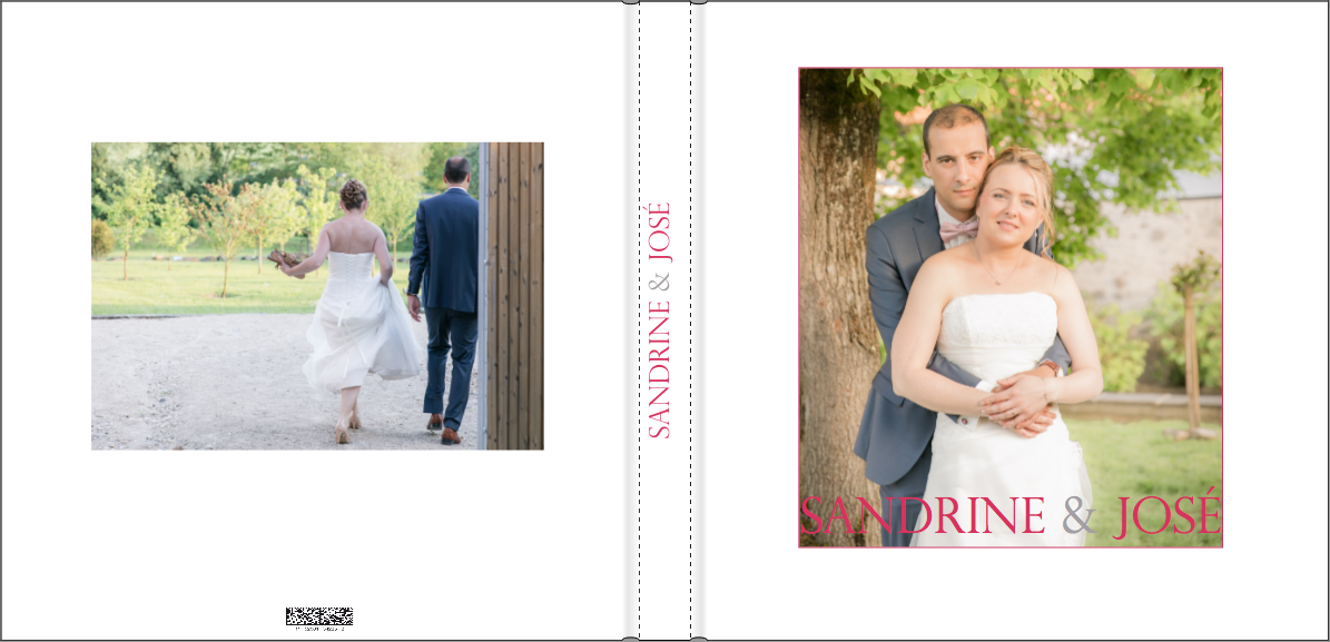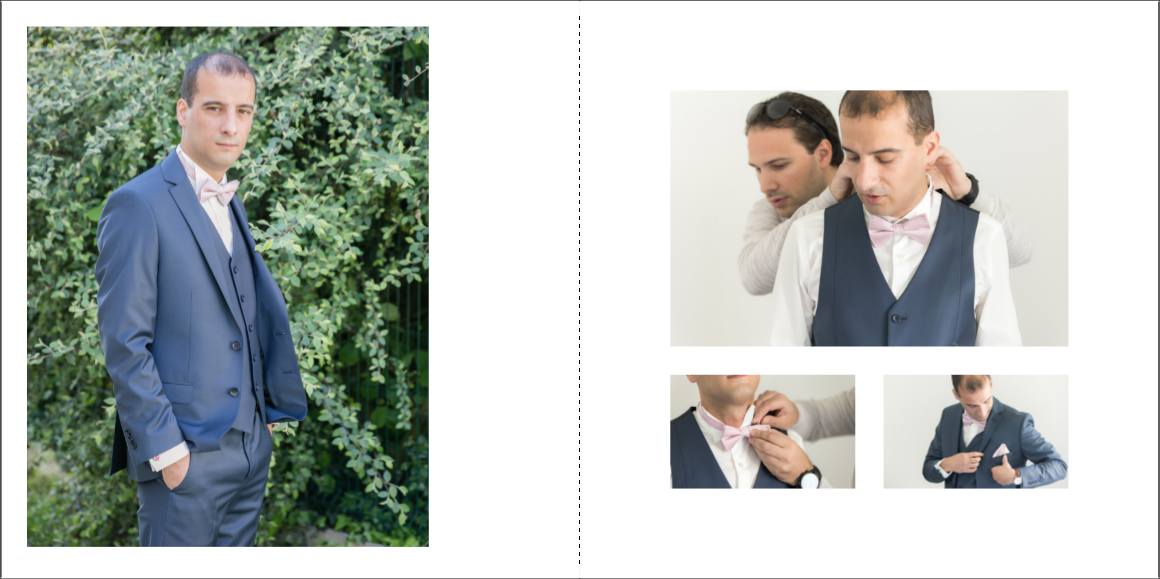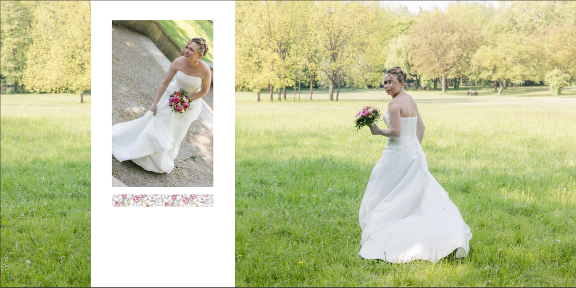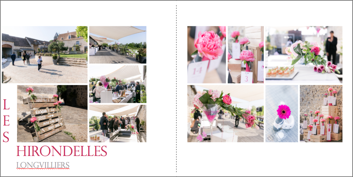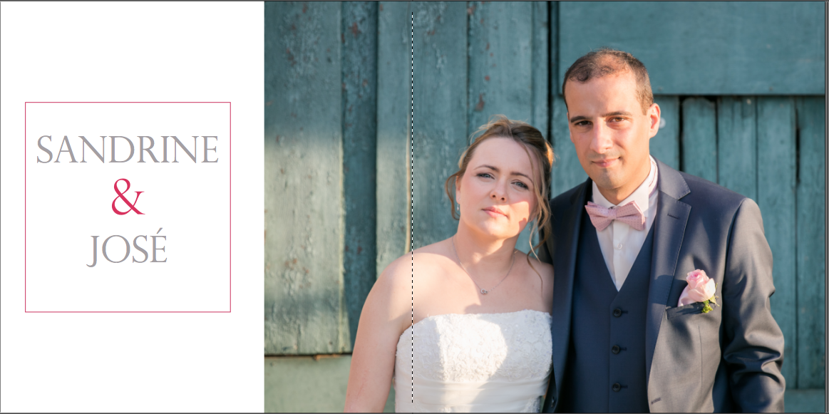 Je prends grand plaisir à composer les pages, en alternant vues d’ensemble, portraits et détails afin de garder un certain rythme. Je propose systématiquement le portrait des mariés, le bouquet, la robe, les parents… mais reste à votre écoute pour la personnalisation des autres pages. La mise en page de tout l’album se fait manuellement exclusivement, à partir des photos que vous aurez choisies.